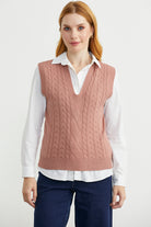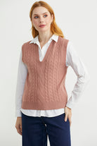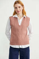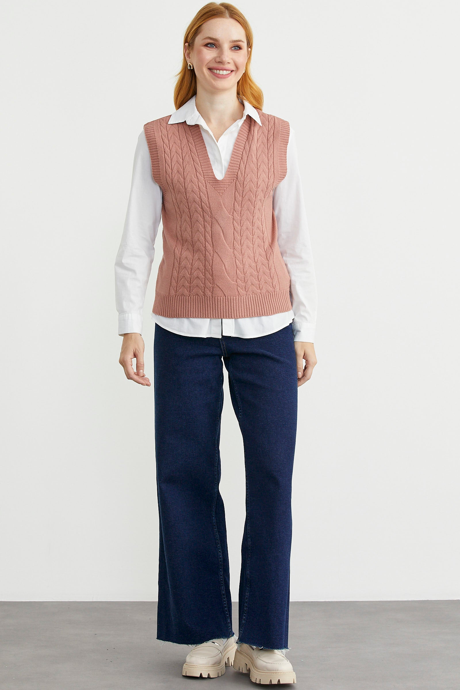 V Yaka kolsuz triko süveter, uyumlu tonda fitilli bitişlere sahip.