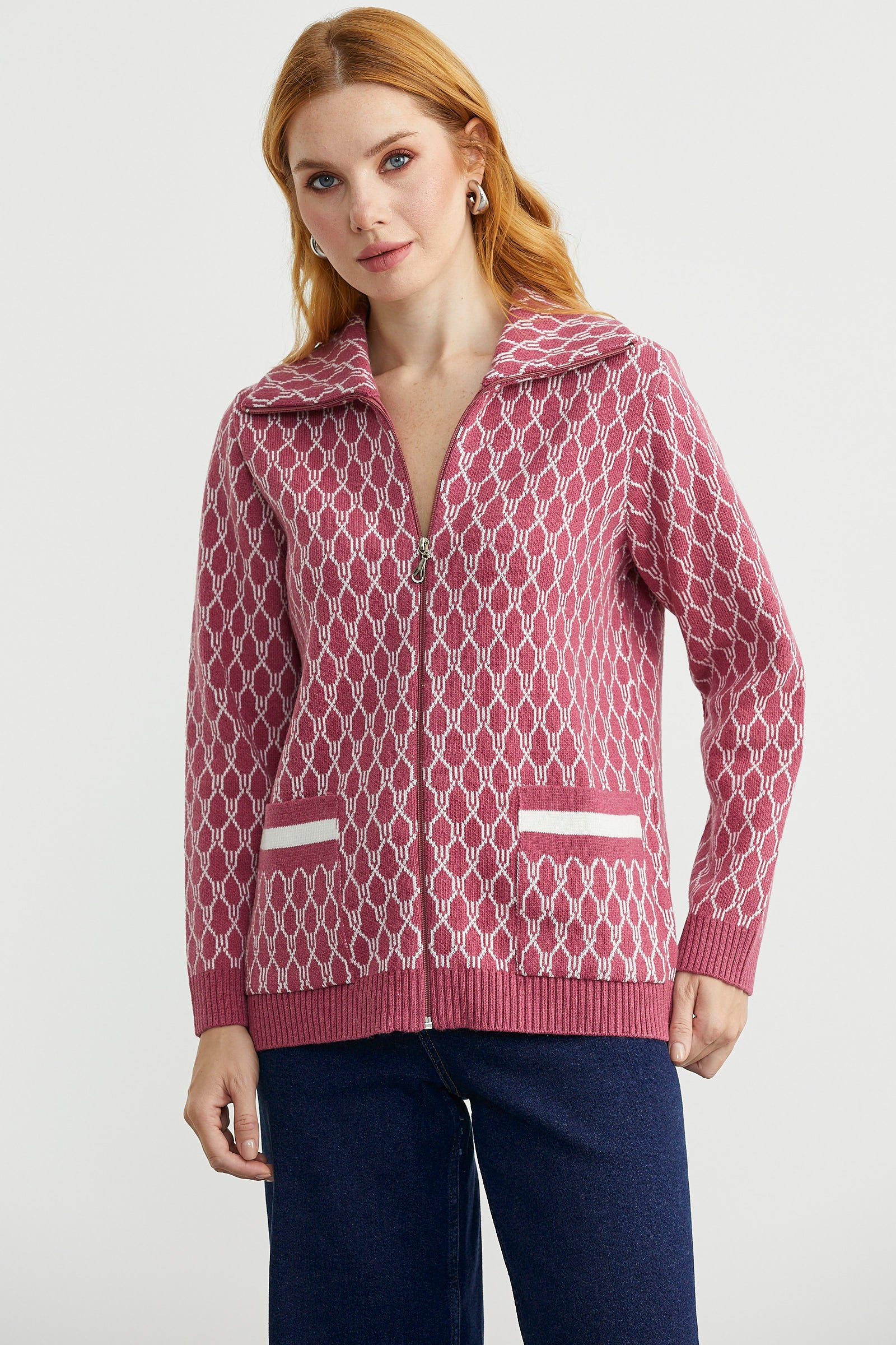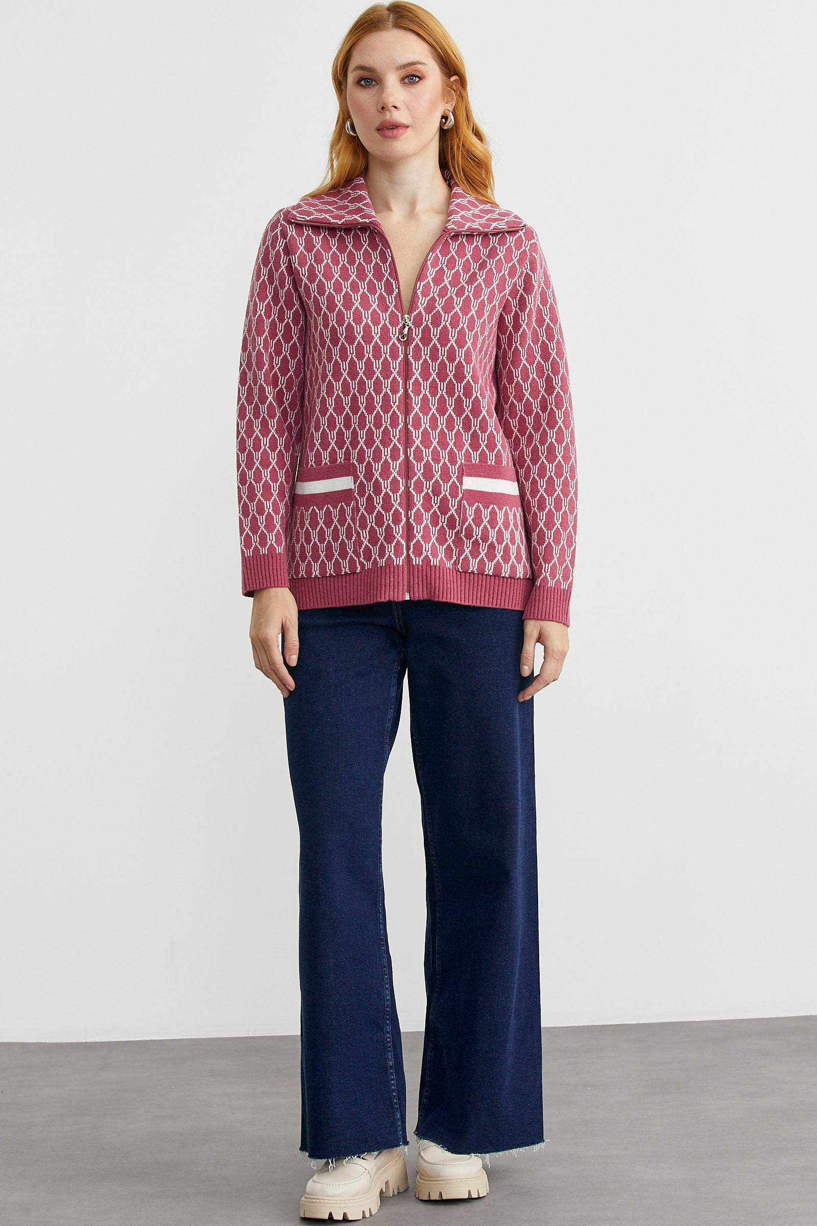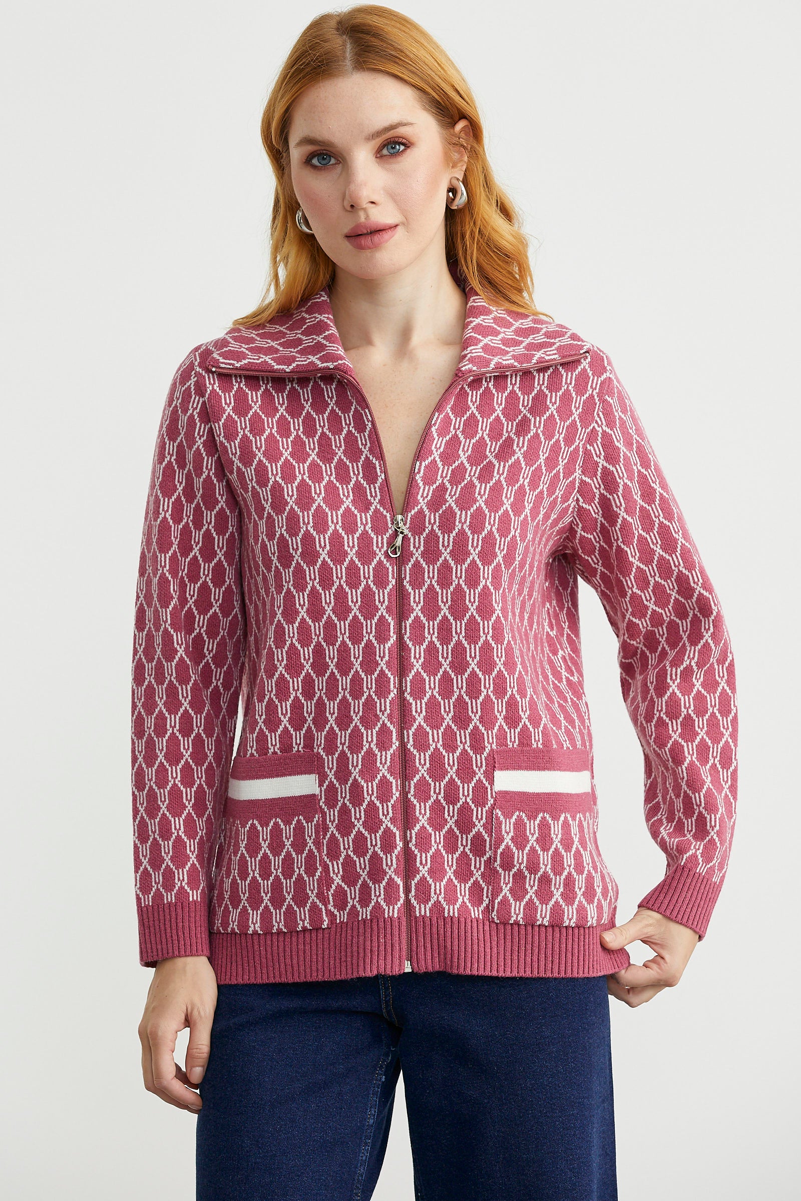 Çift Renk Kalın Yünlü Triko Hırka - Gül