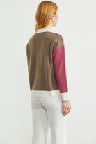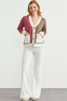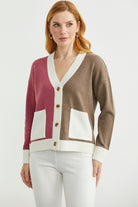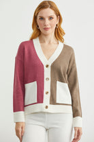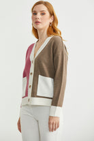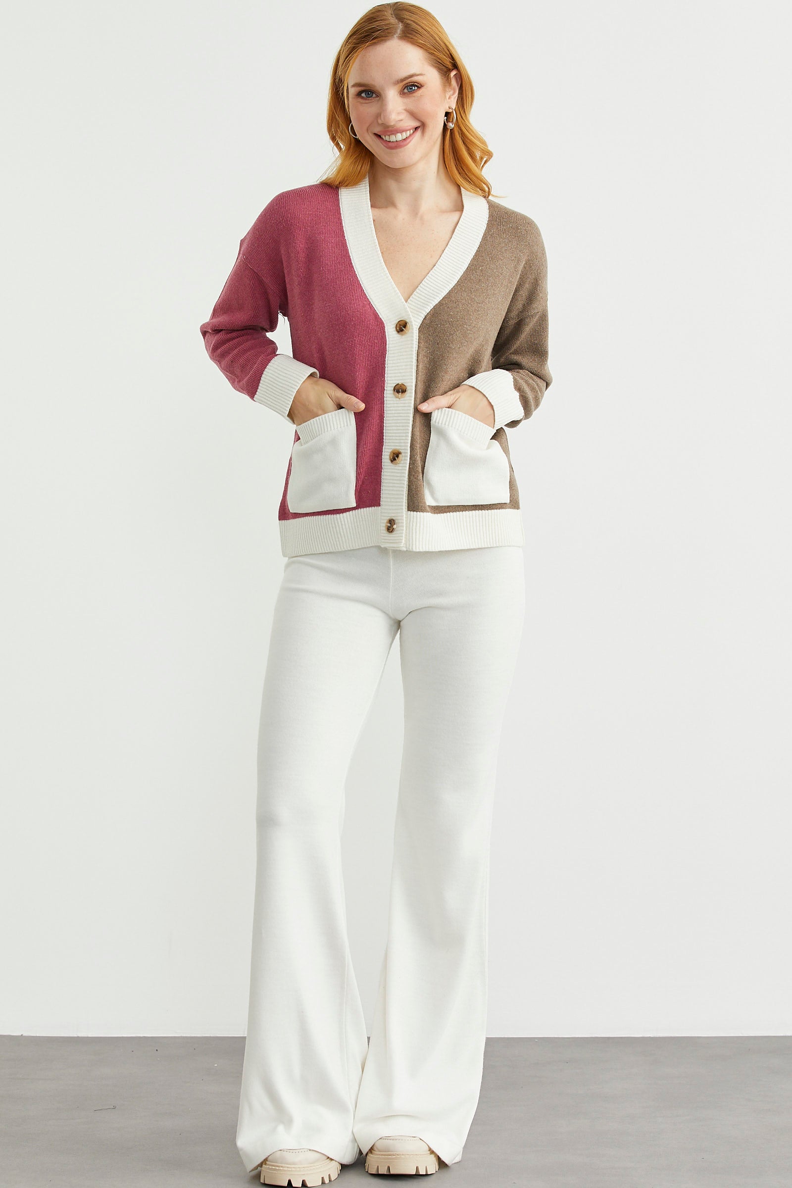 V yakalı, yün oranı yüksek, yumuşak triko hırka. Düşük omuzlu, bol kesimli, cepli. Renk kombinlidir.