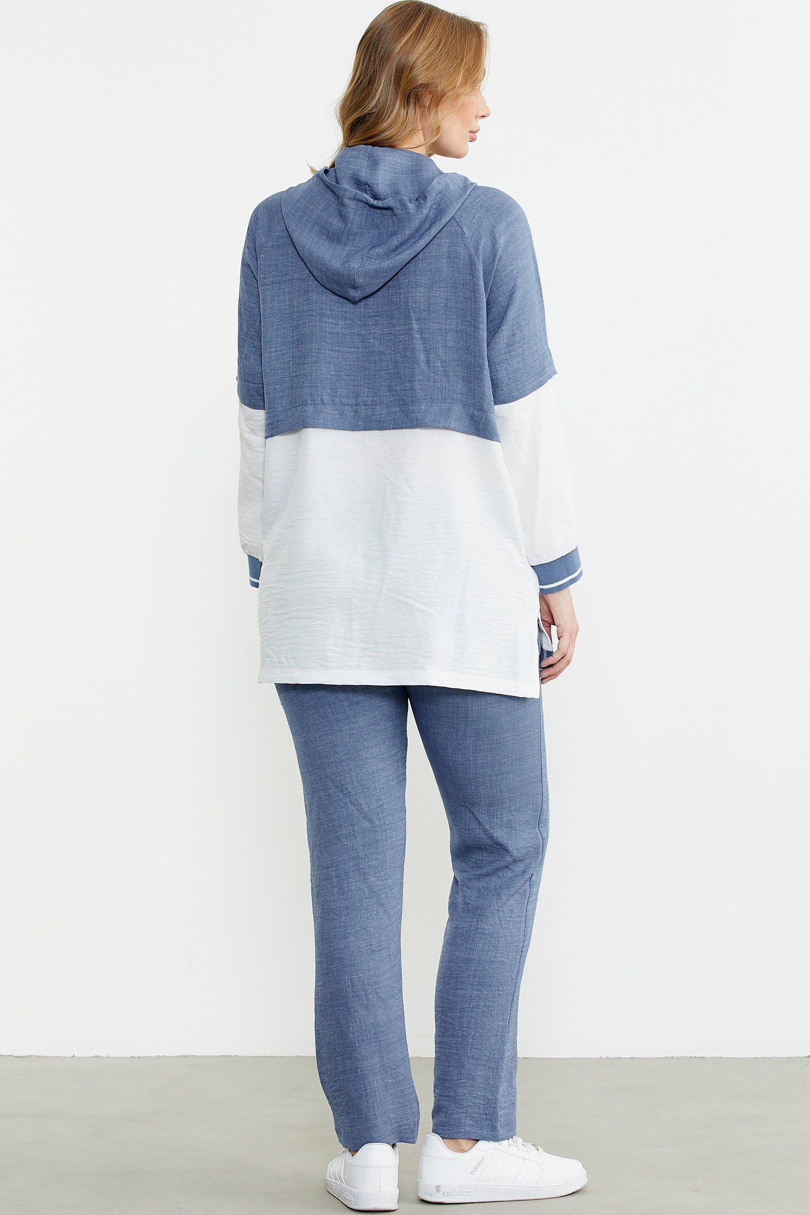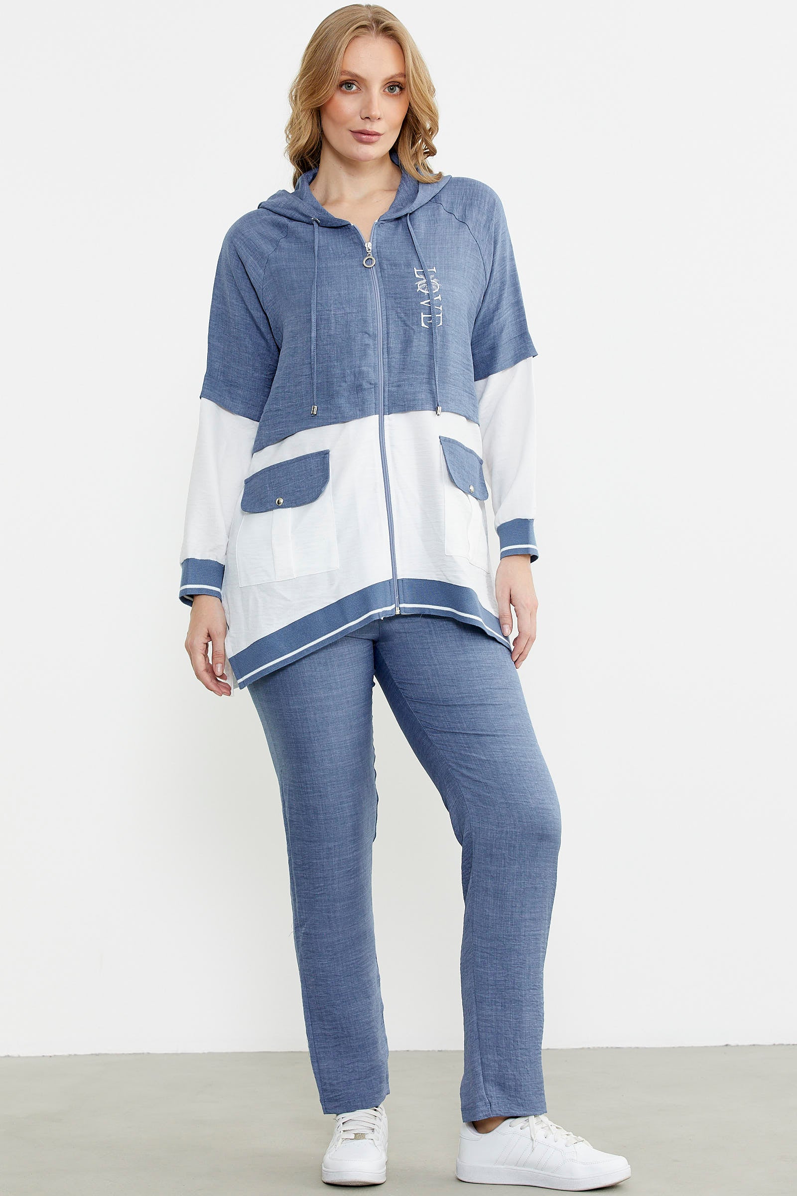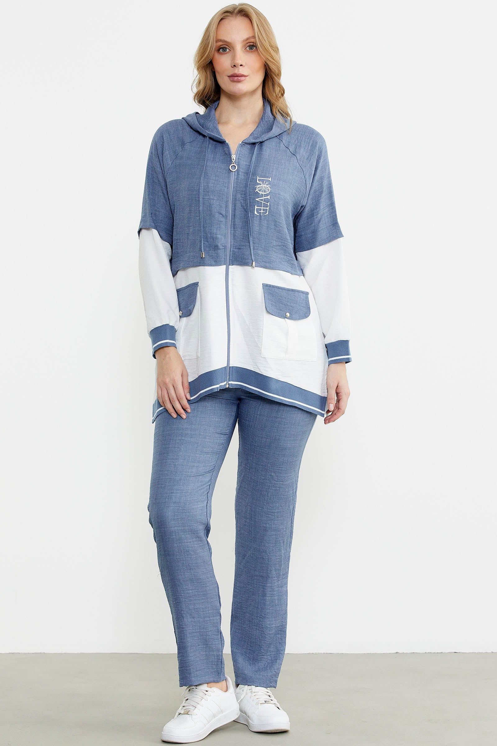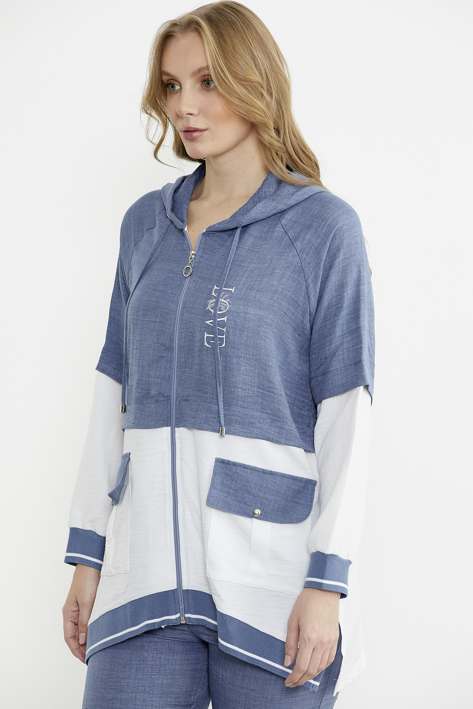 Loose cut, long back linen look suit. Hooded, zippered and pocket detailed. Hem and cuffs are knitted.