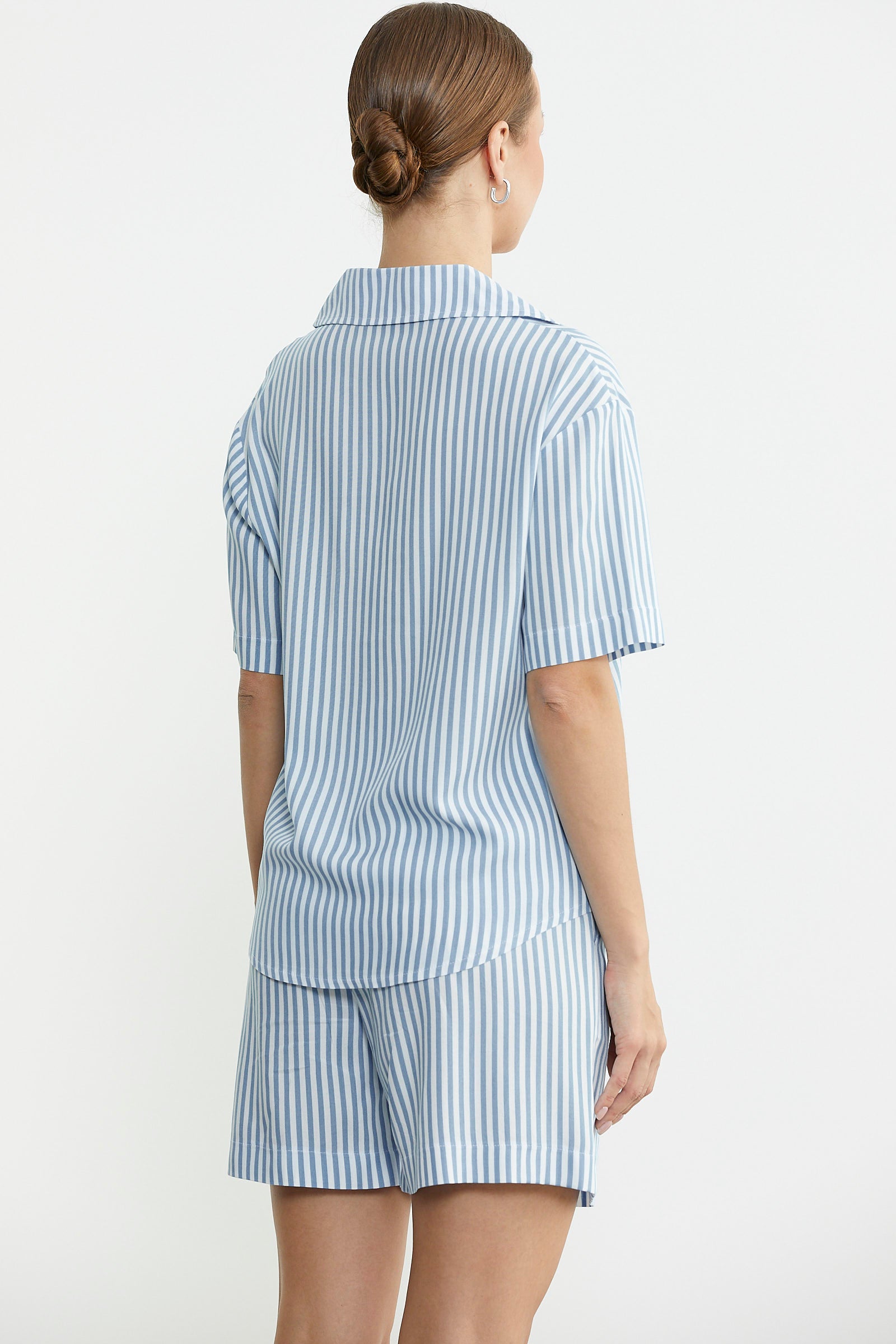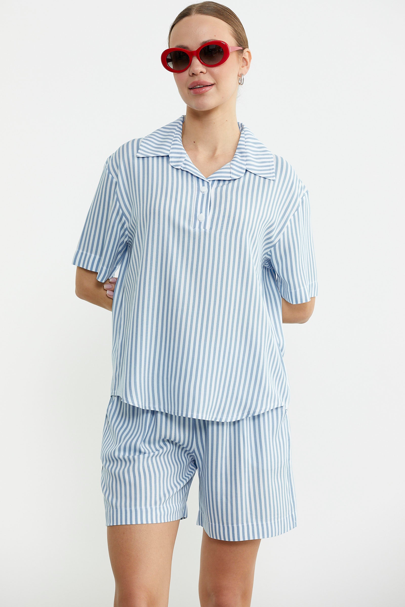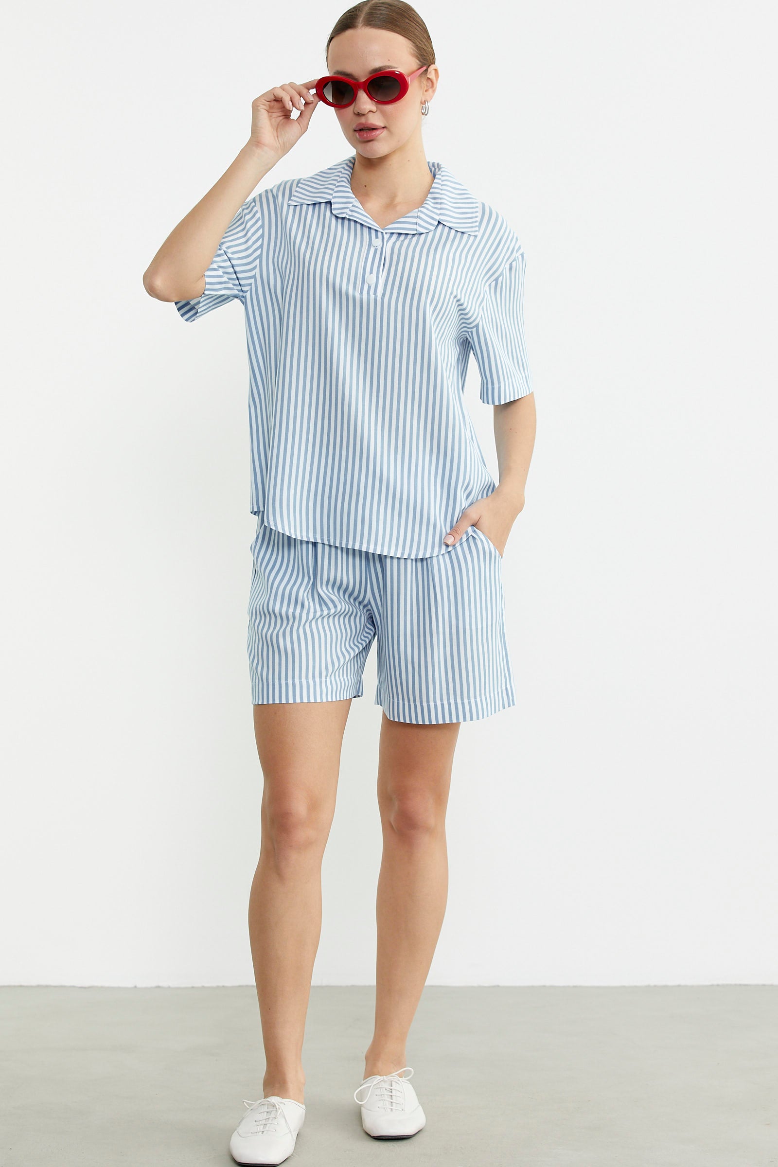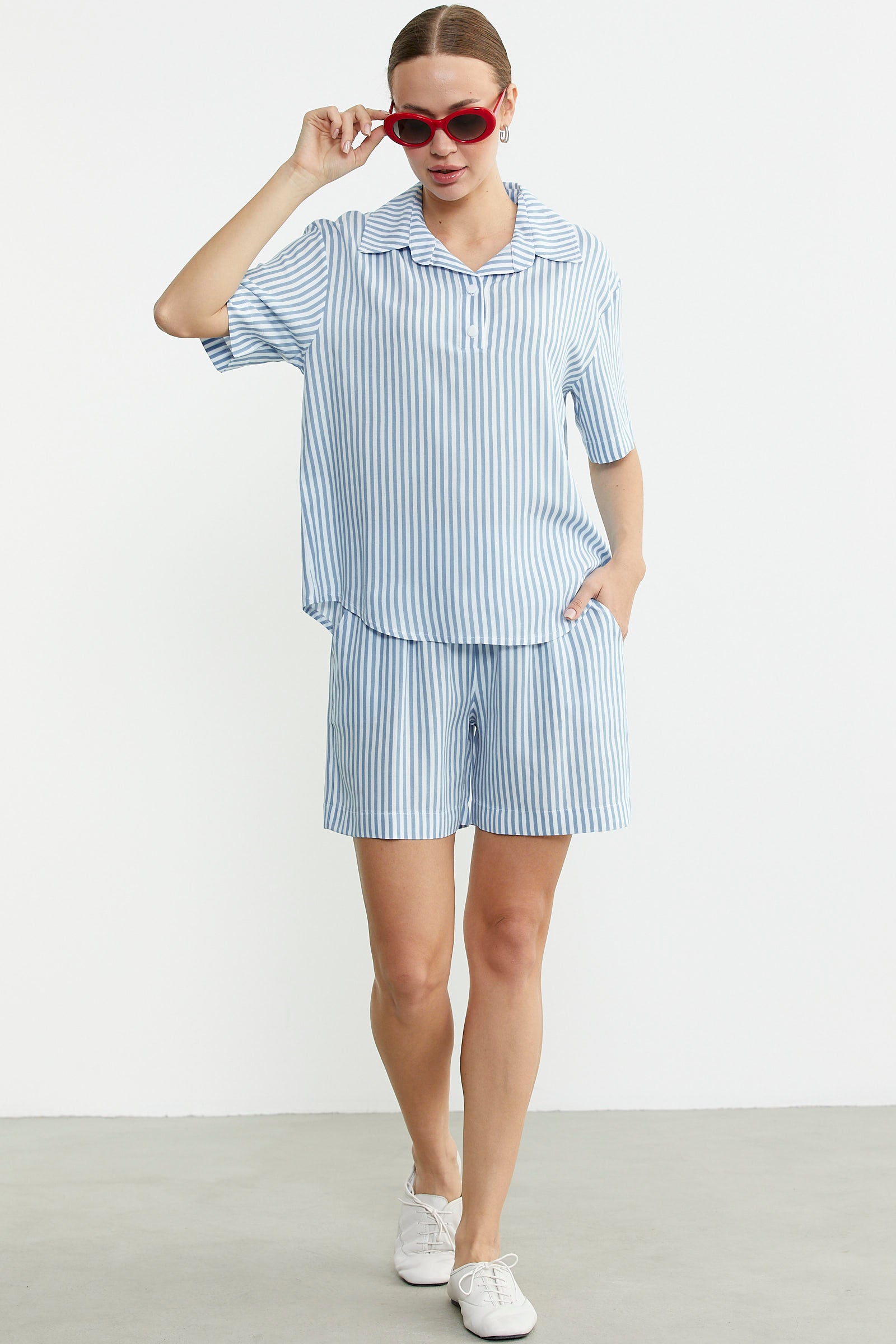 Polo yaka çizgili üst yine çizgili şortla takım üretilmiştir. Rahat ve konforlu kullanım sağlar.