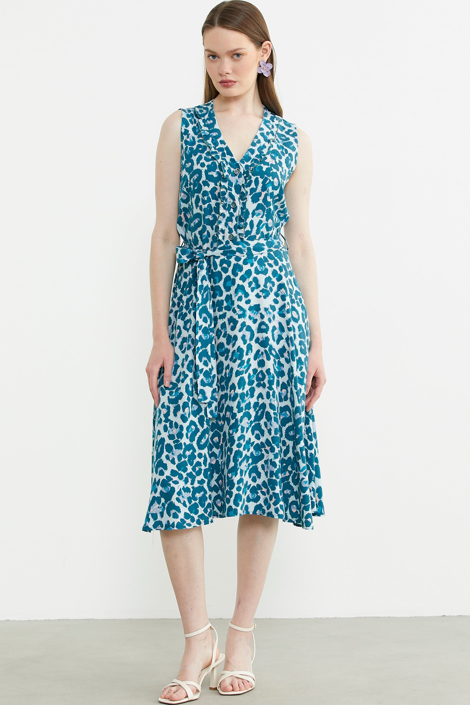 Leopar desenli kumaştan yapılmış midi boy elbise, gündüz şıklığından gece davetlerine kadar her ortamda şık görünmenizi sağlar.