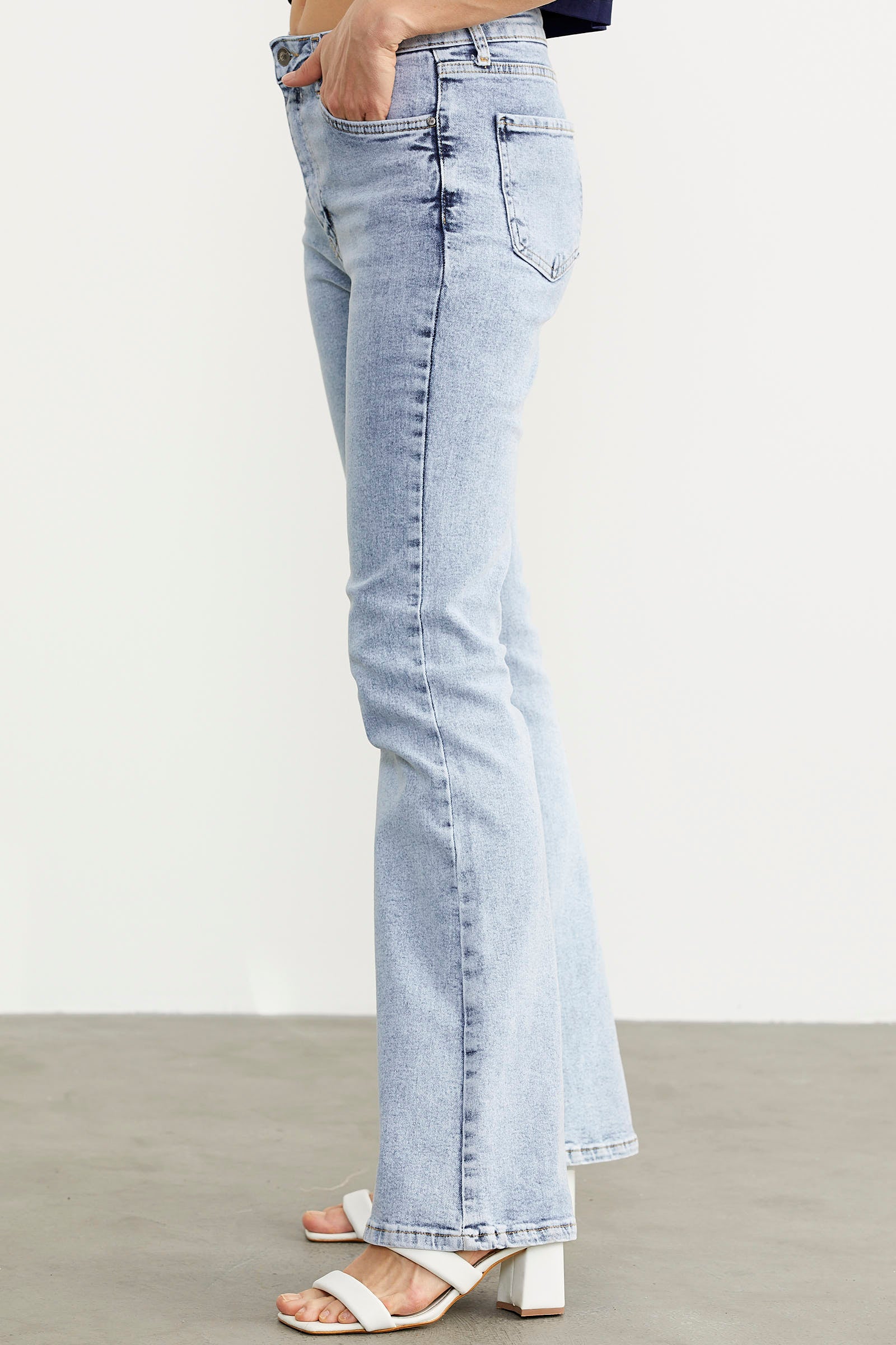 High waisted bell-bottom jeans with an antique wash finish integrate perfectly with the body, making us look longer and slimmer.