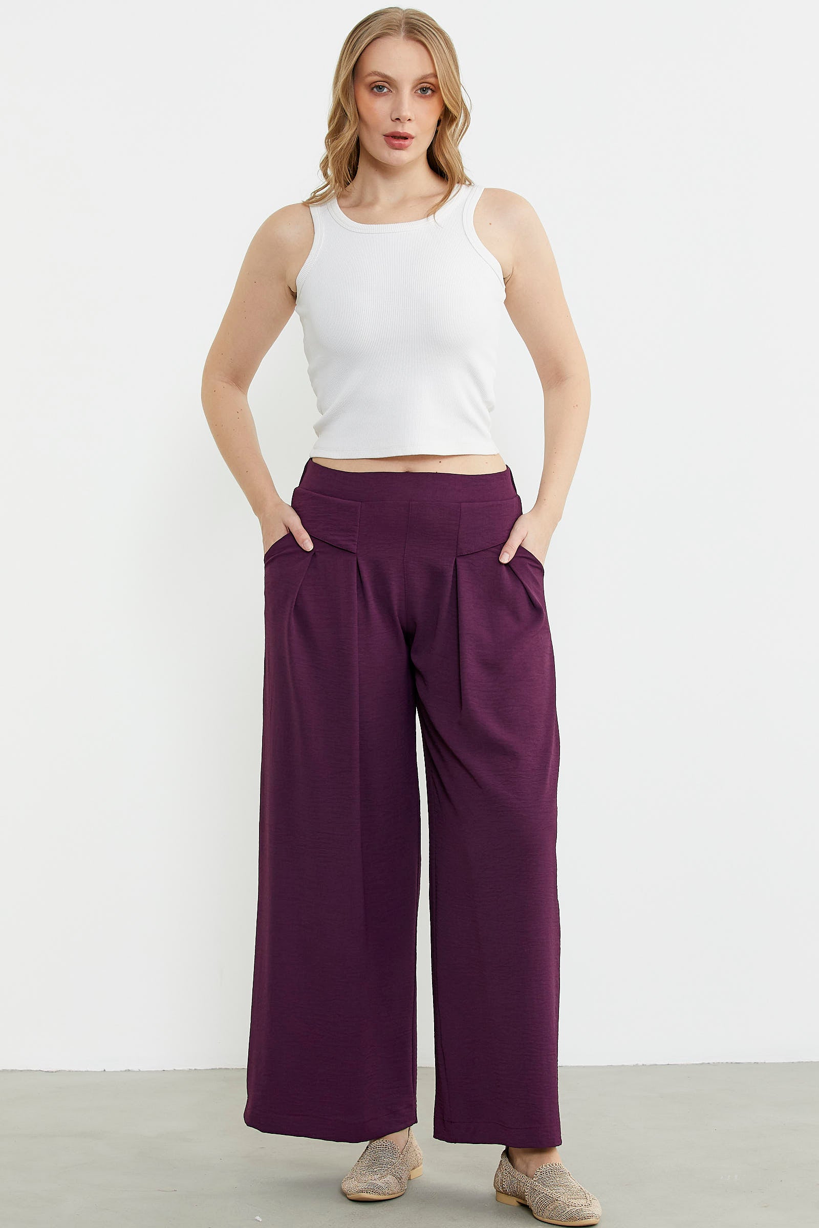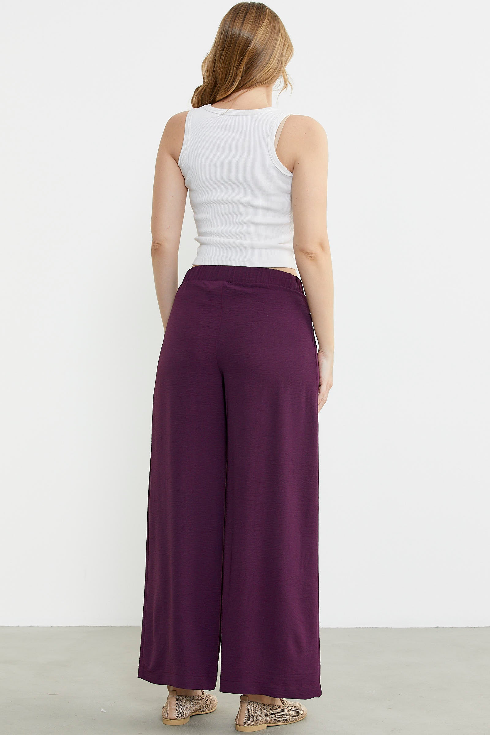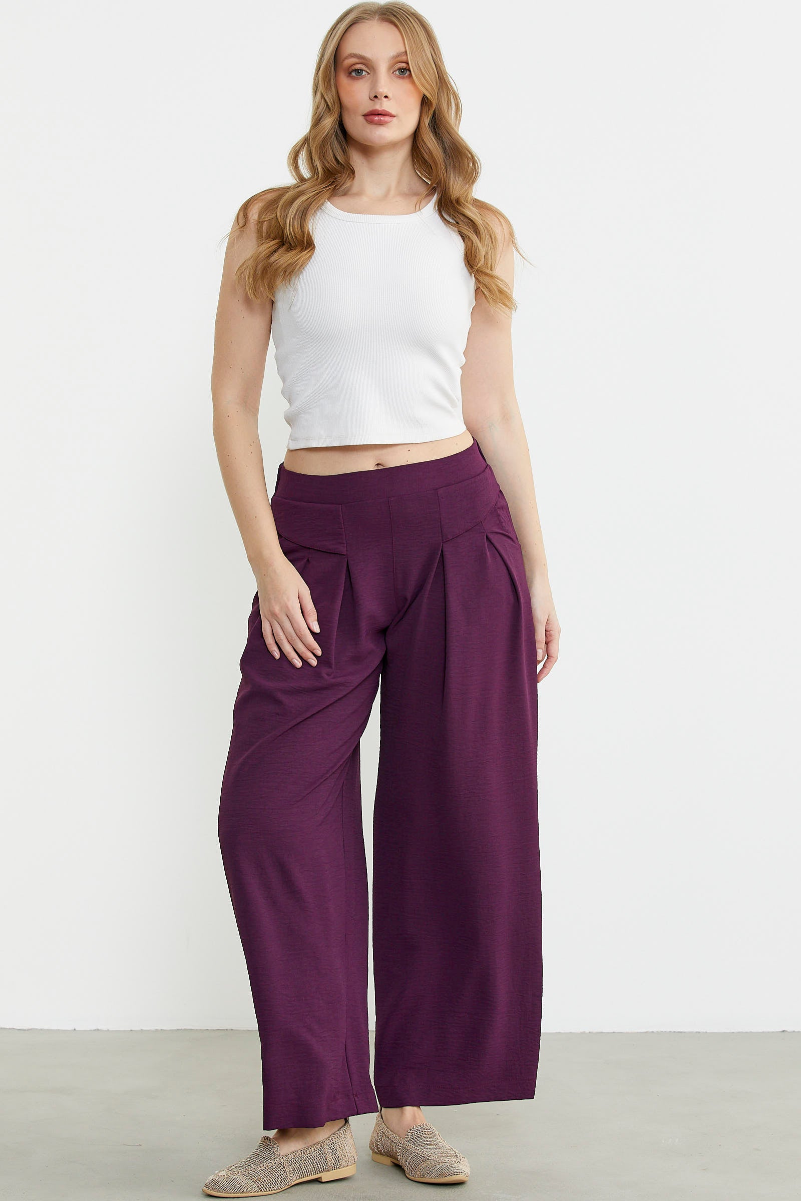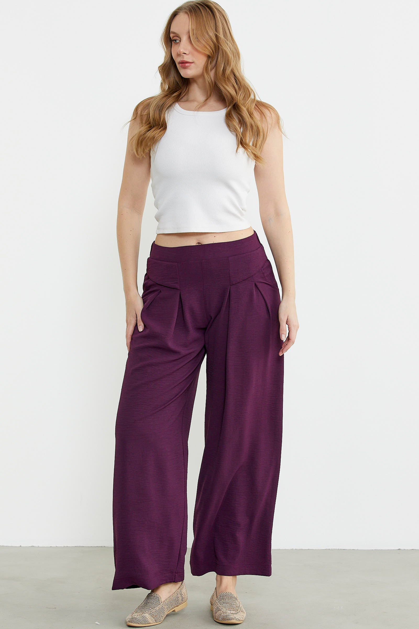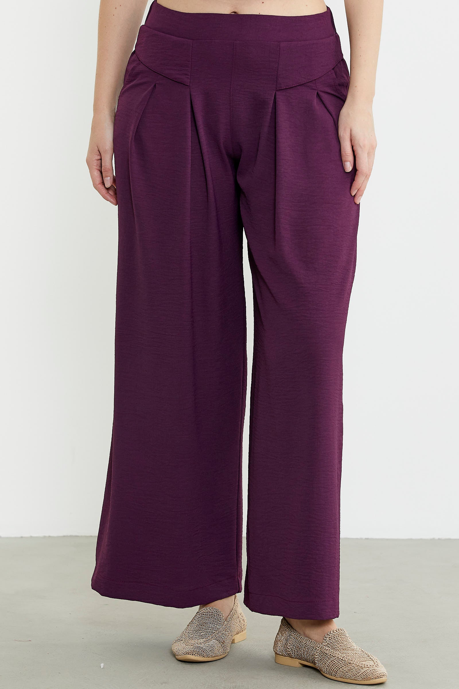 The loose cut crepe trousers have a flounced detail on the front waist. They are designed with pockets and a comfortable fit.
