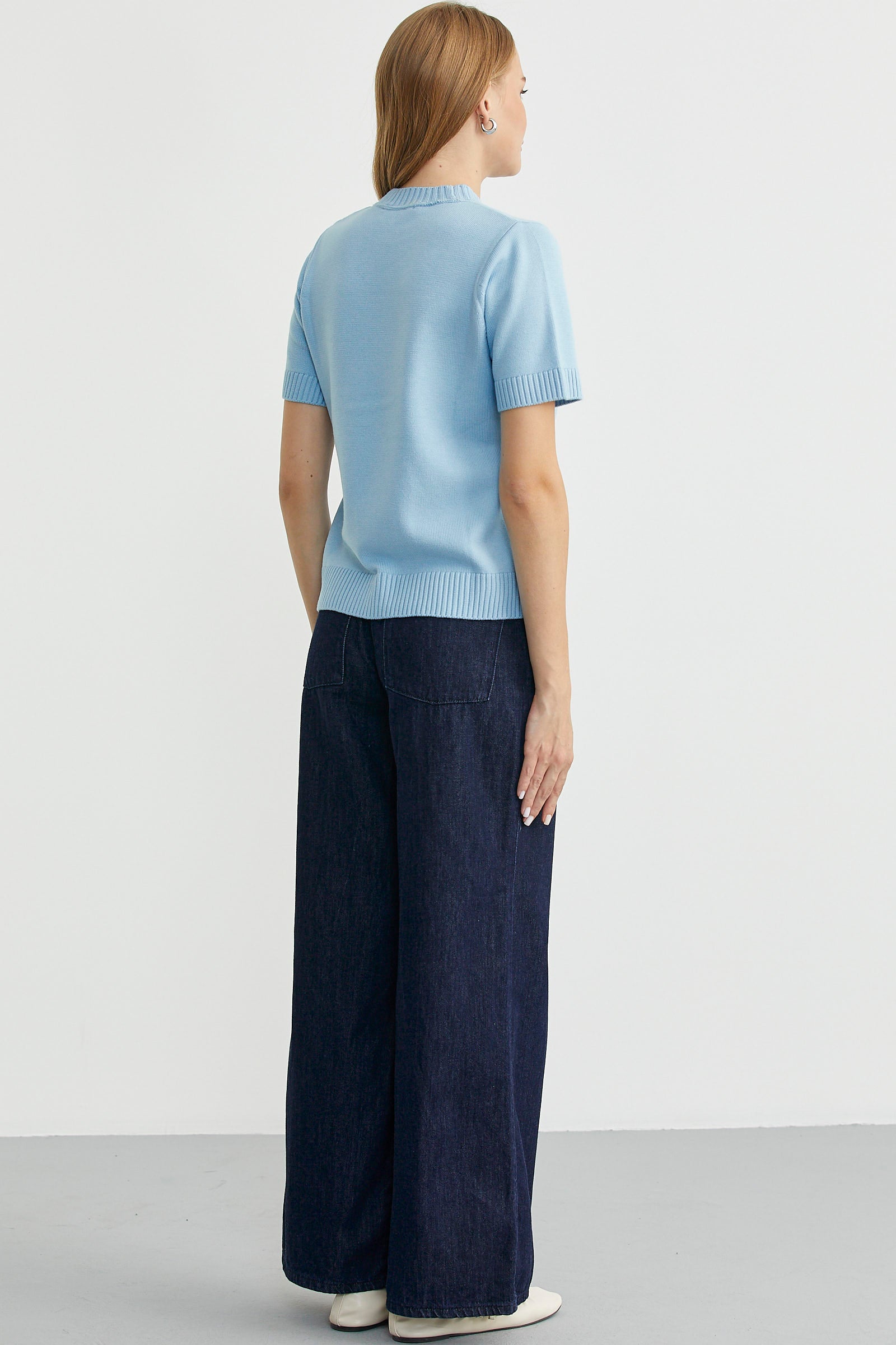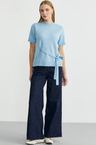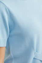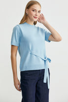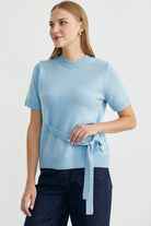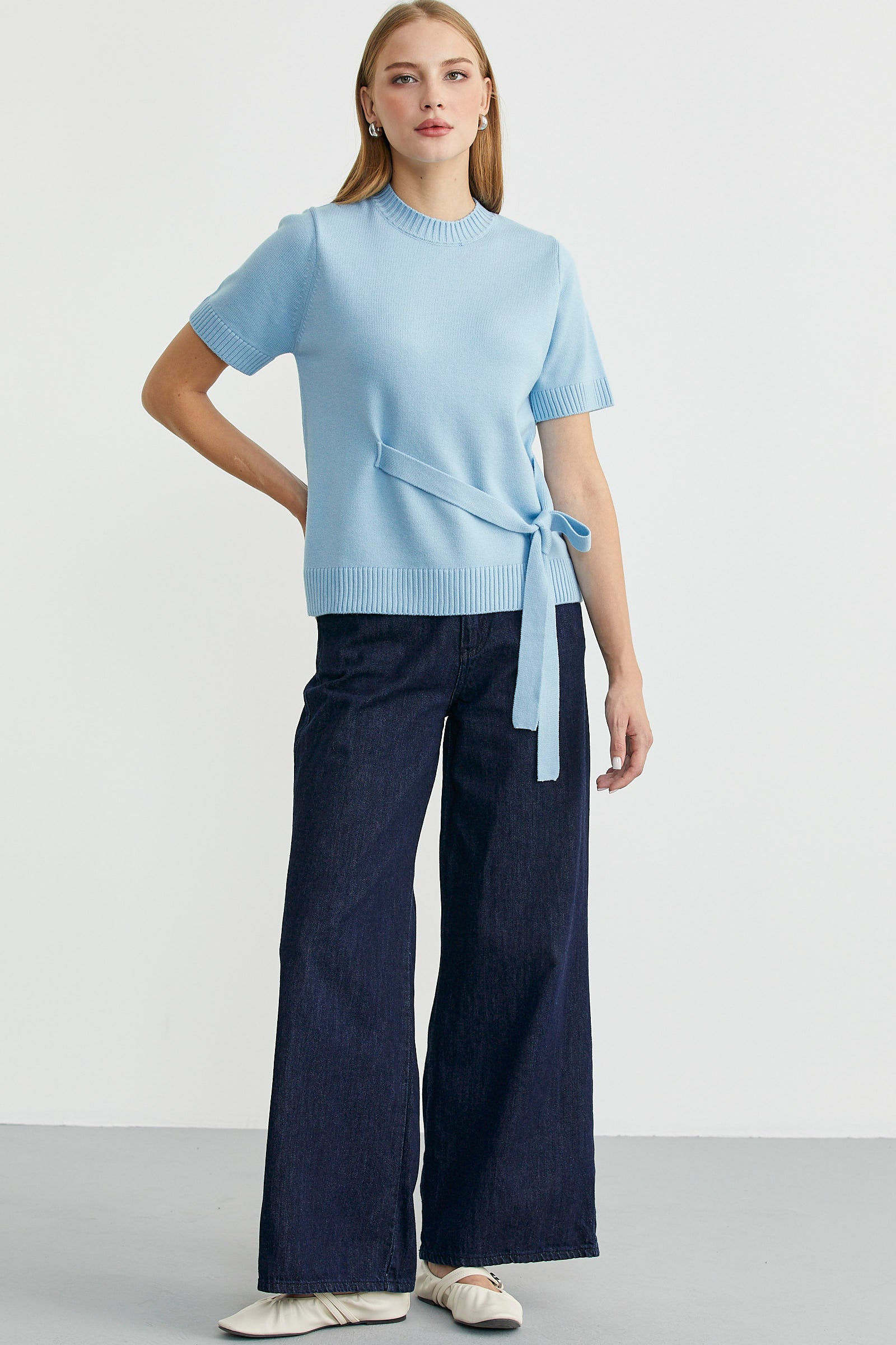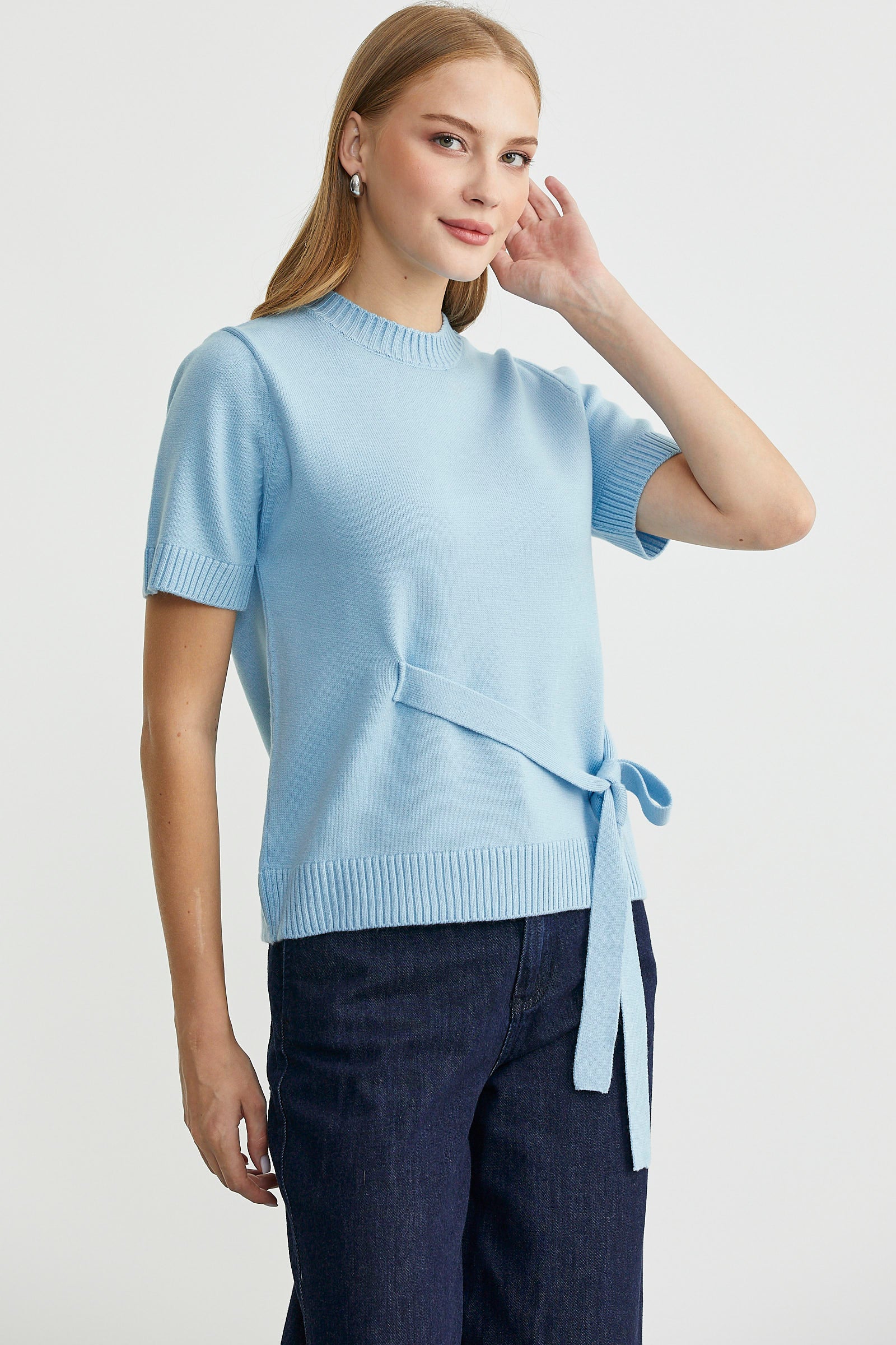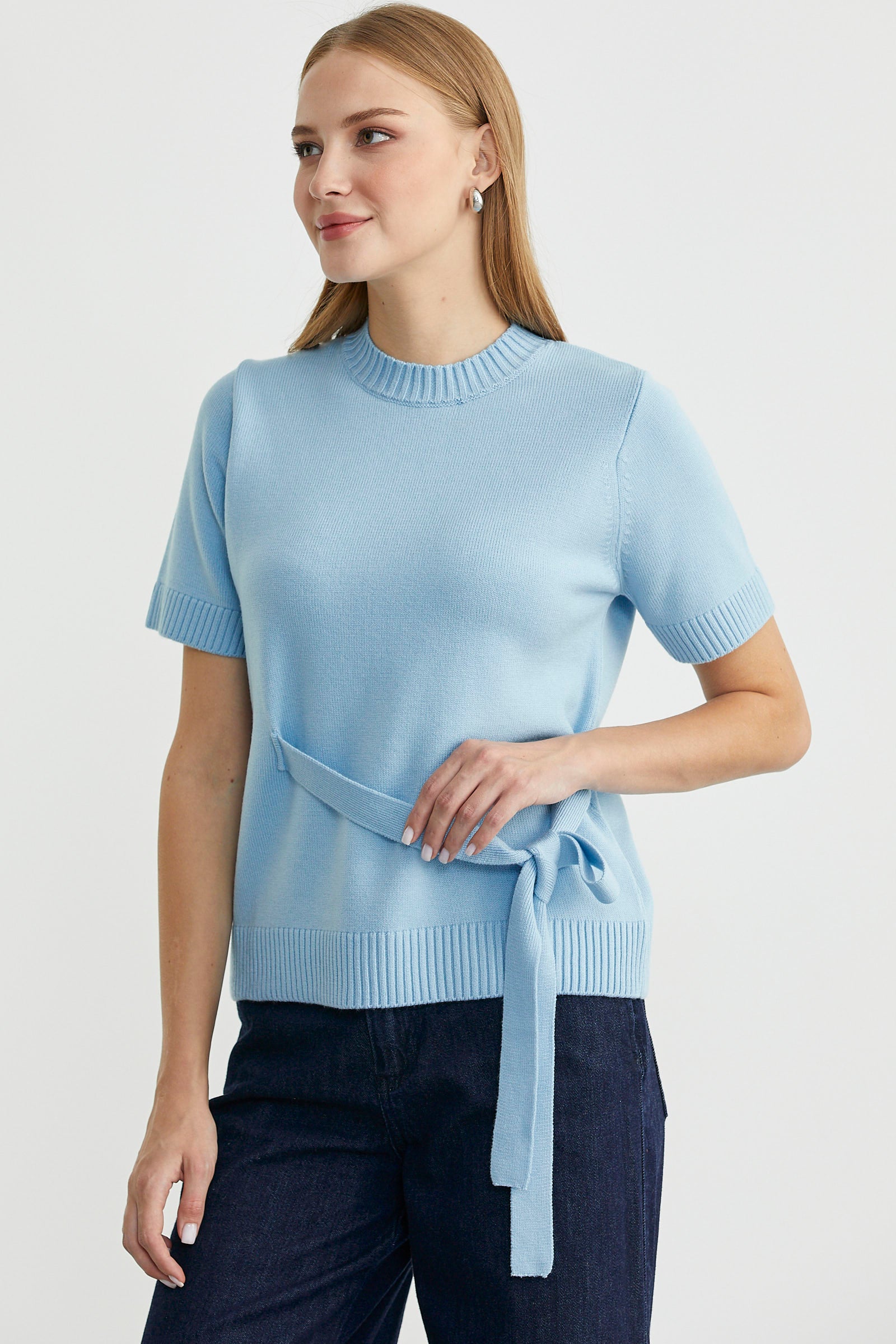 Kuşaklı Kısa Kol Triko Kazak - Mavi