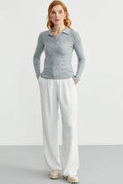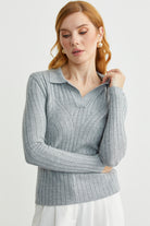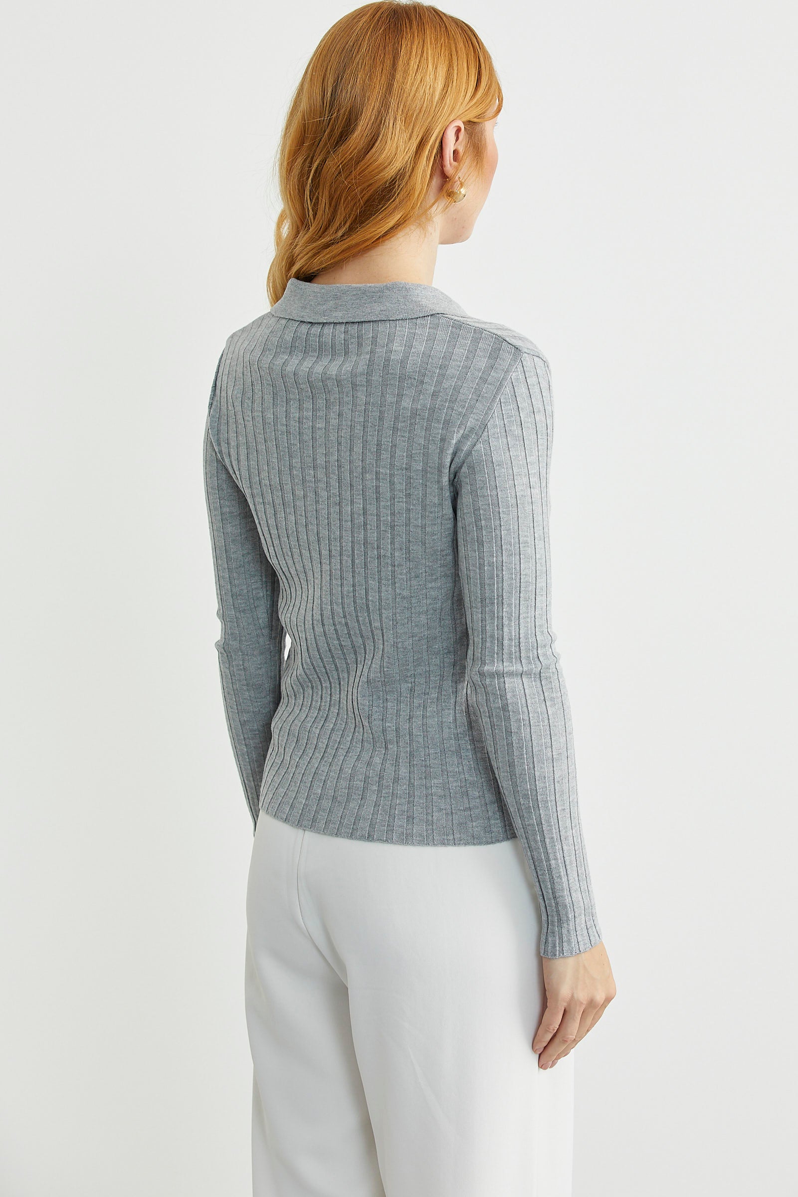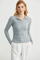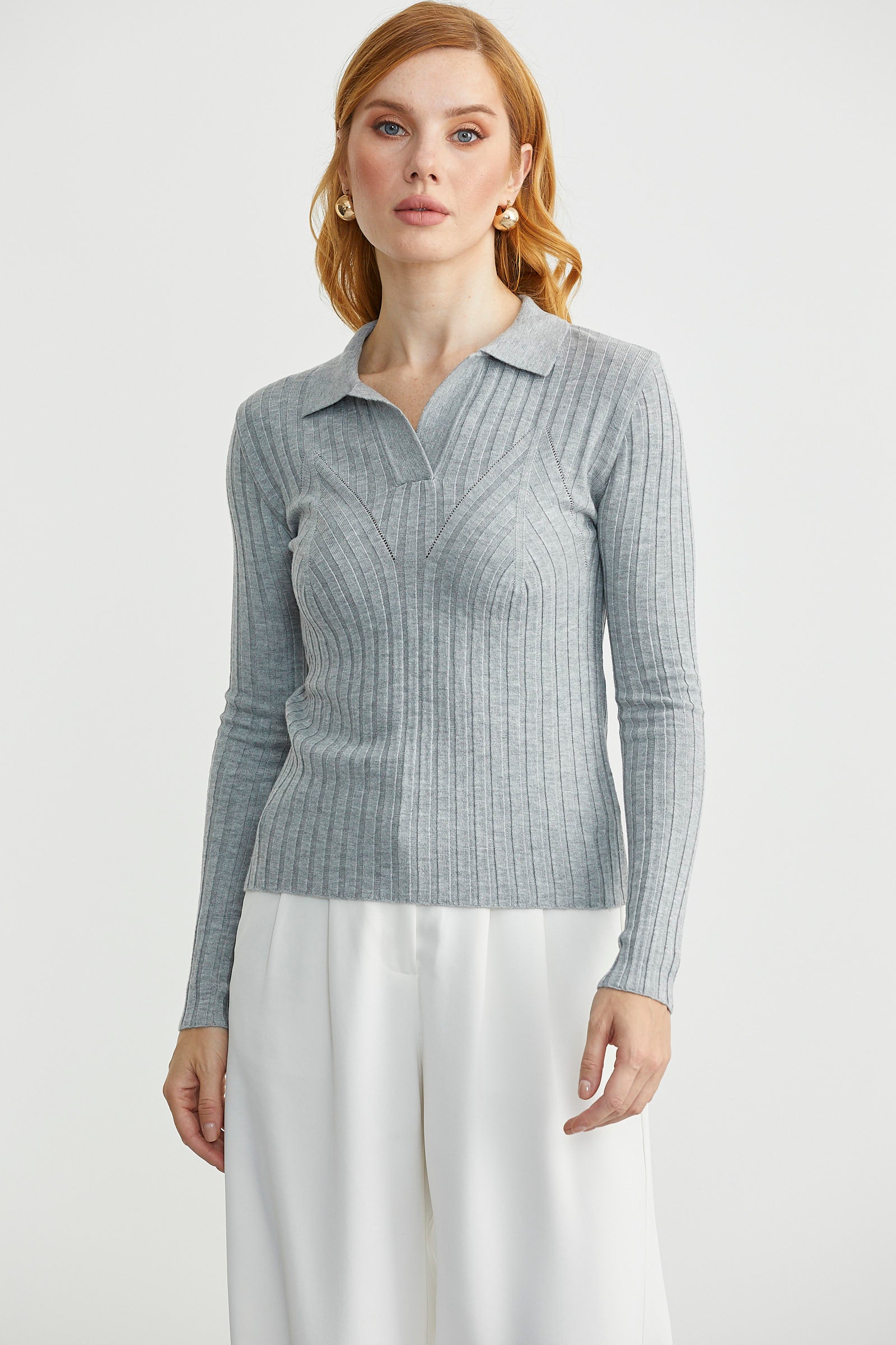 İnce triko polo yaka kazak. Fitilli vücudu saran modeldir.