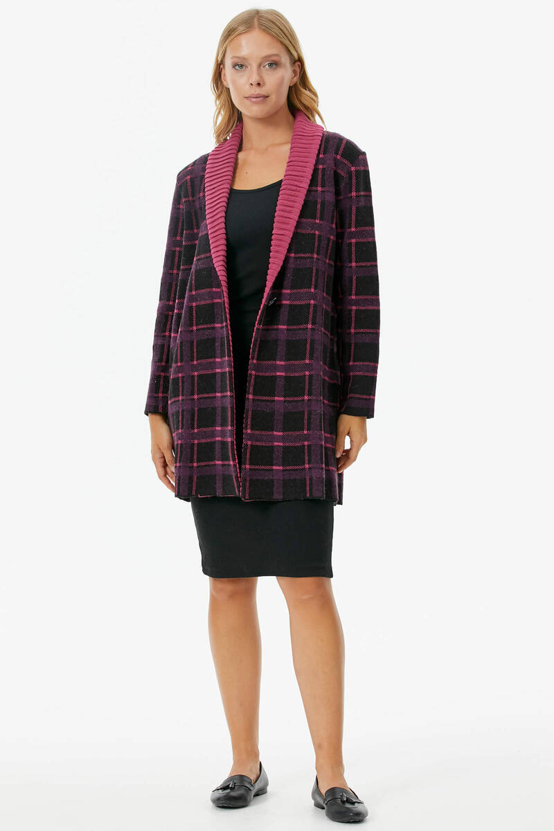Checked, buttoned, knitwear jacket offers an elegant look with its shawl collar detail.