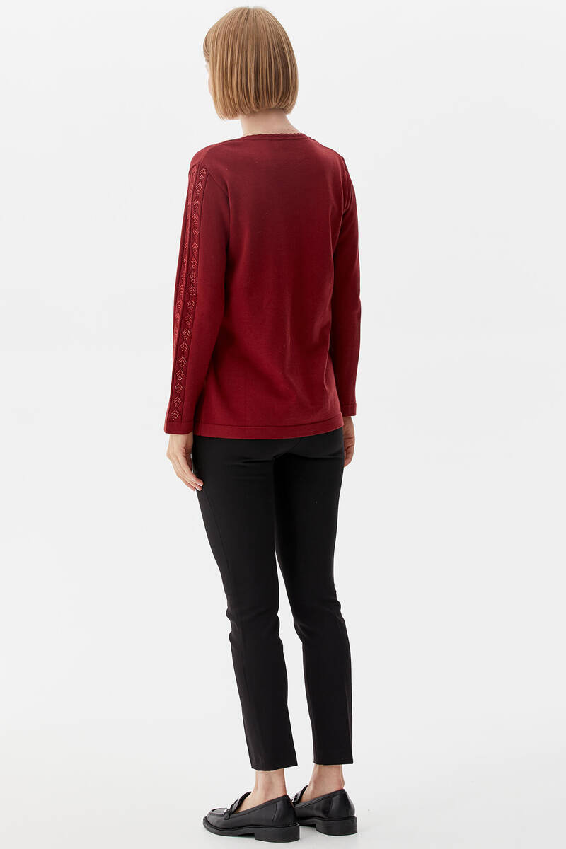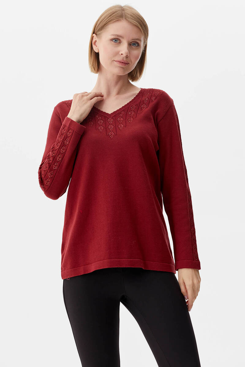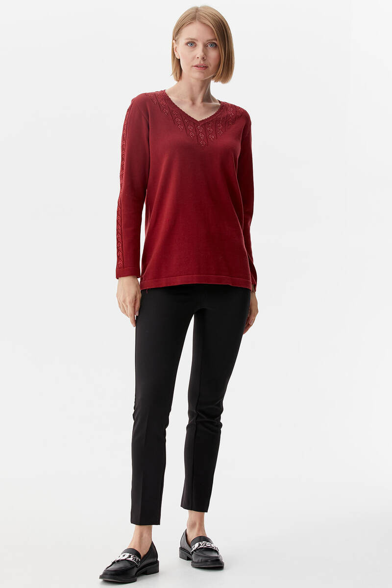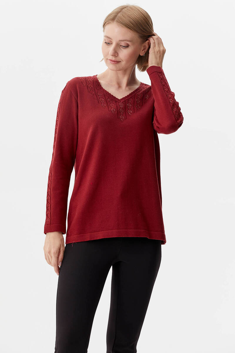 V Neck Stone Knitwear Sweater - Claret Red