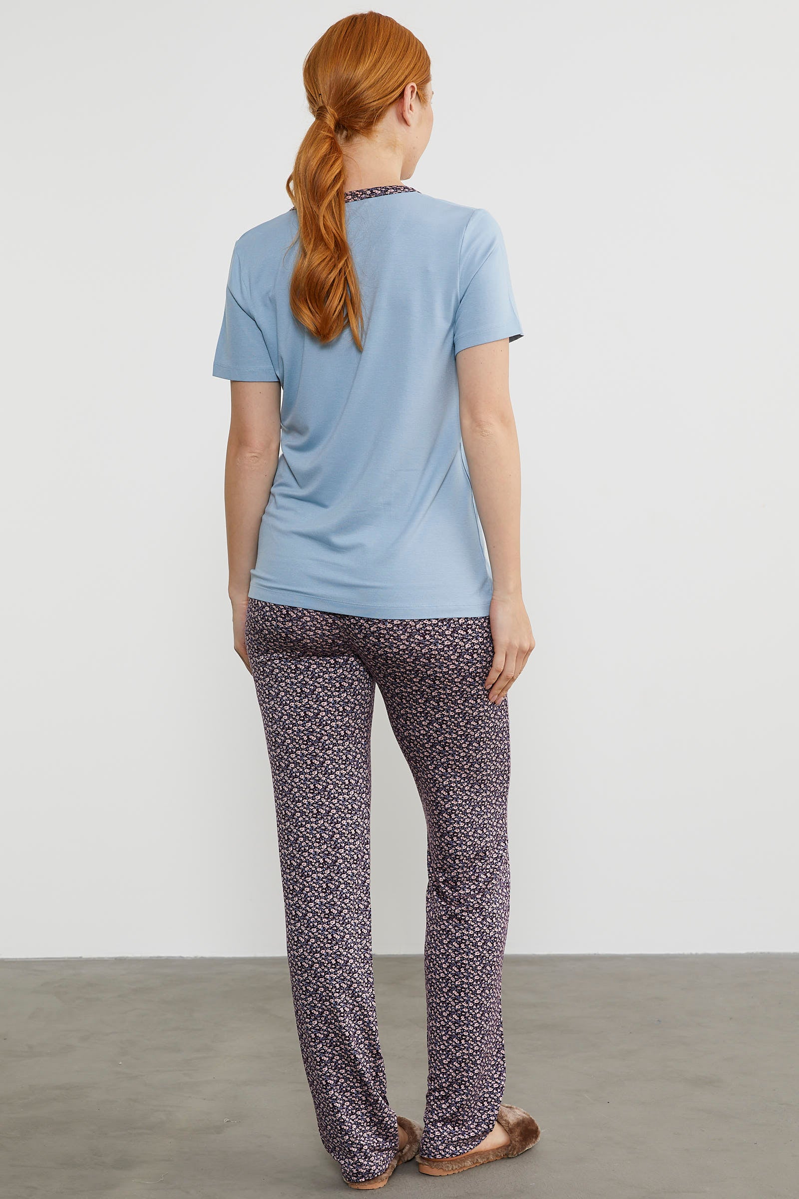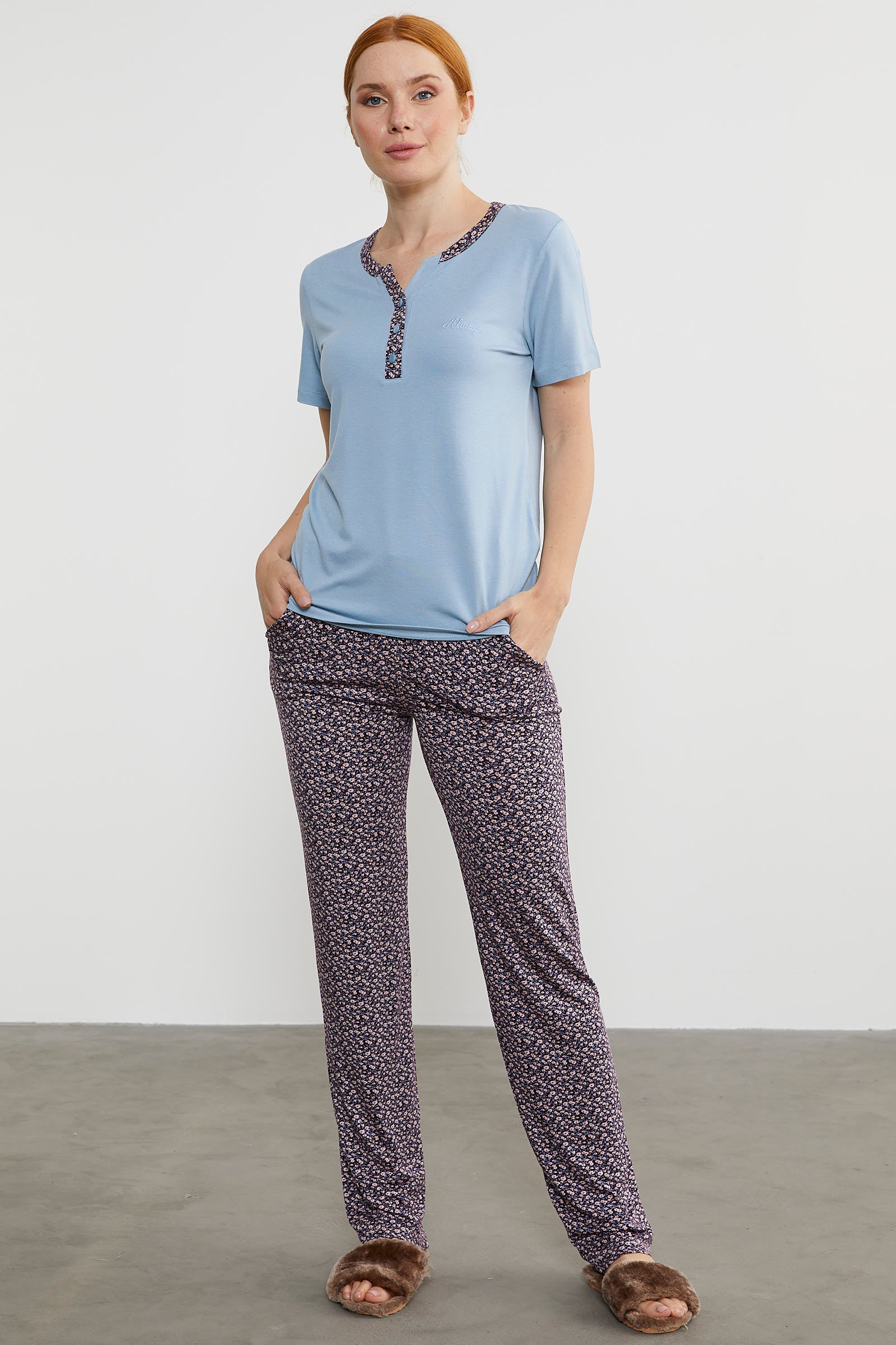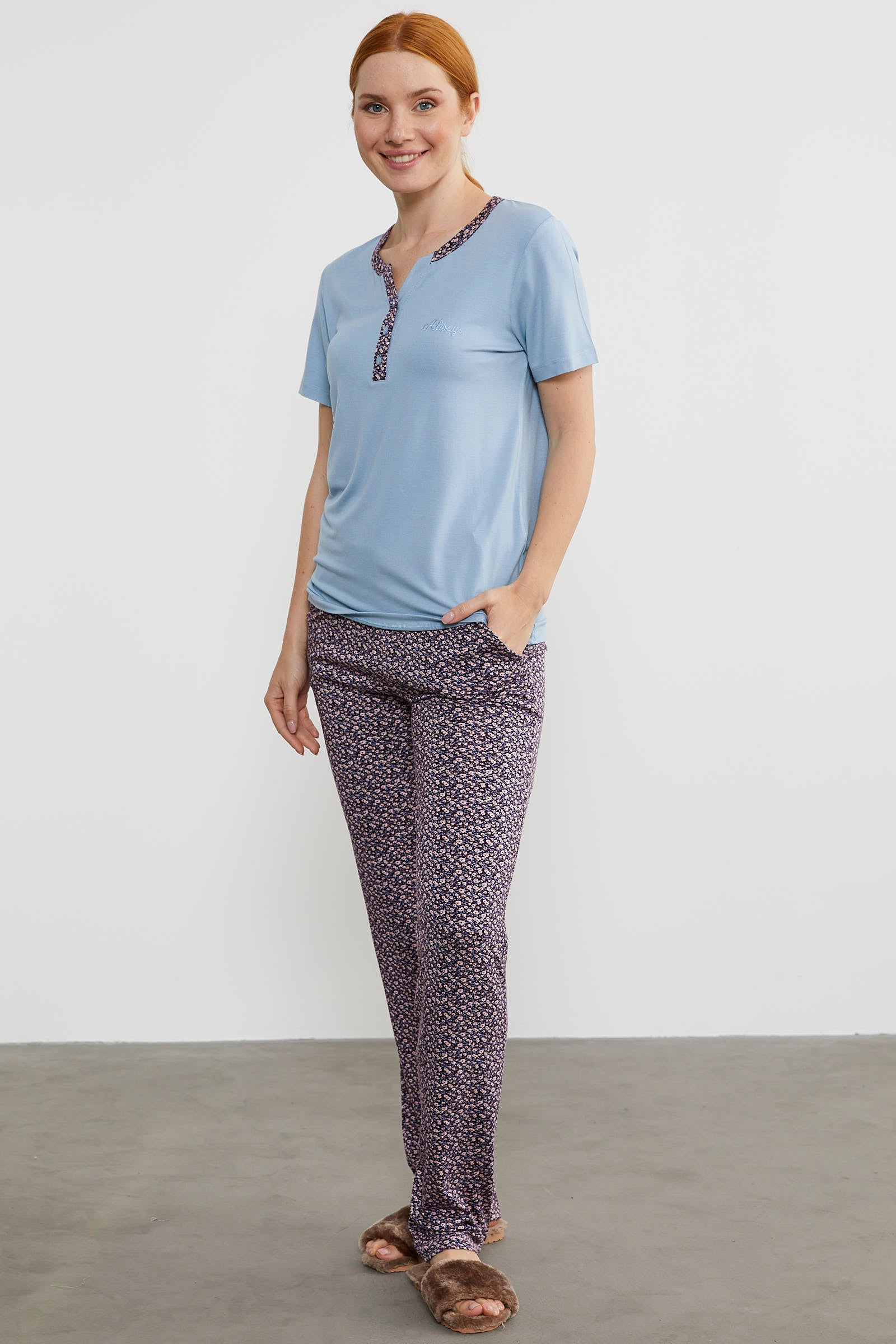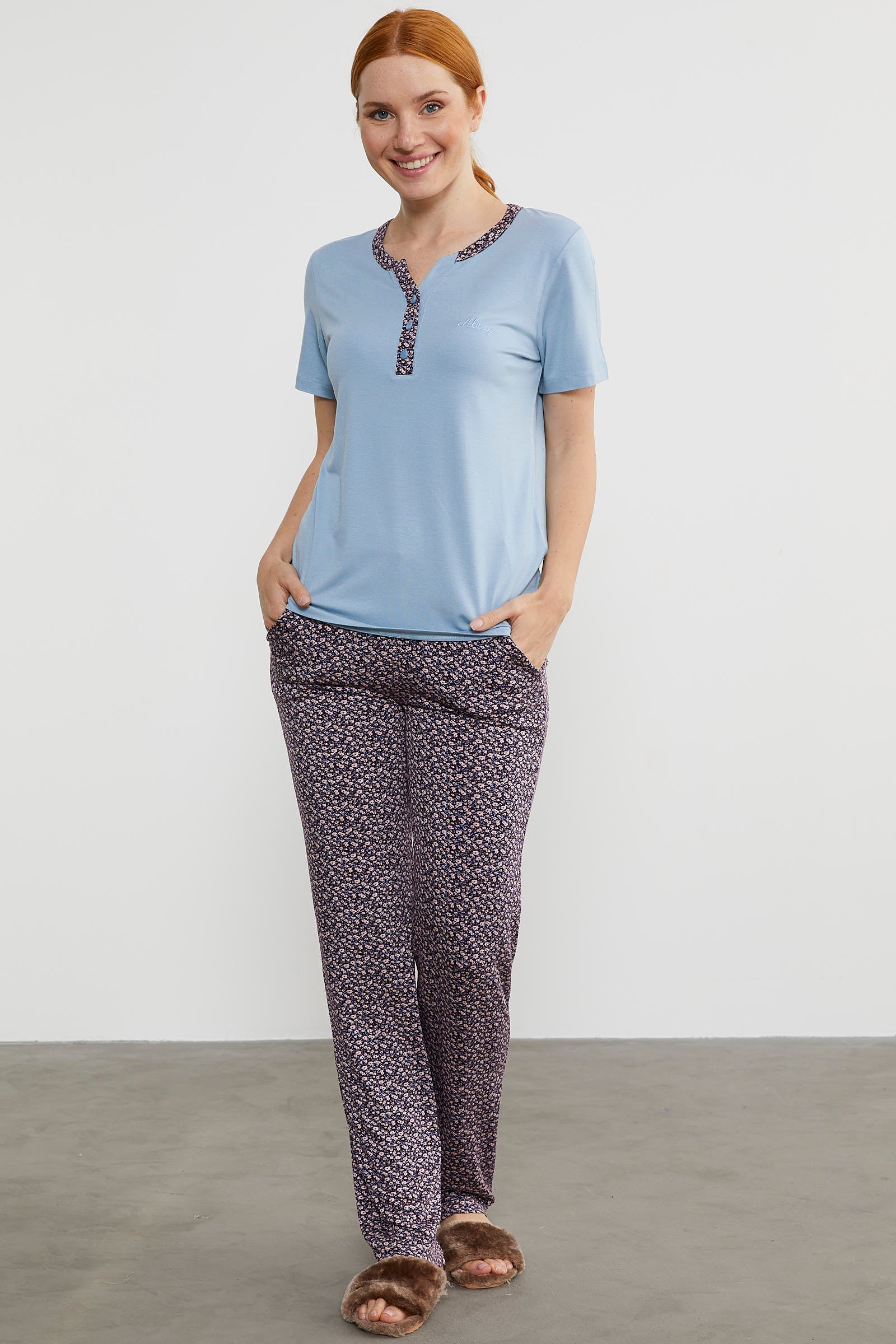 We invite you to comfort in homewear style with a button-down collar top and patterned pajama bottoms.