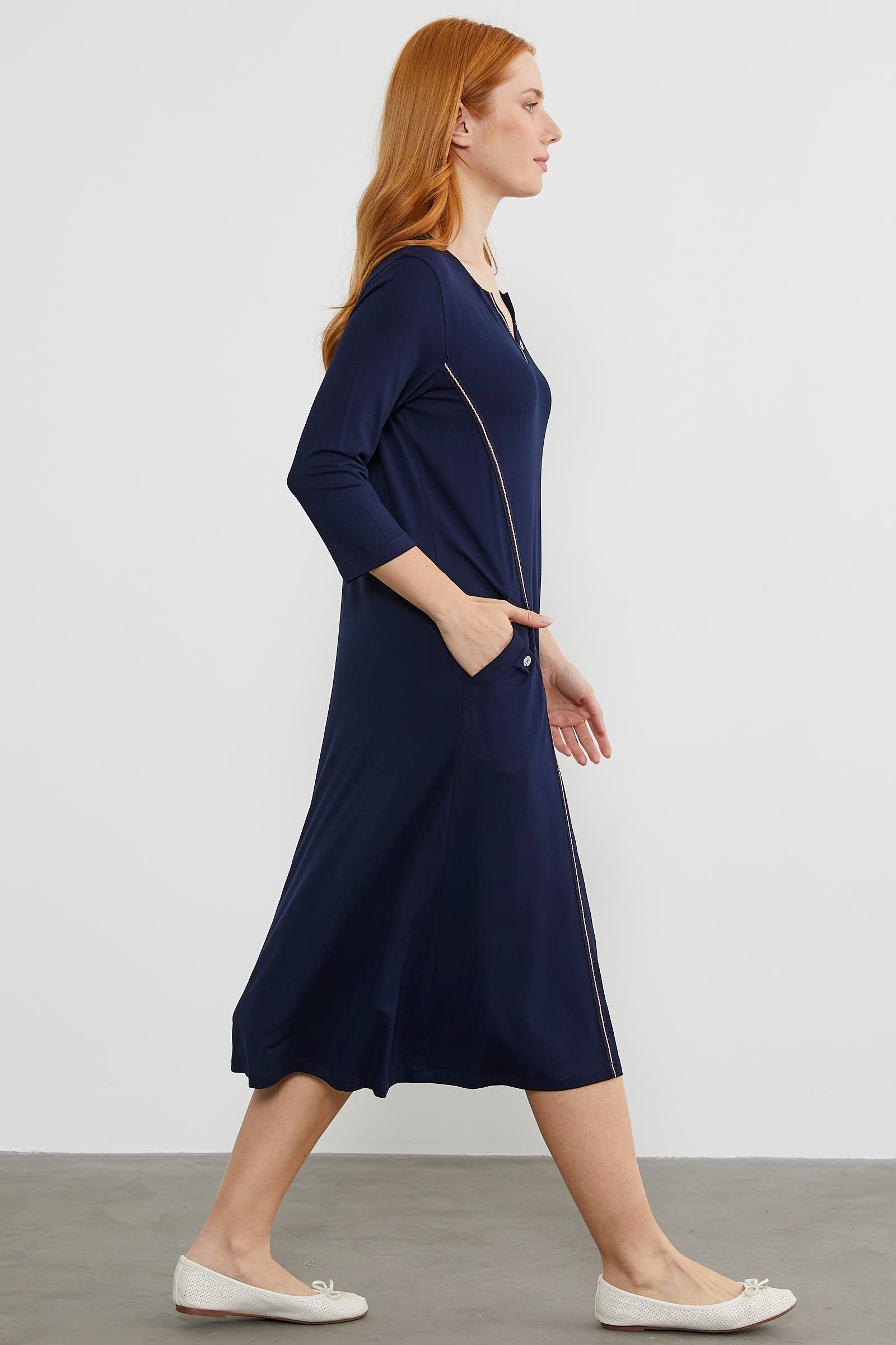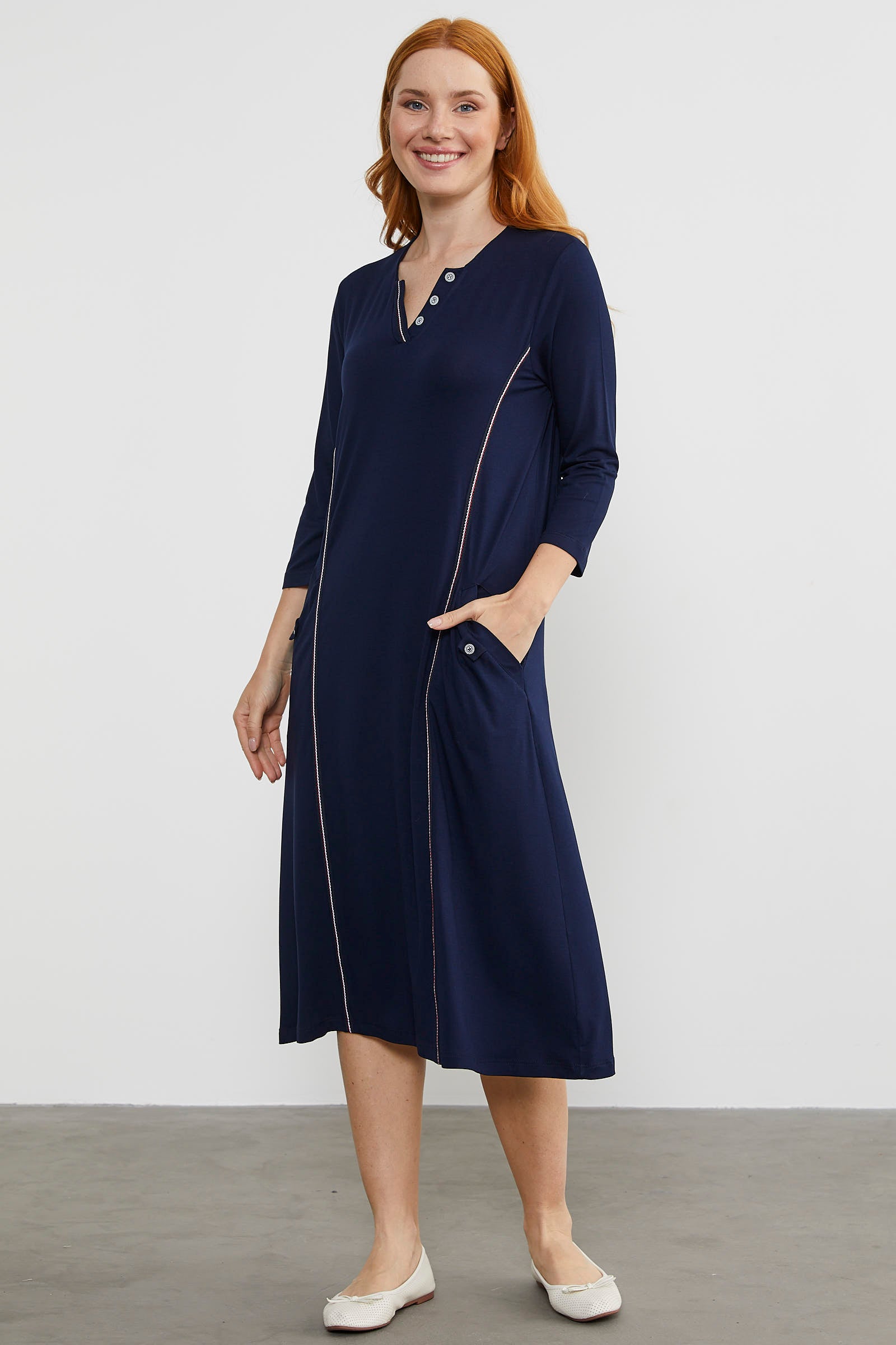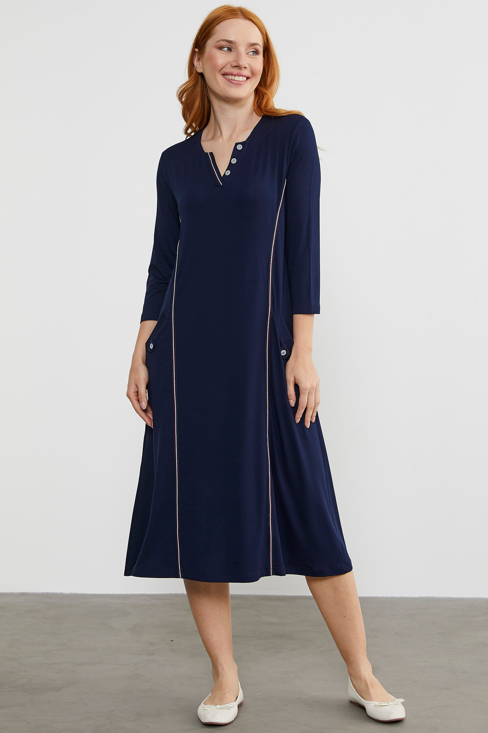 Put an end to the incompatibility and confusion in your combinations with this midi-length combed cotton dress with a stripe piping and buttoned collar, which offers the advantage of wearing with its simple design.