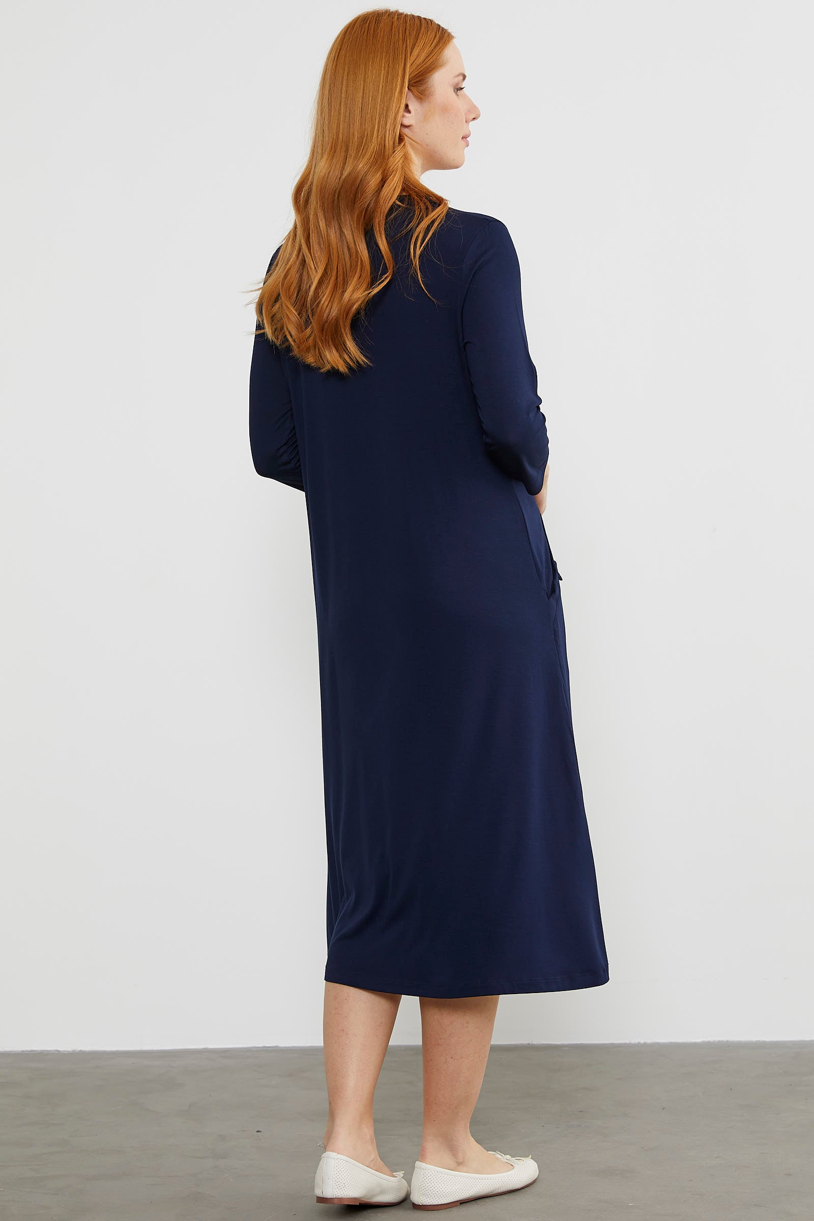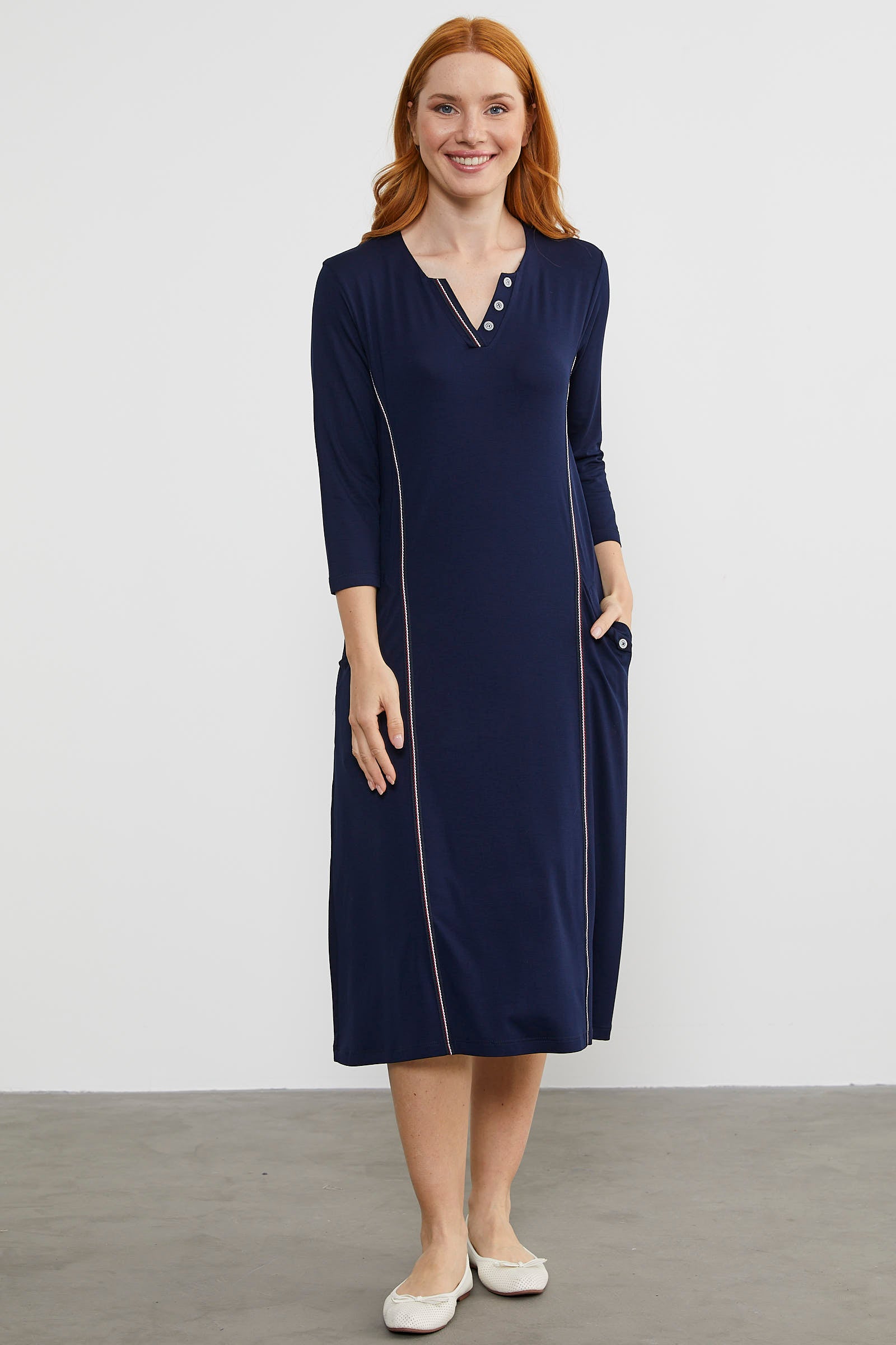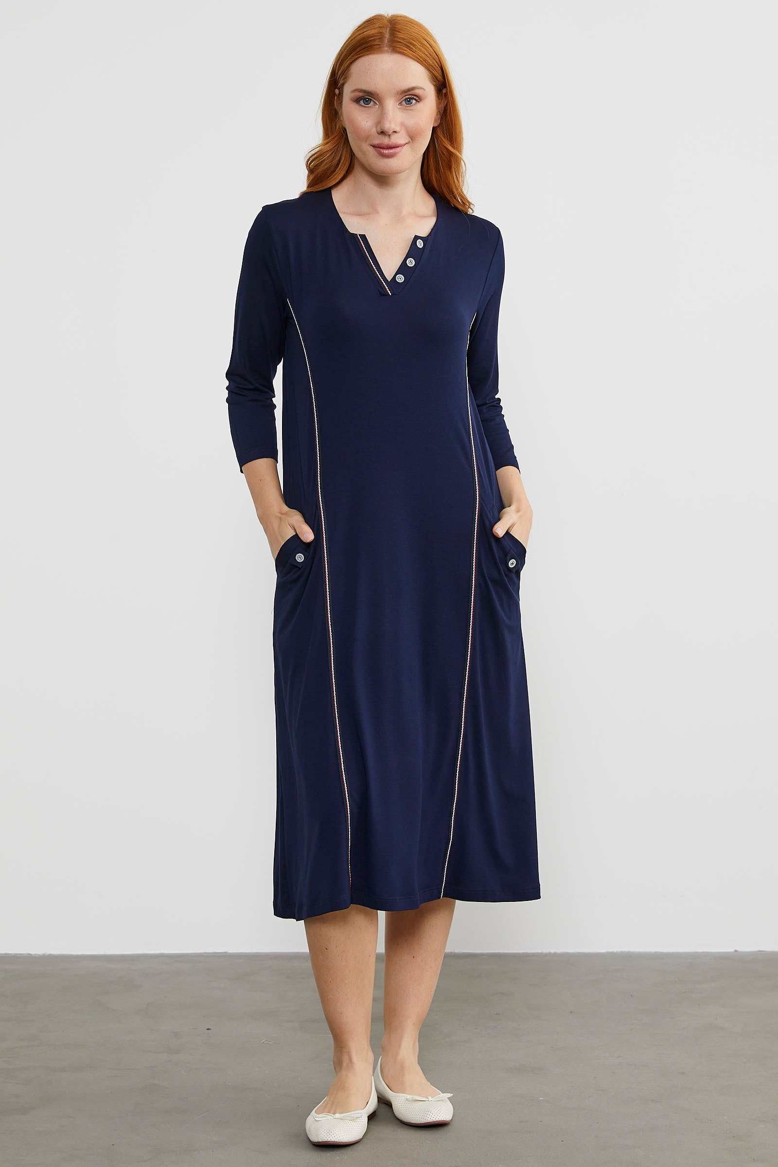 Put an end to the incompatibility and confusion in your combinations with this midi-length combed cotton dress with a stripe piping and buttoned collar, which offers the advantage of wearing with its simple design.