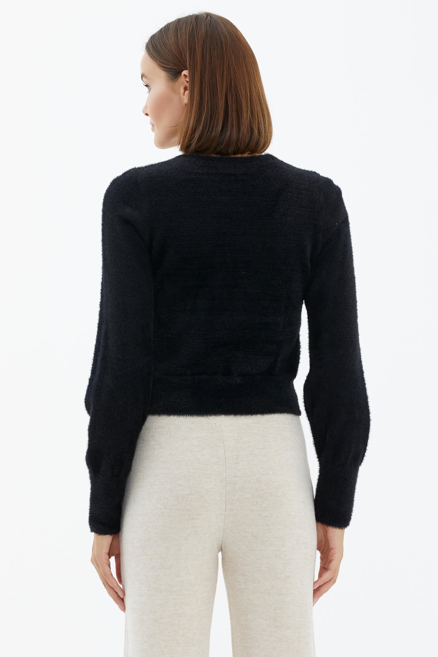 Soft knit sweater made from wool-blend yarn, with an open neckline and long sleeves.