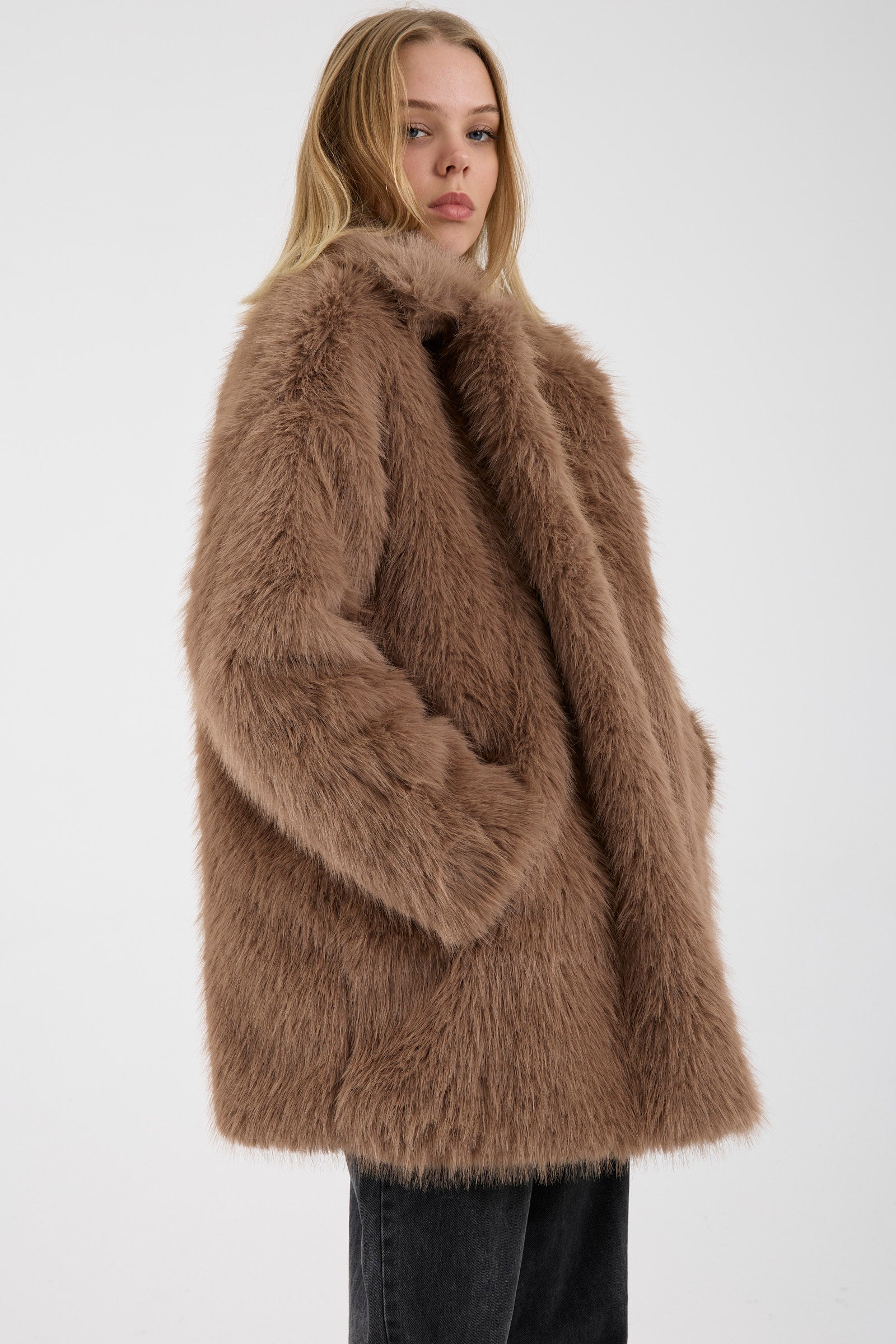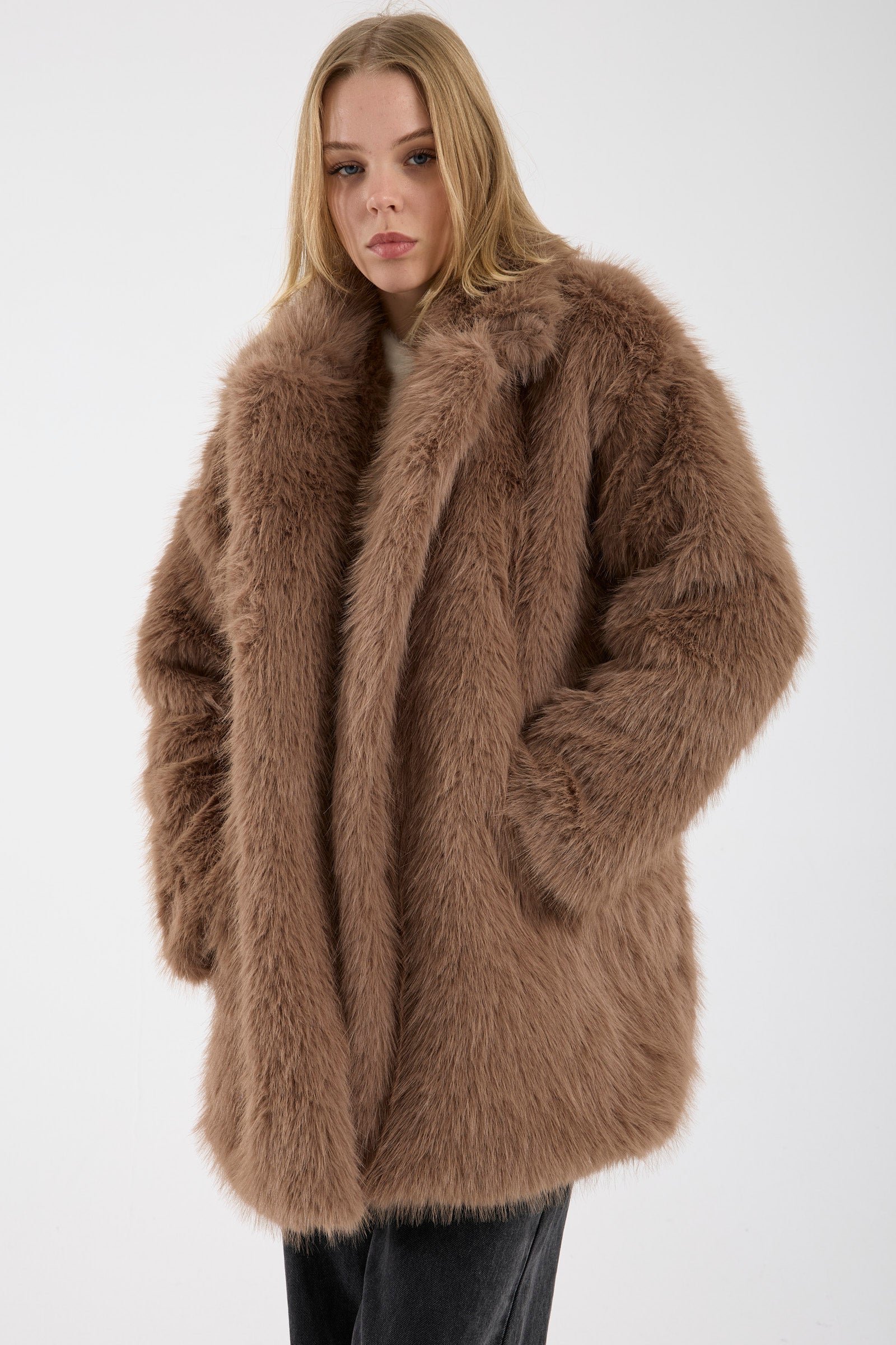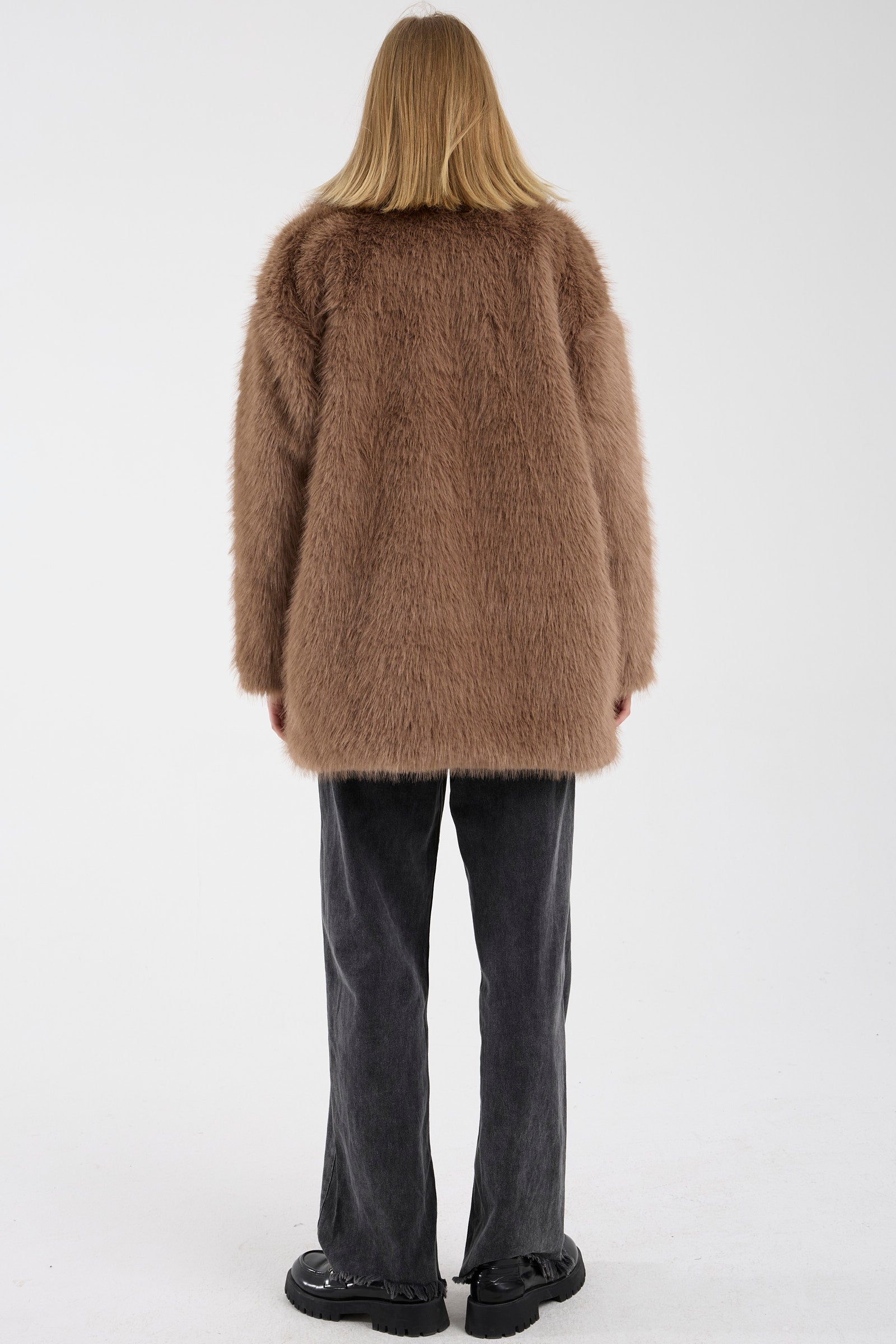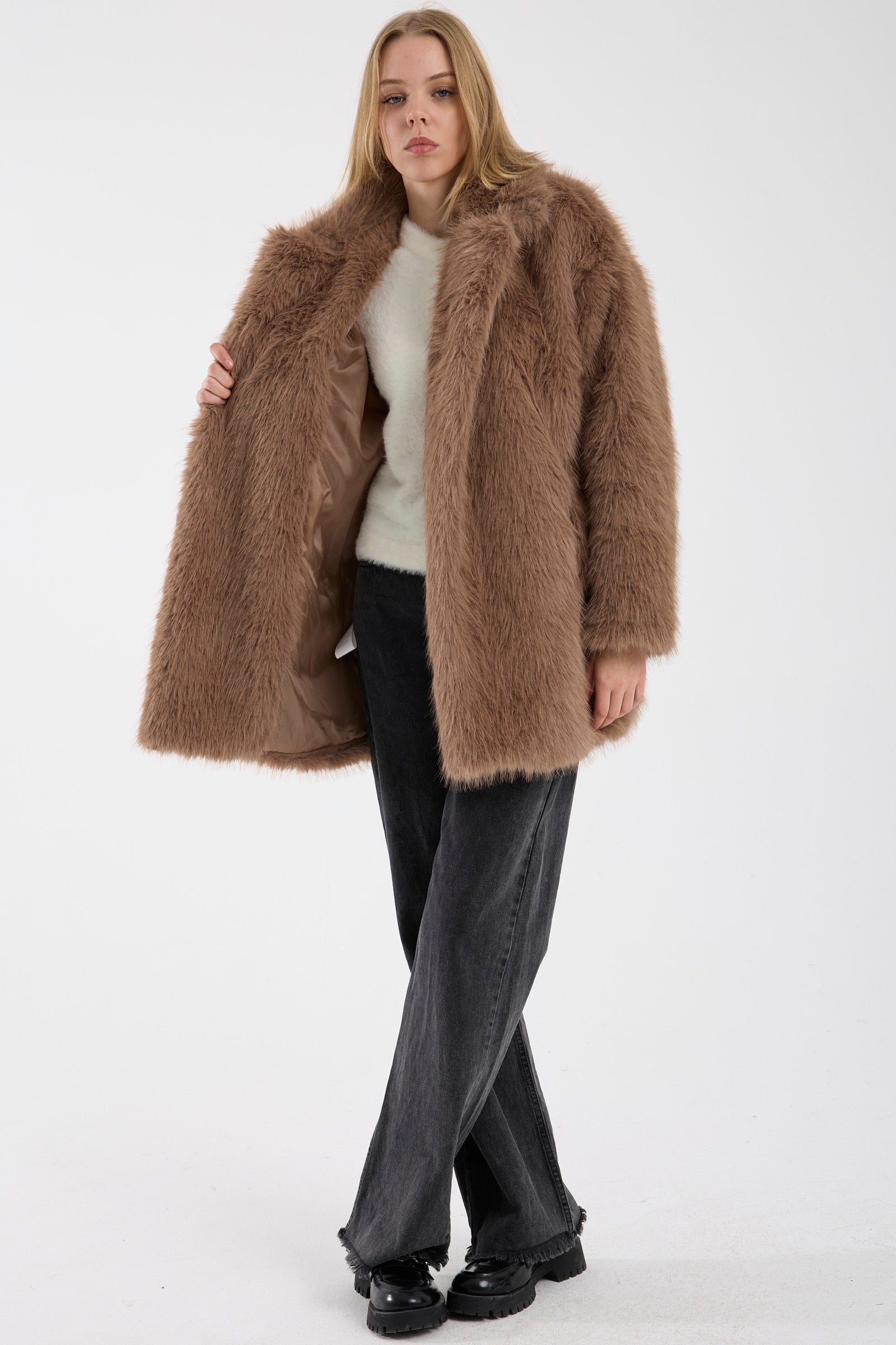 Katlı yaka, rahat kalıp, uzun suni kürk kaban. Ton sür ton iç astarlı üretilmiştir.