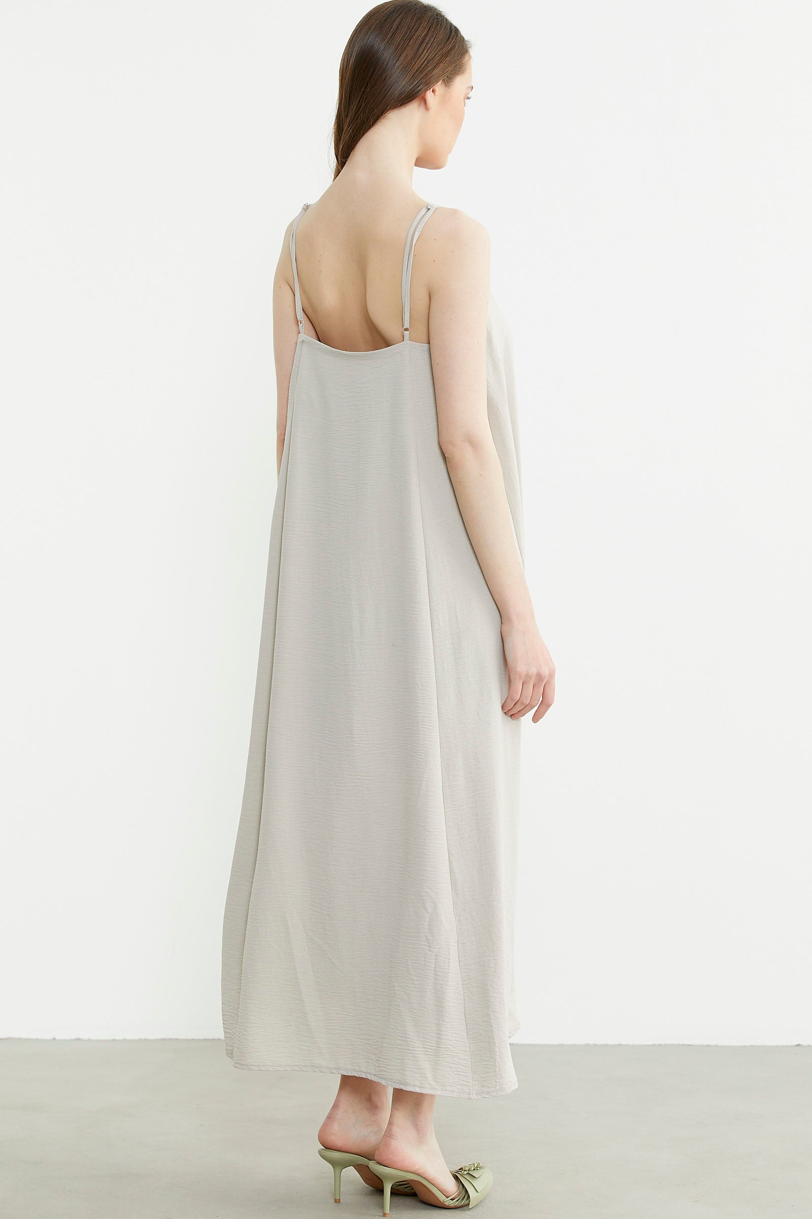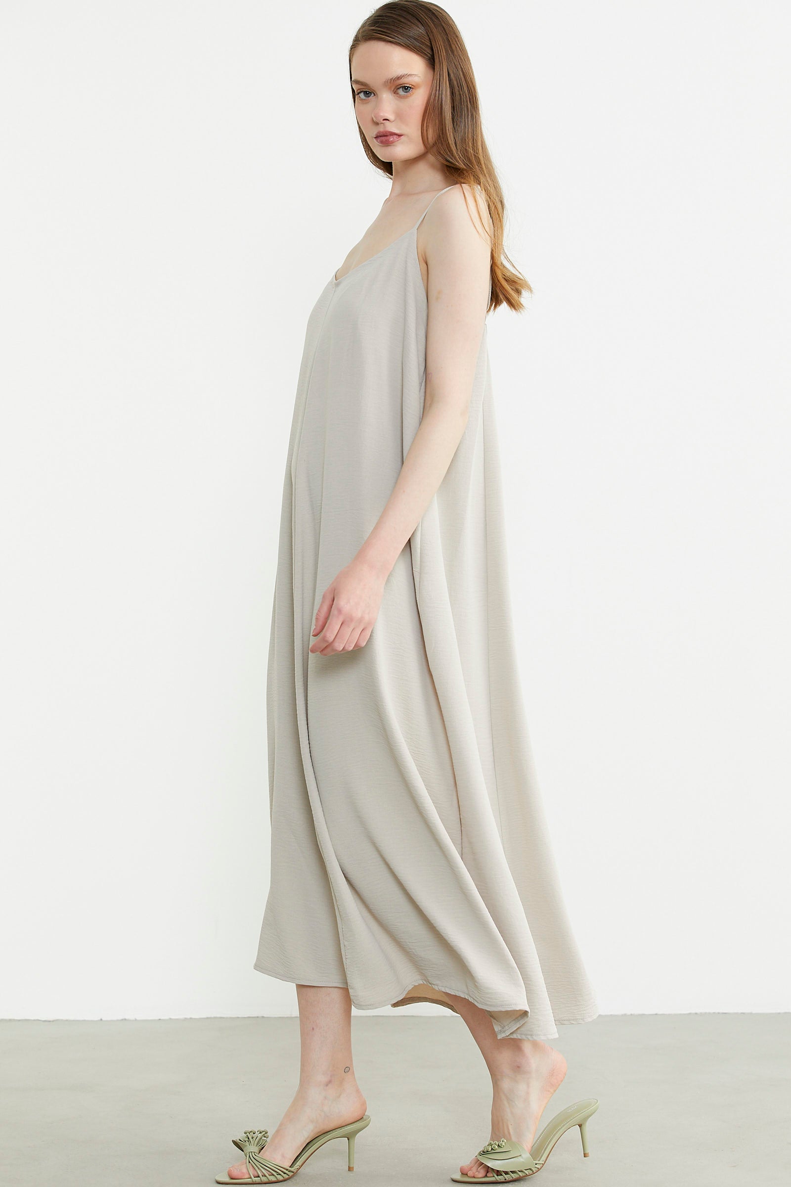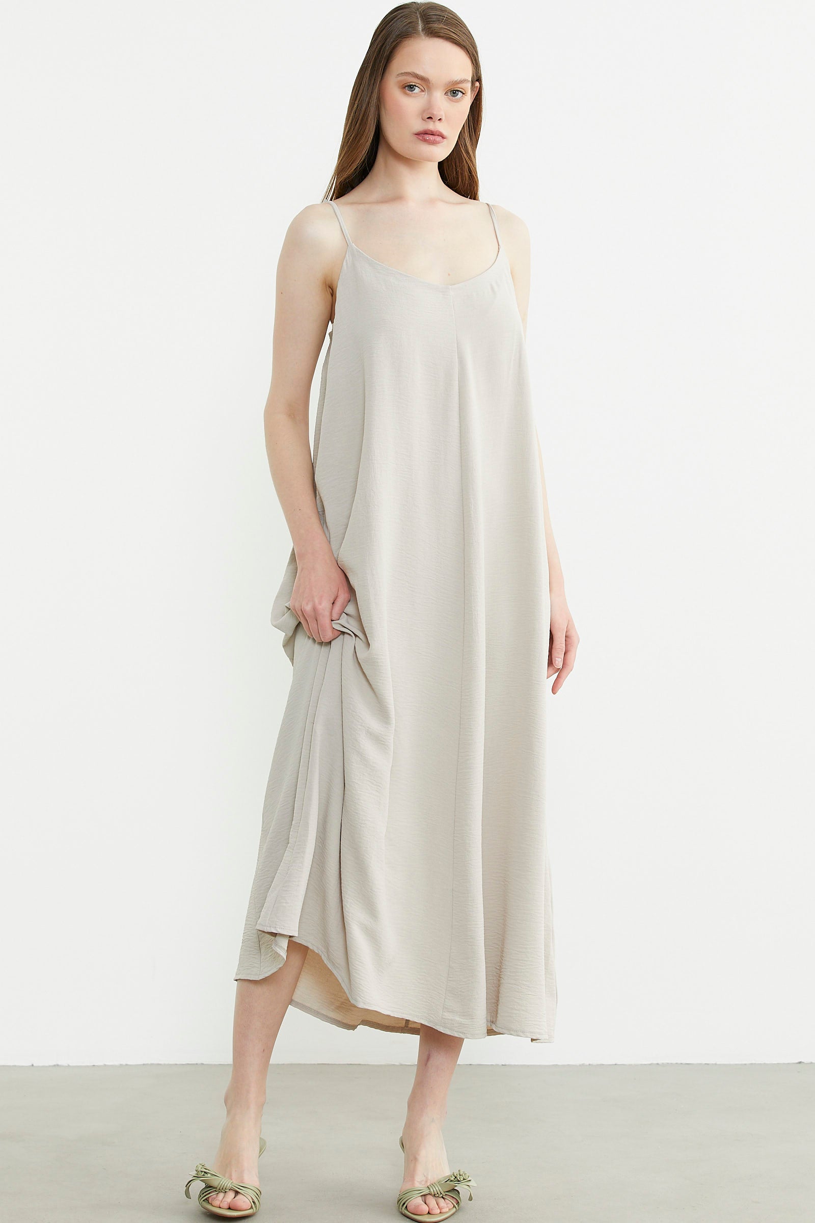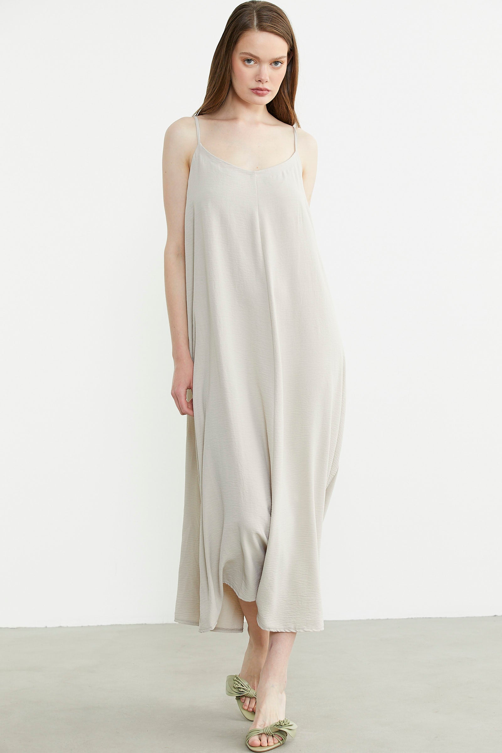 Ayarlanabilir ip askılı uzun elbise rahat kalıptır. Zarif ve şık görünüm sunar.