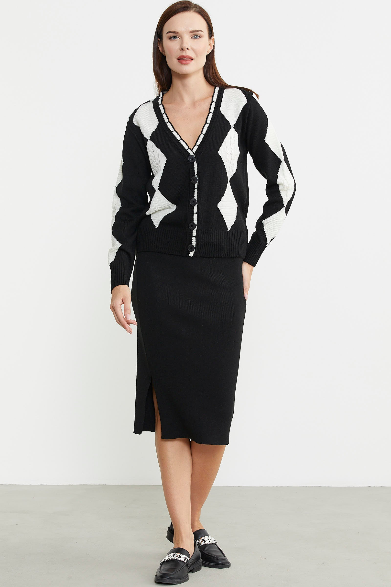 Double Color Wool Knitted Cardigan with Diamond Pattern - Gray