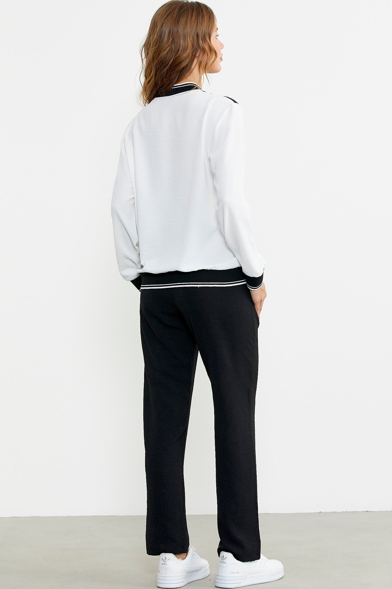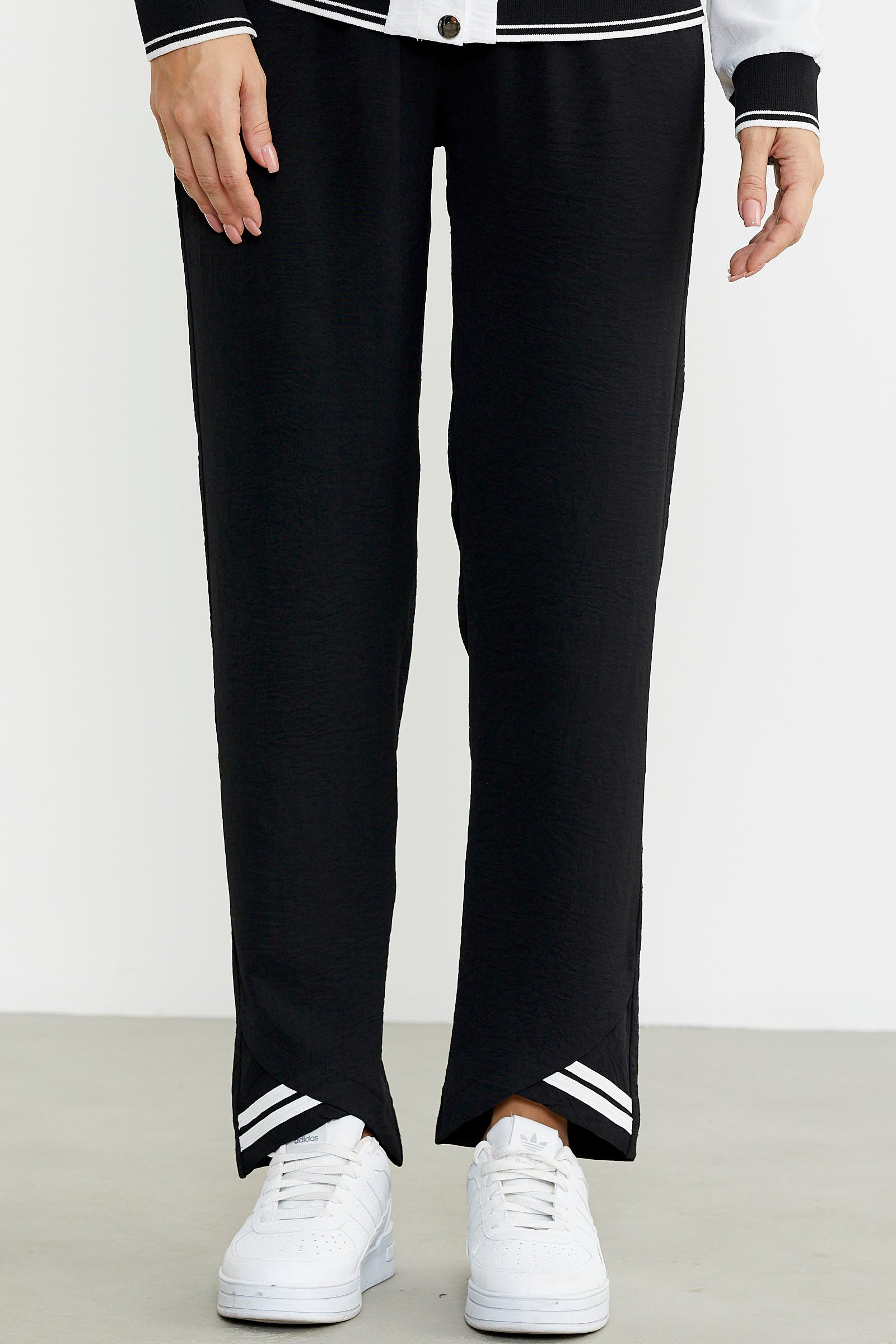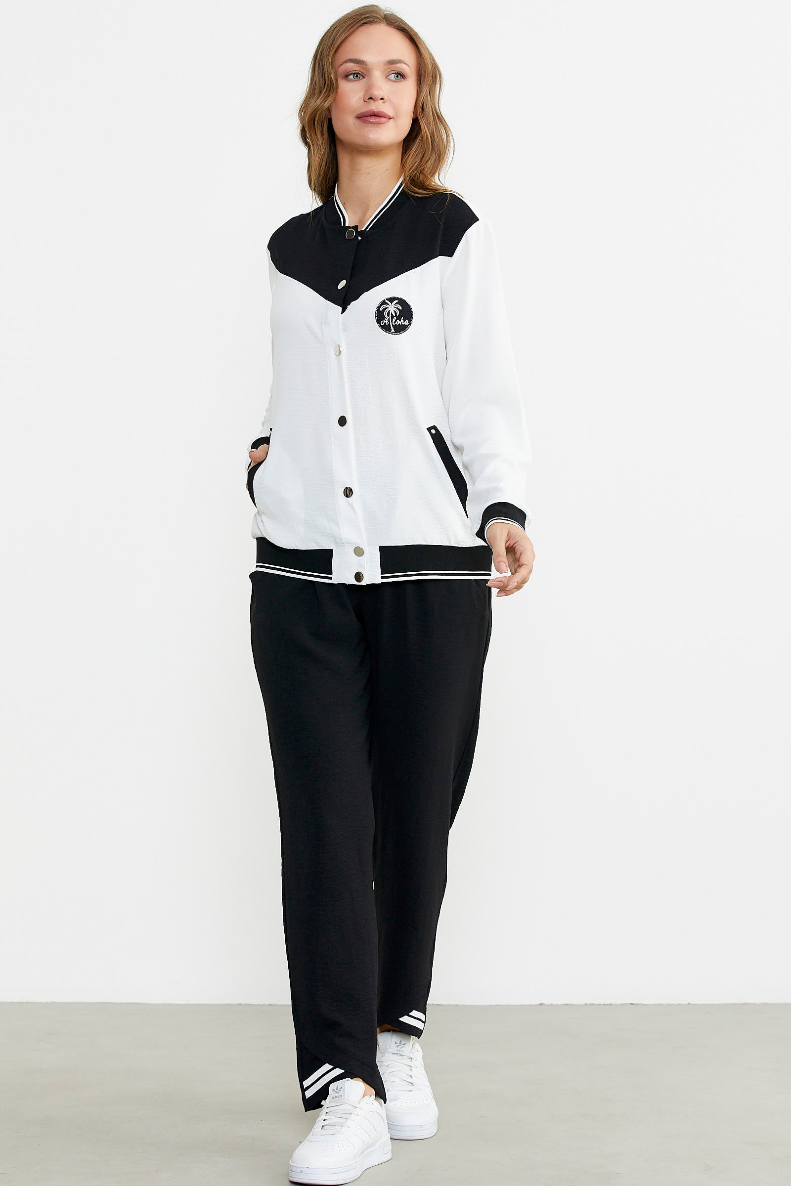 Crepe suit with snap closure and piping detail on the legs. It draws attention with its modern and stylish look.