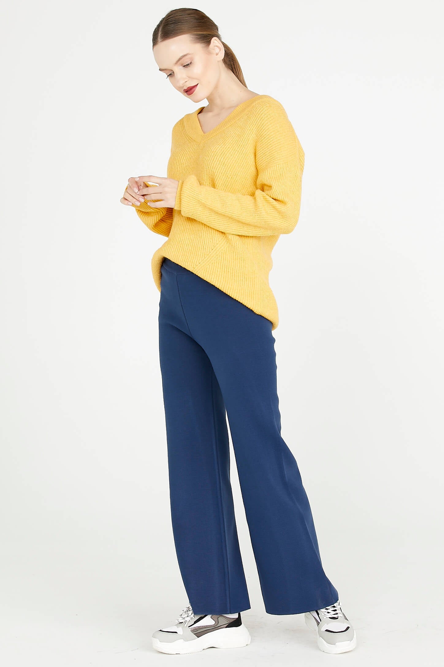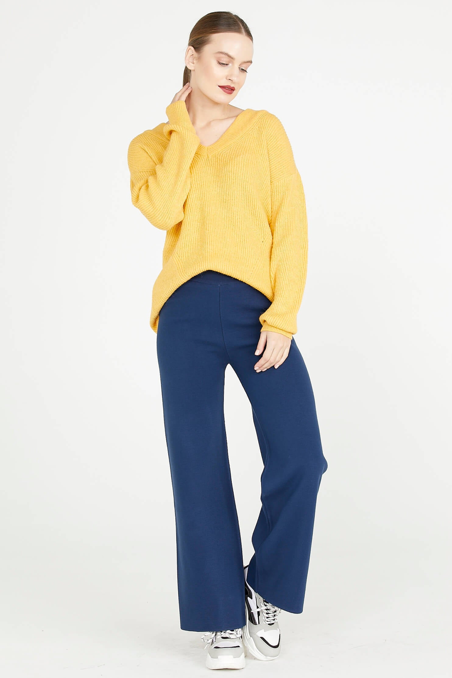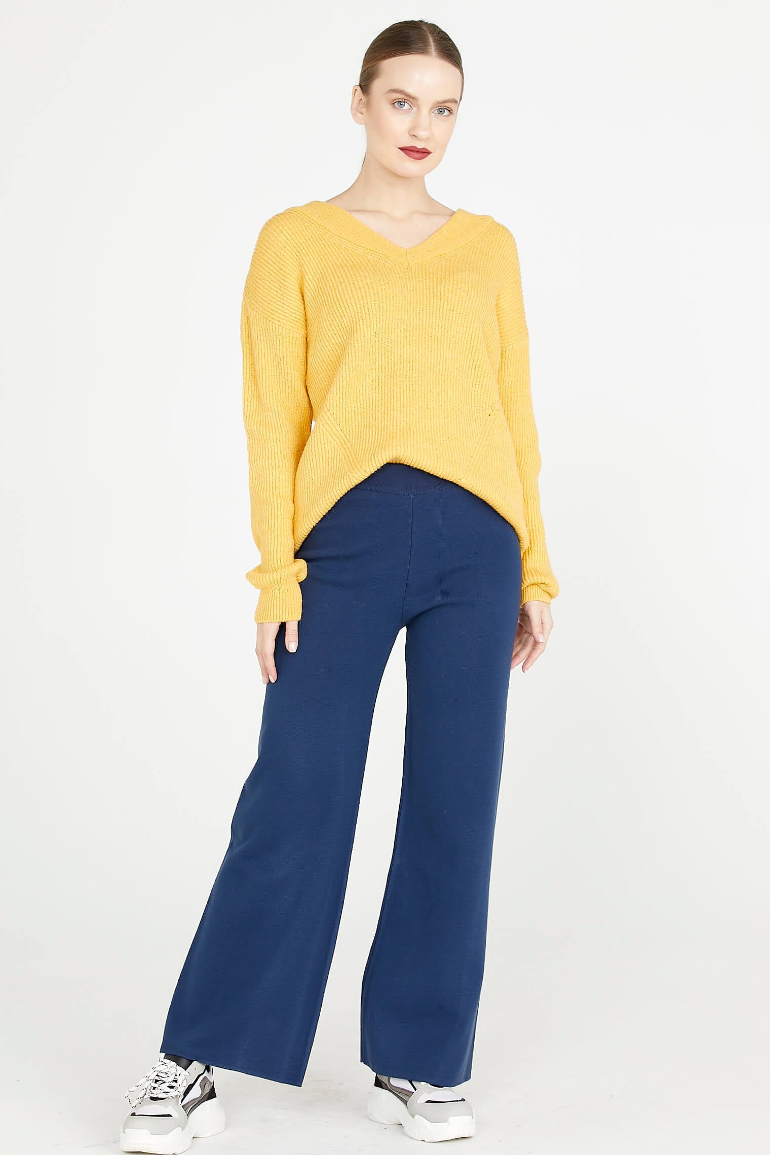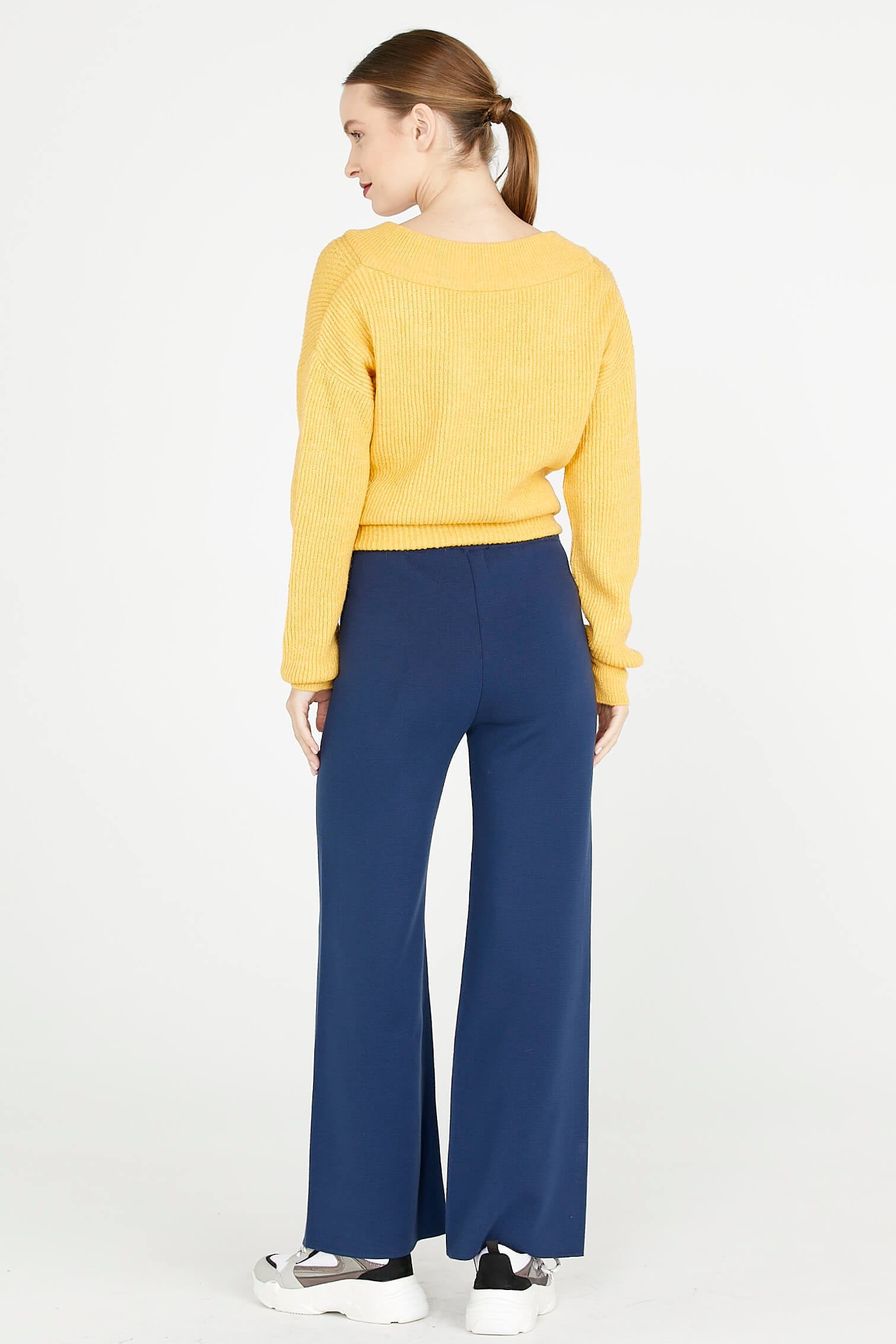 High waist, elasticated waist, wide leg knit trousers that stand out with their plain form.
