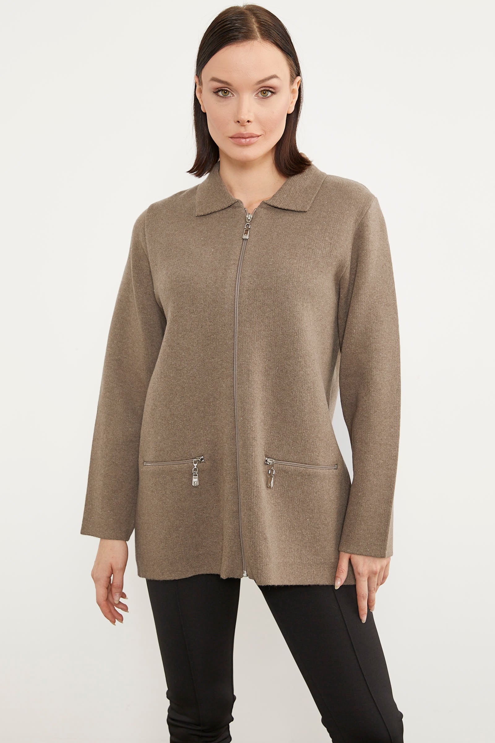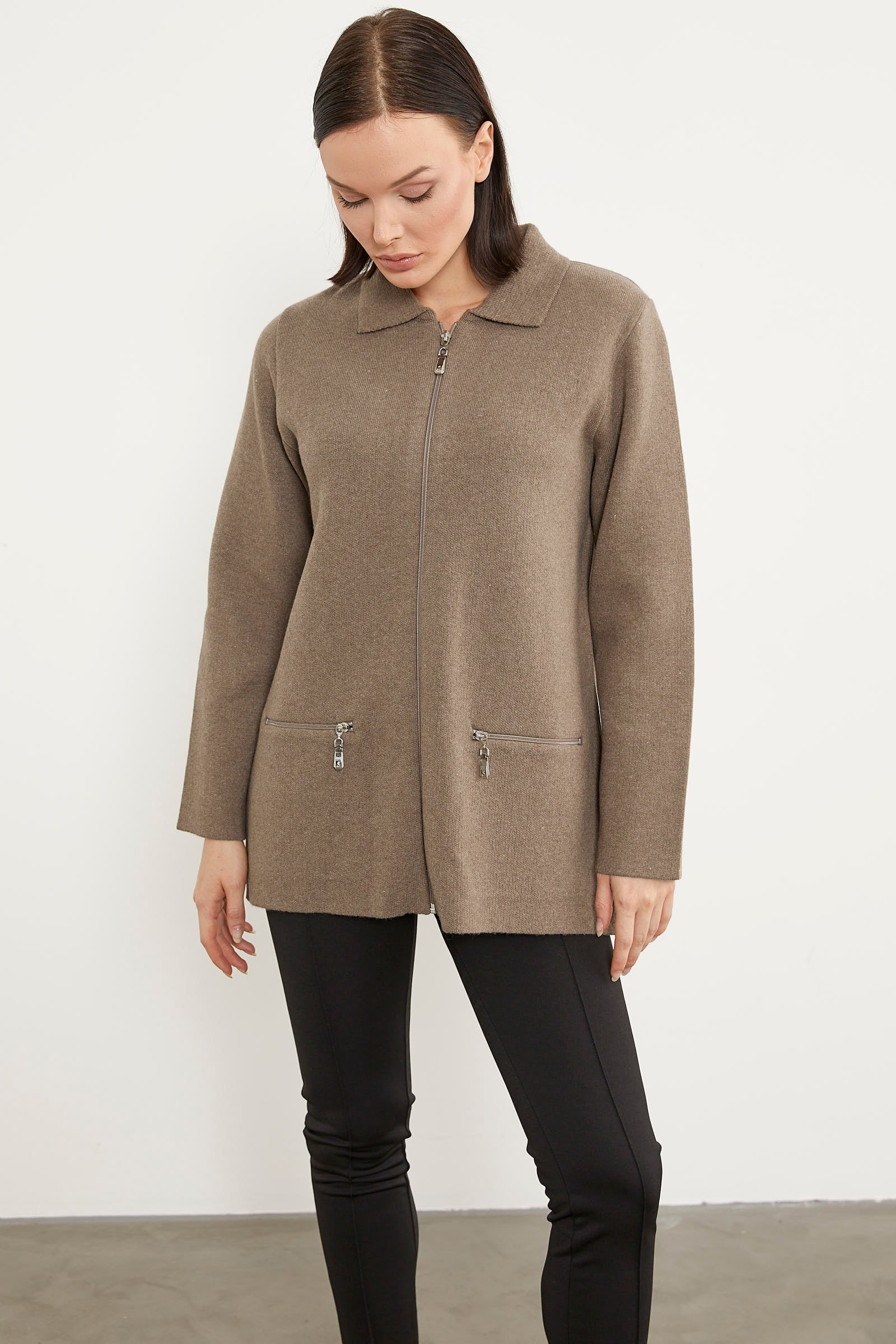 Shirt Collar Zipper Knitwear Cardigan with Pockets - Milk Brown