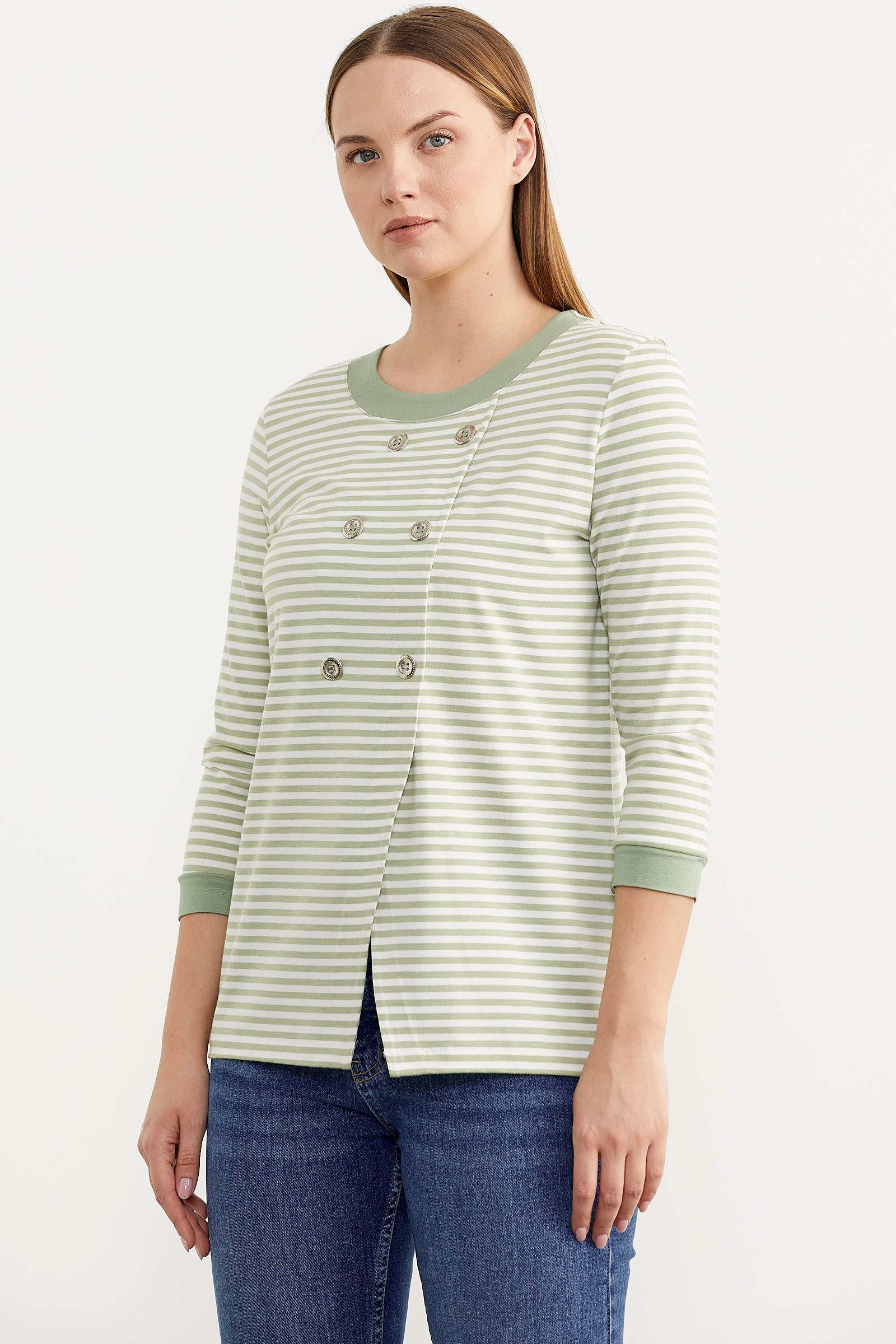 Striped Long Sleeve Button Detailed T-Shirt - Black