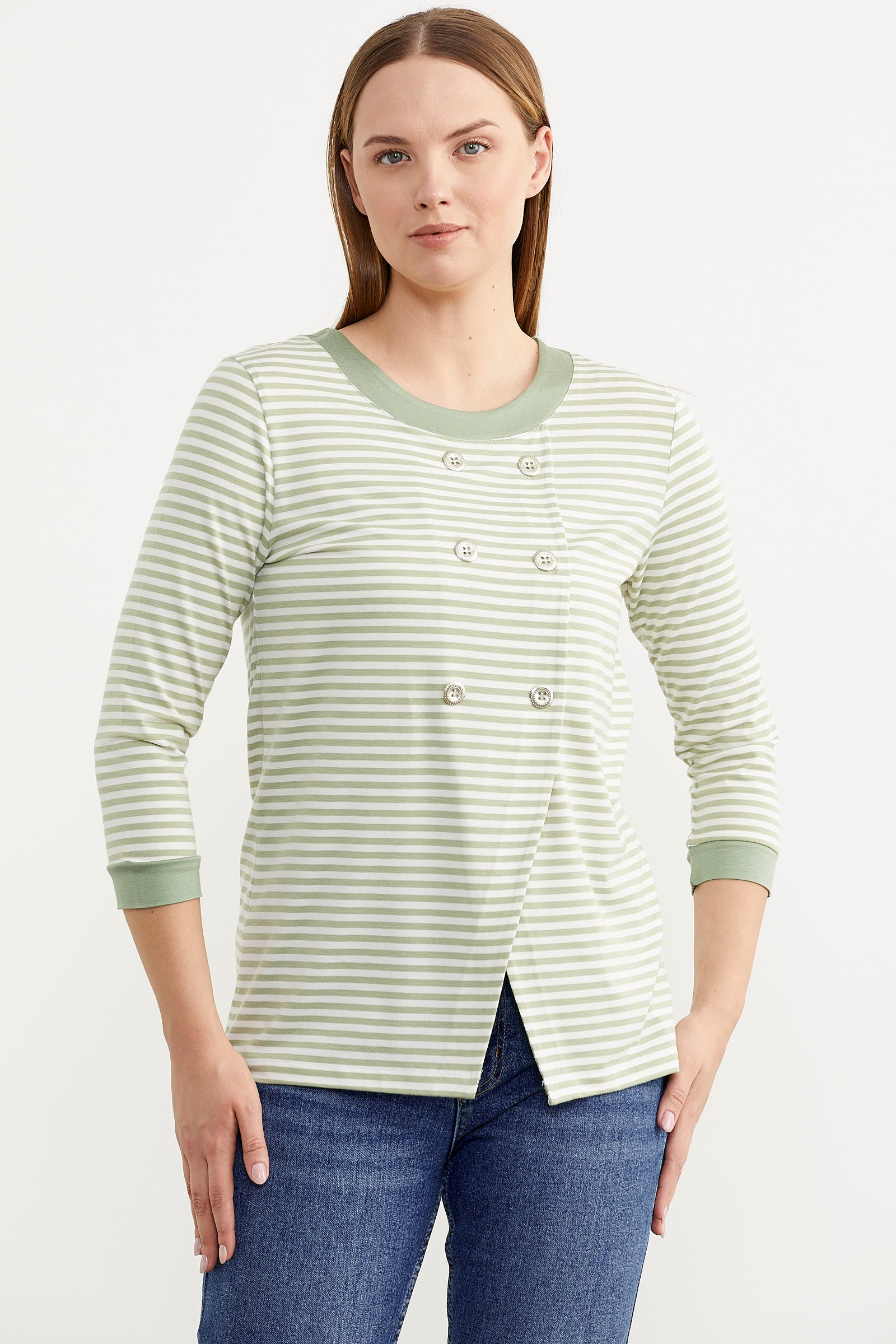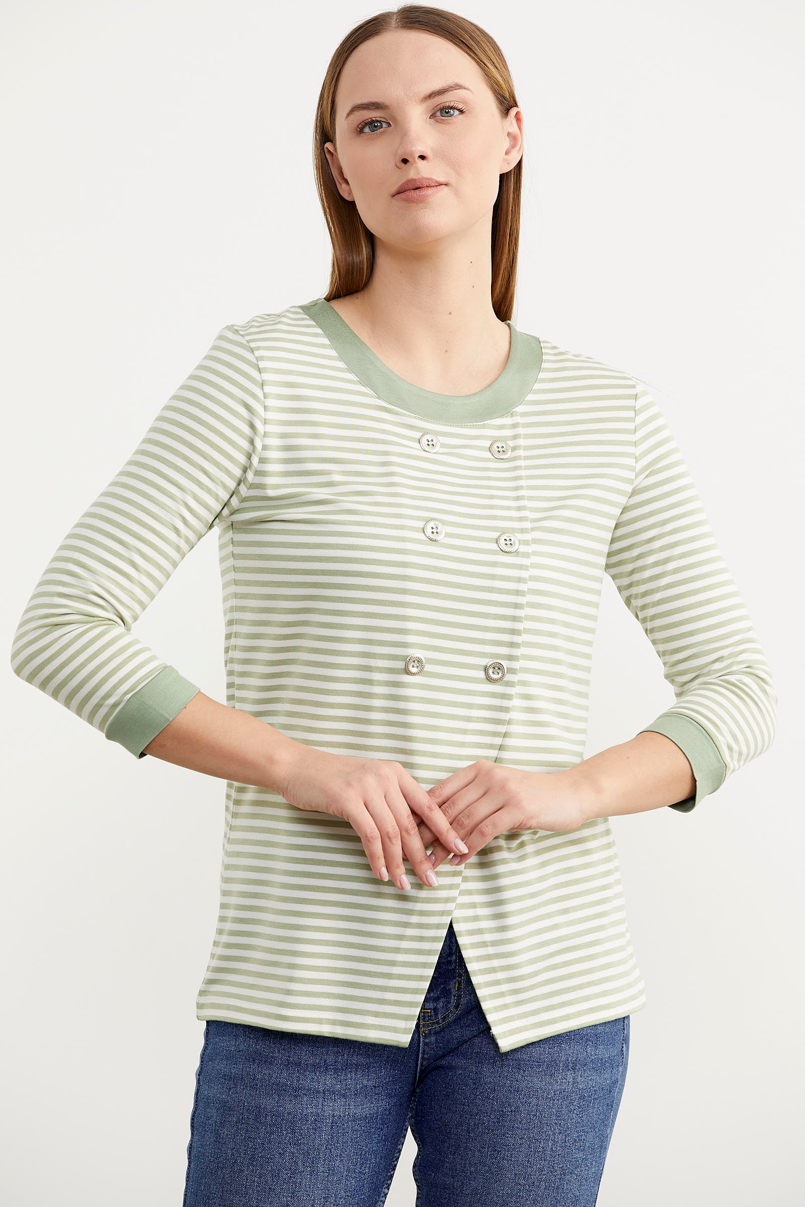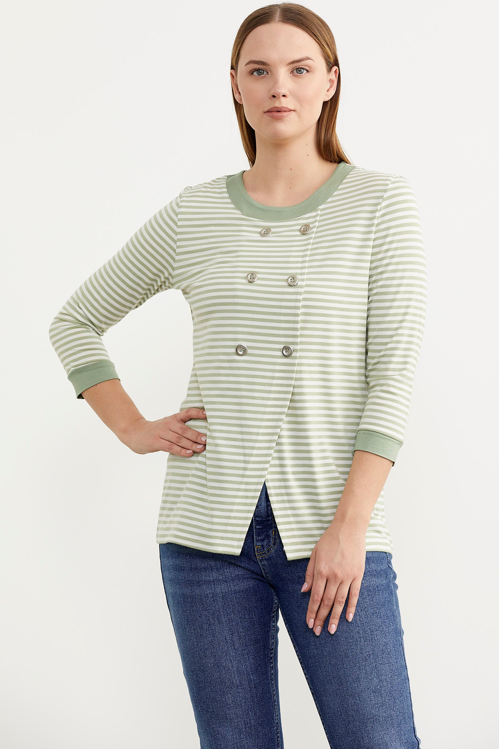 Striped three-quarter sleeve t-shirt with double-breasted button detail is a candidate to be among the summer's popular pieces.