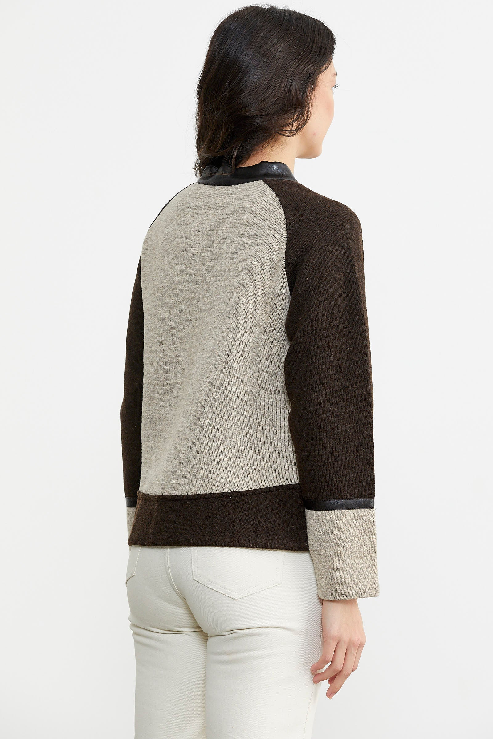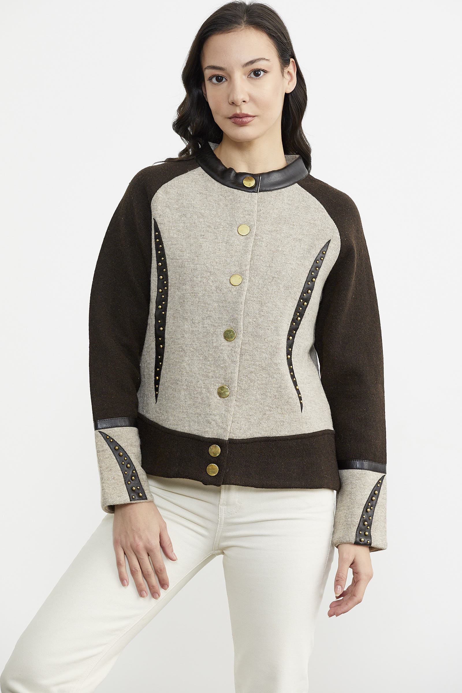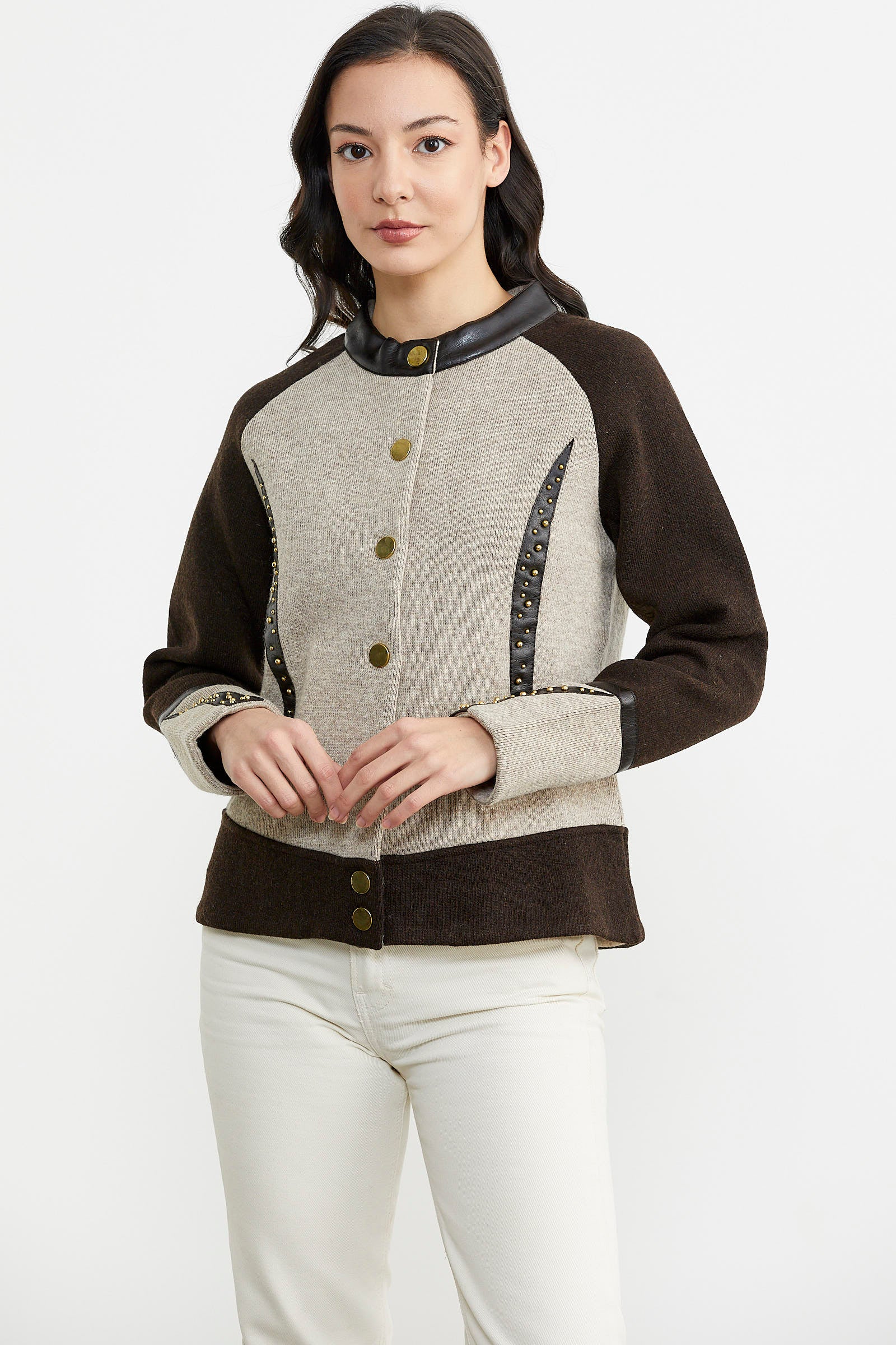 Leather Combined Wool Knitwear Jacket - Mink - Brown
