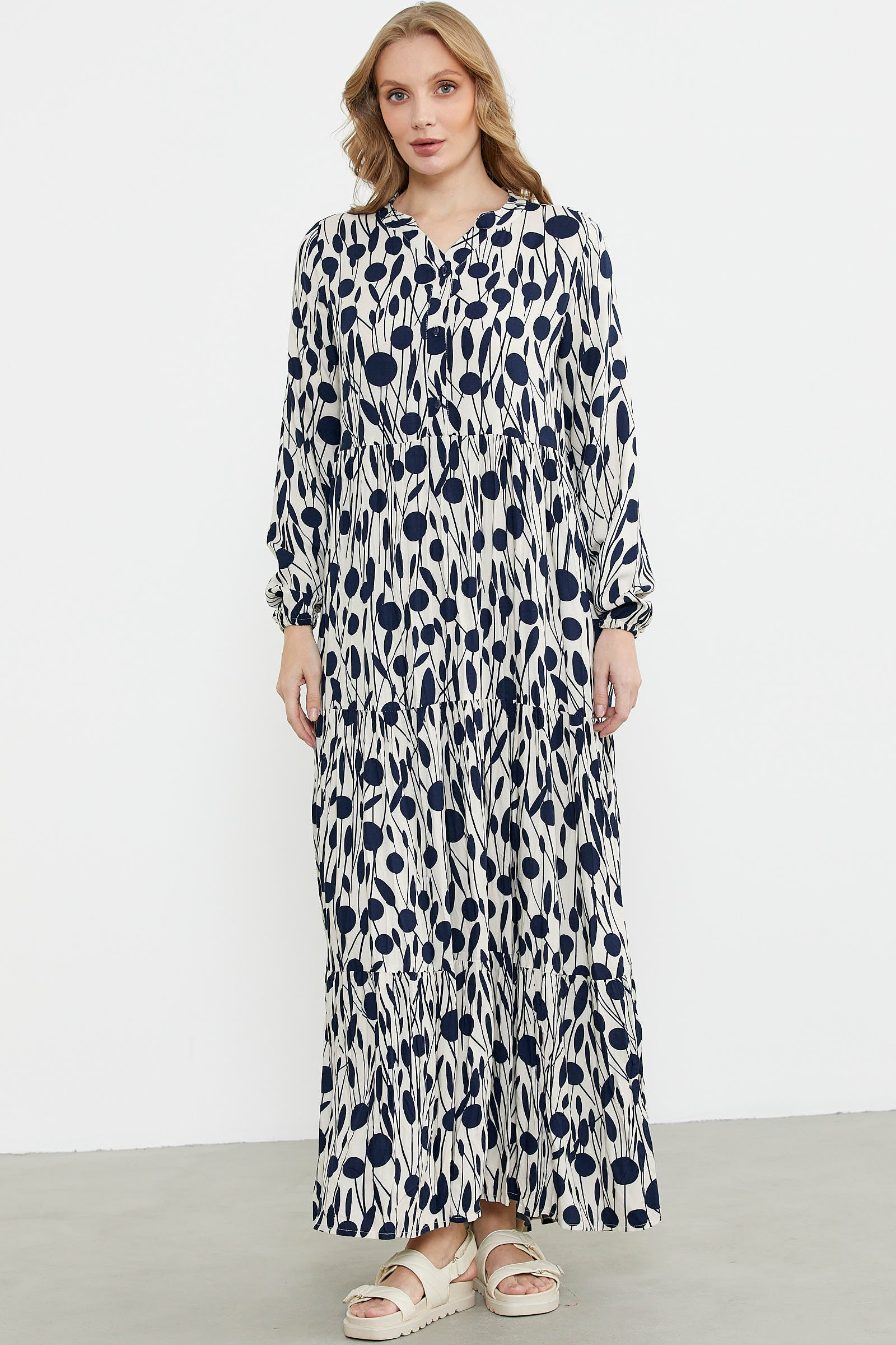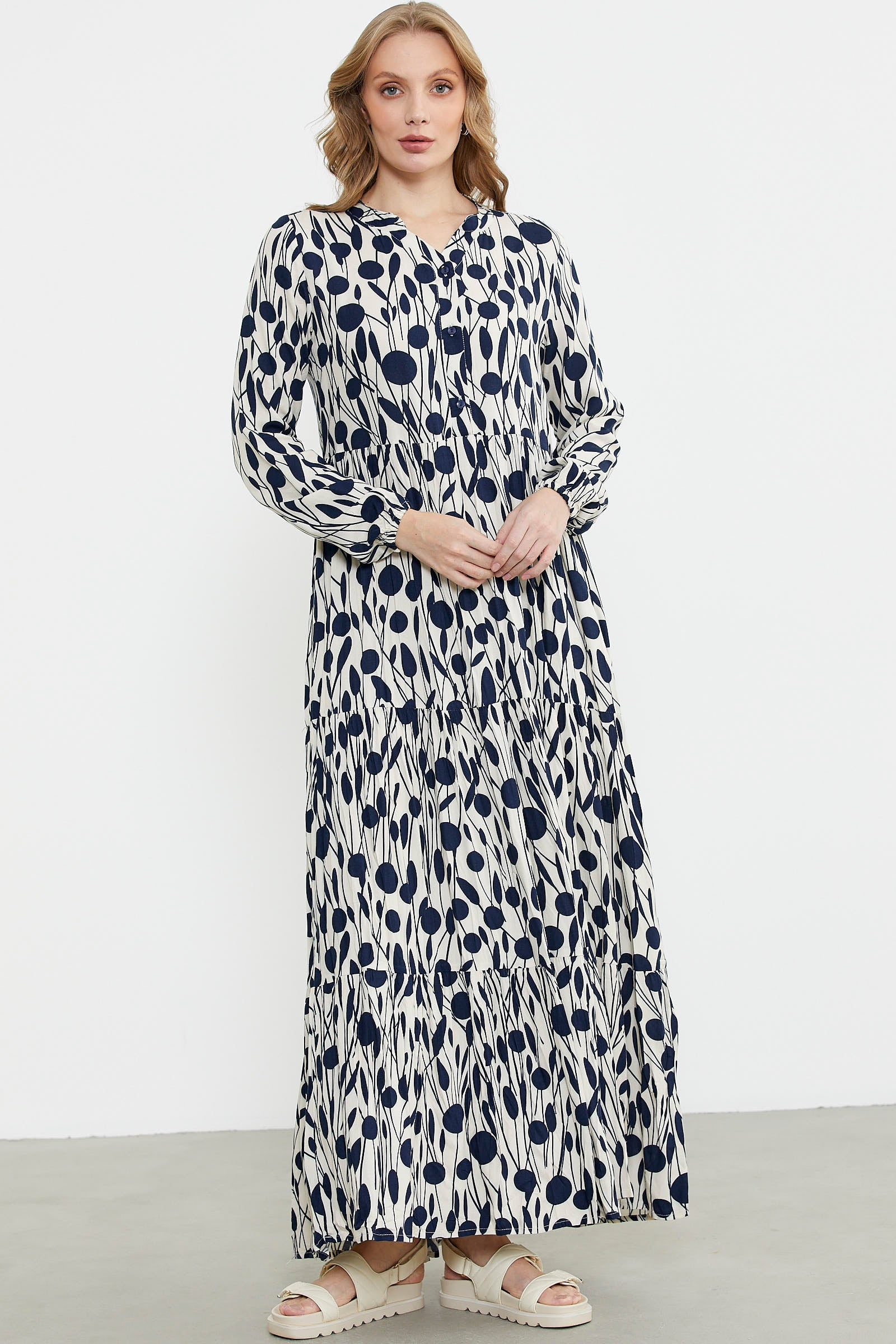 The dress is made of patterned fabric and has a low mandarin collar. The collar is buttoned up to the front yoke. The gather details used on the body provide ease of movement. Elastic is used on the sleeve ends.