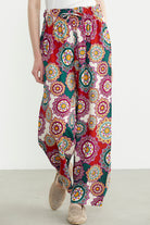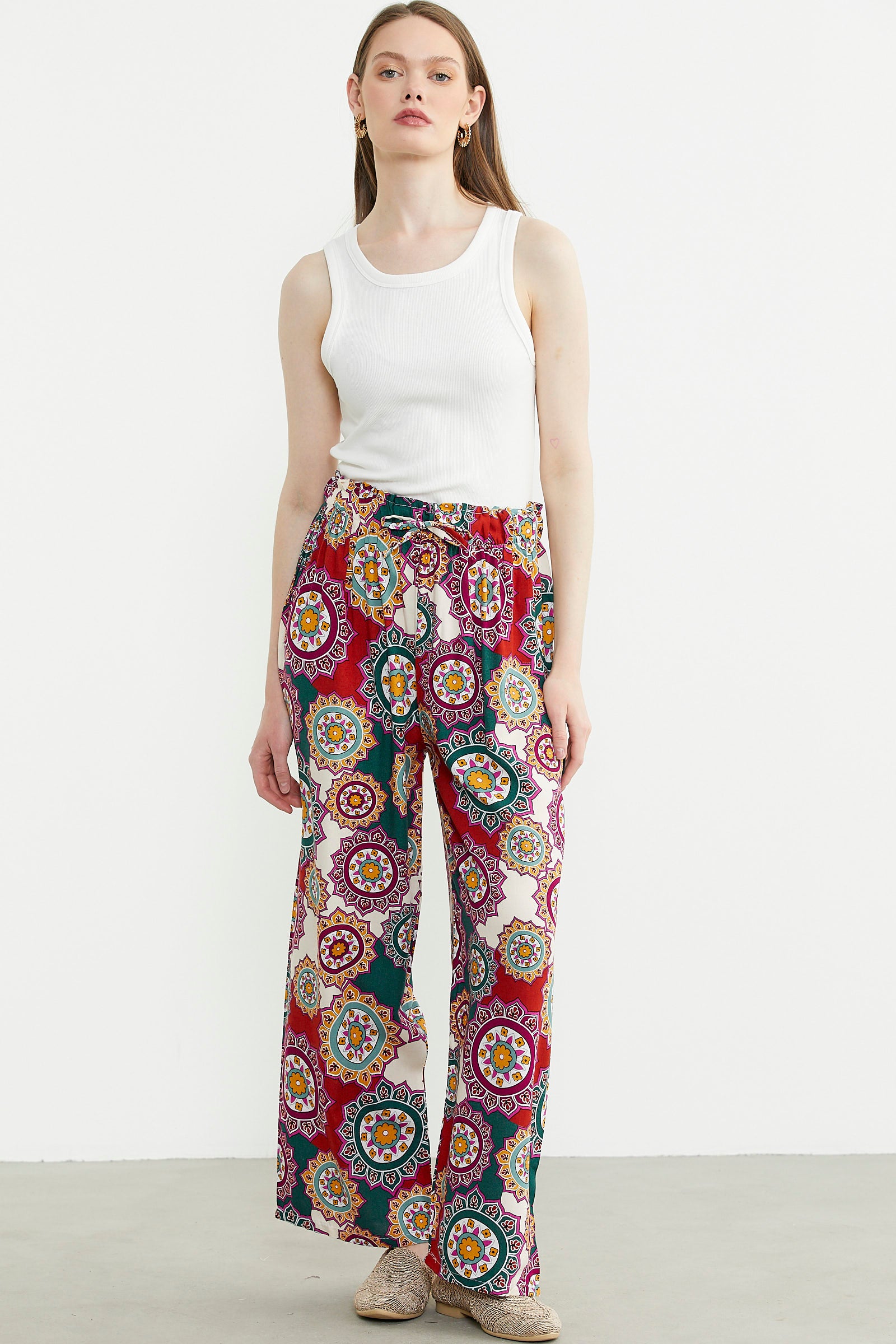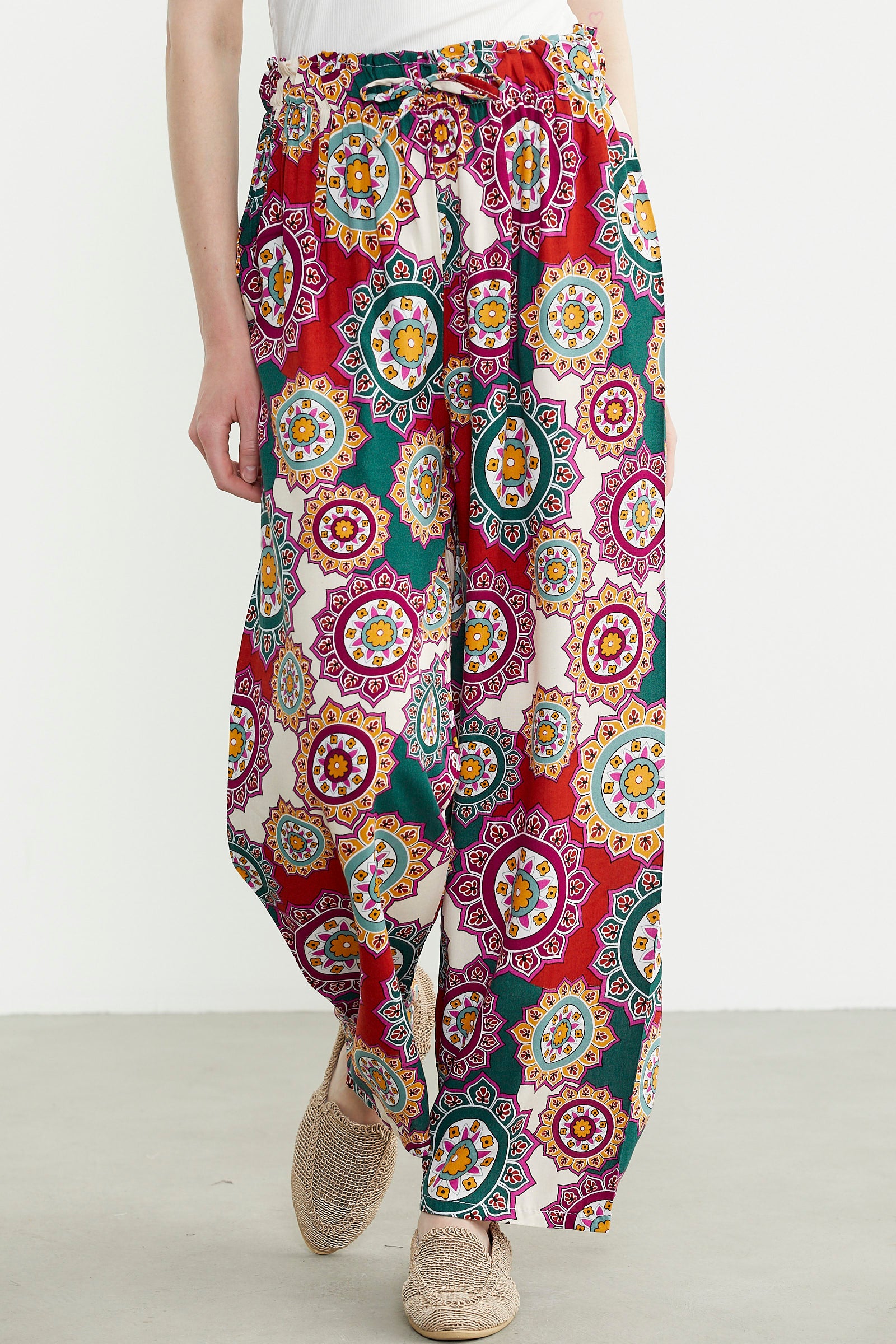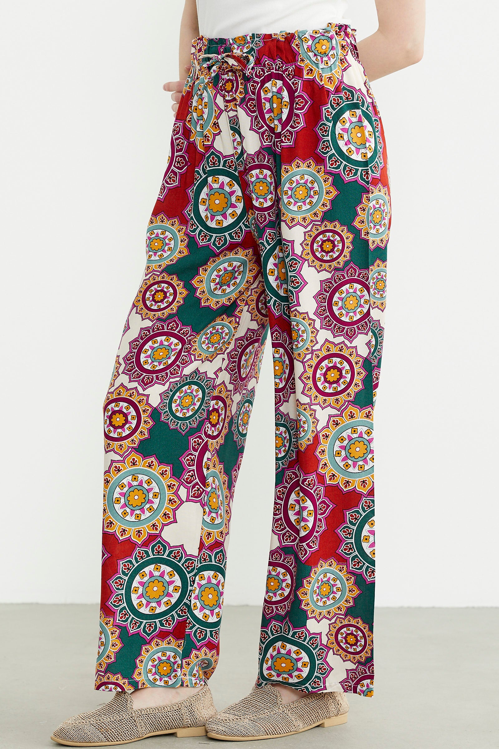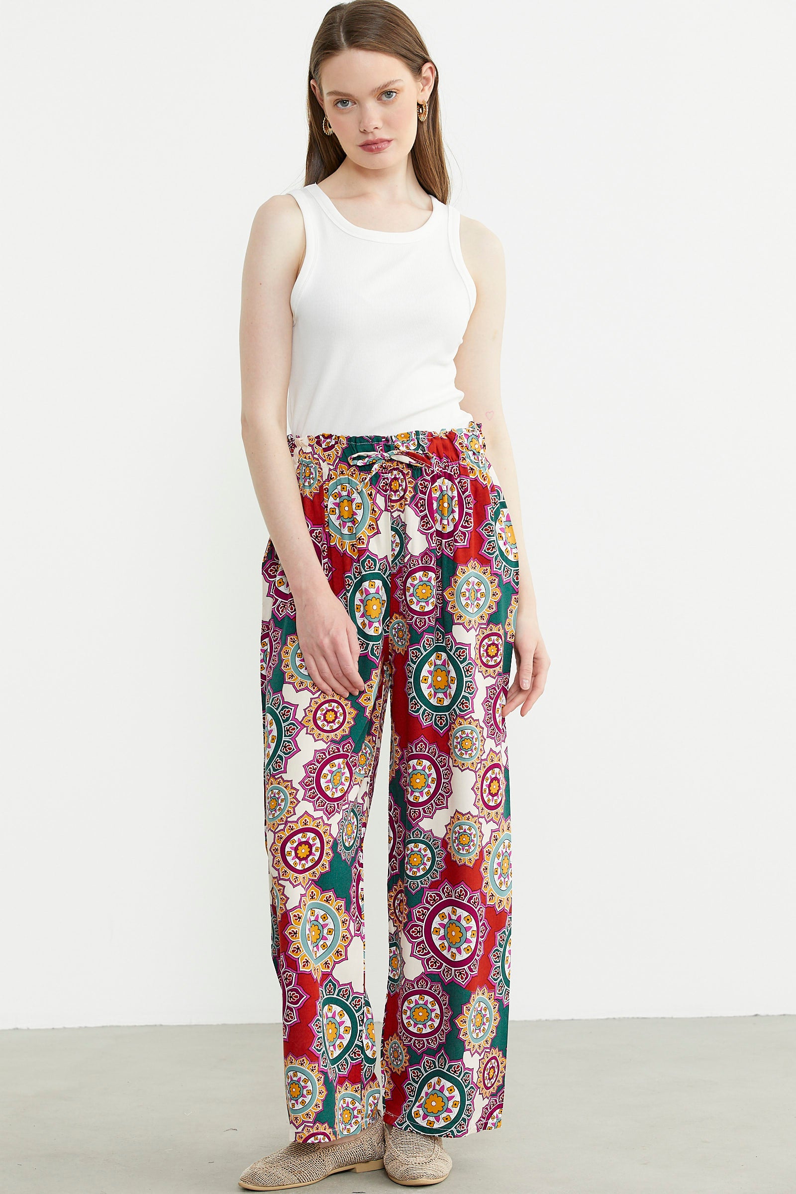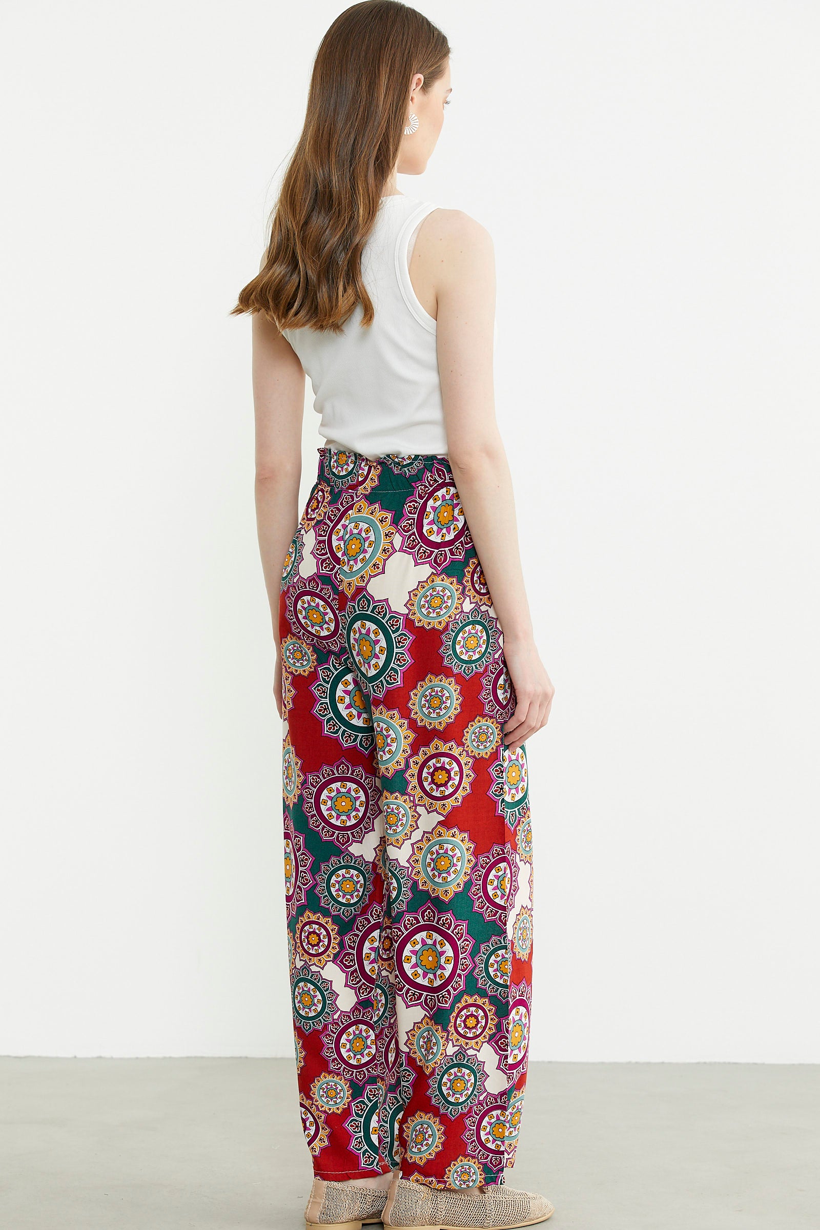 Yüksek bel lastikli pantolon, desenli ve renklidir. İlkbahar/Yaz mevsim koşullarına uygun olarak üretilmiştir.