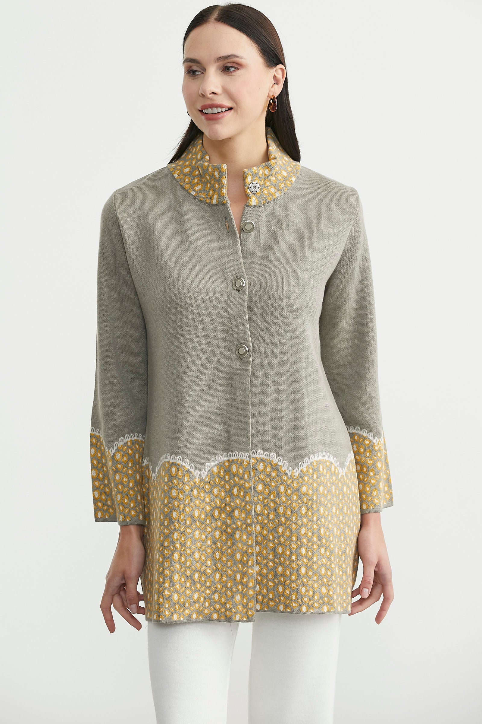 Yünlü, kalın kışlık triko ceket. Dik yaka ve geniş kol detayına sahiptir. Rahat kalıp.