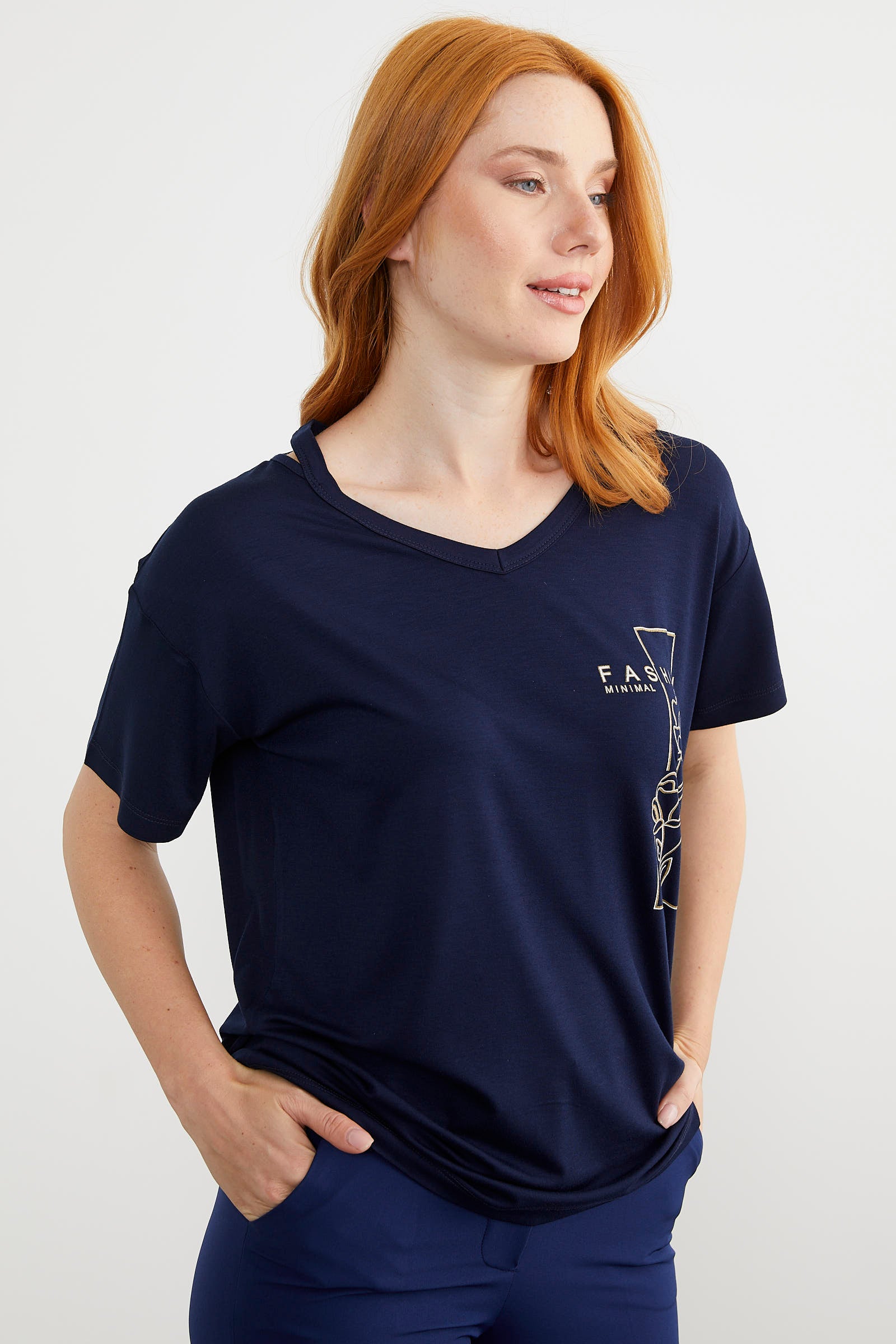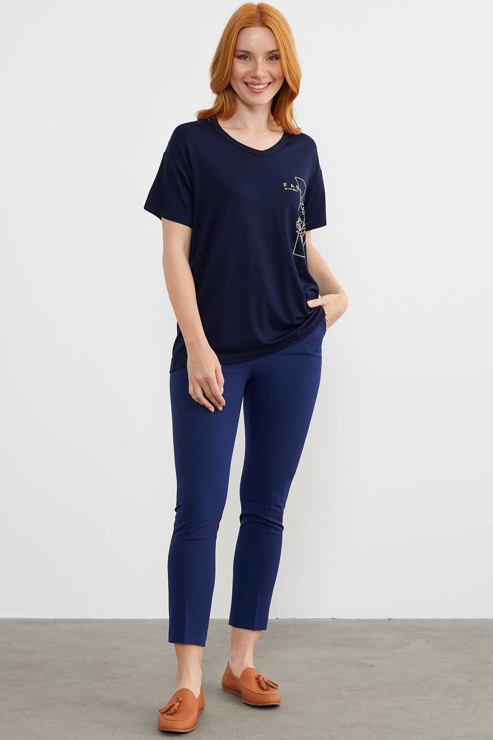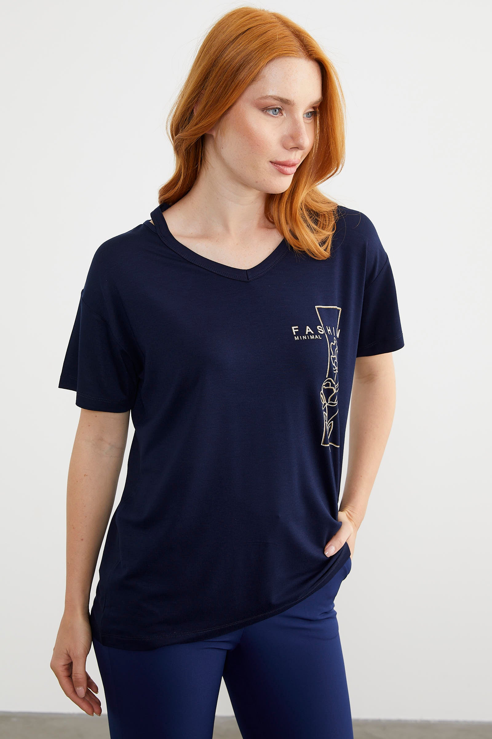 Loose V-Neck Printed T-Shirt - Navy Blue