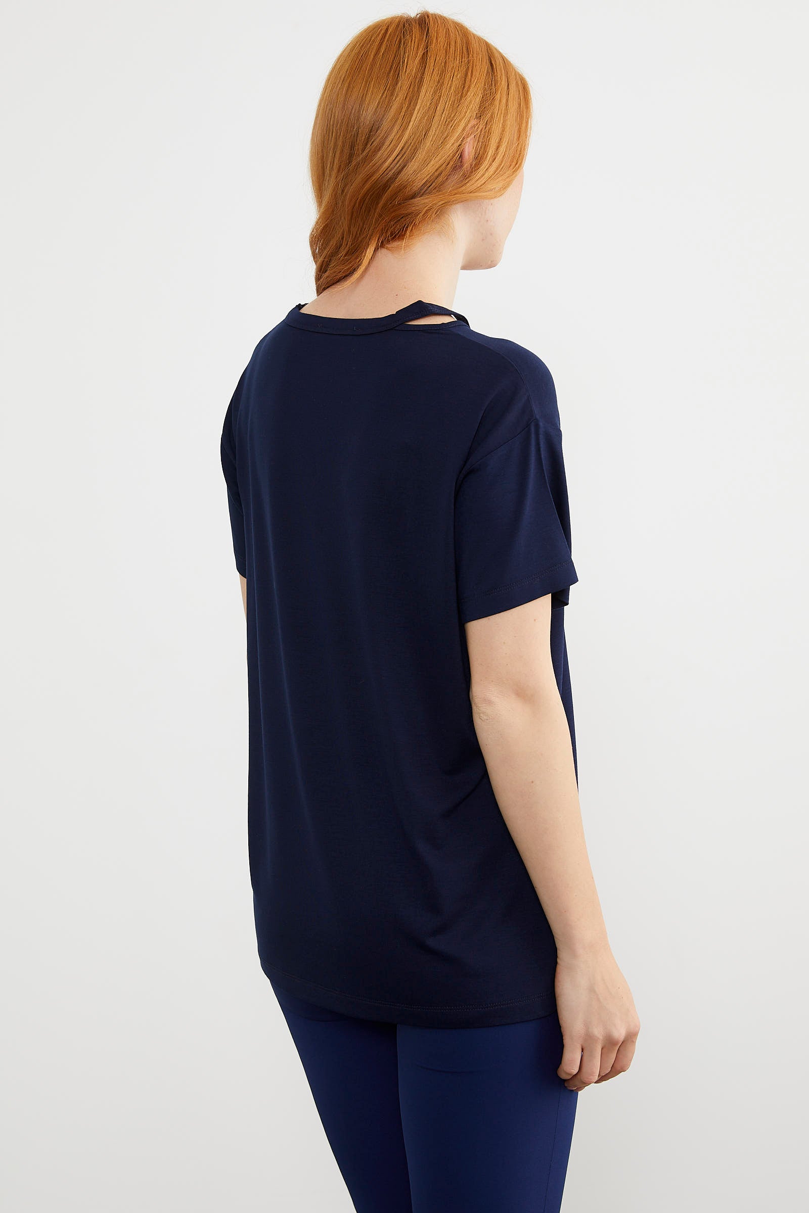 Practical t-shirt with a V-neck and elegant shoulder details. It will complement your combinations with different color options.