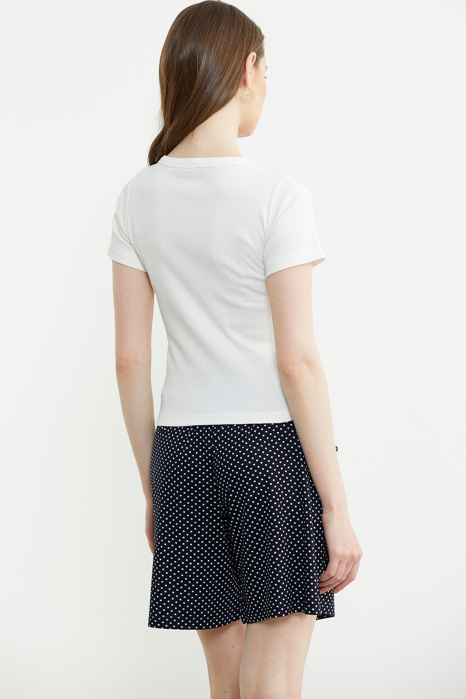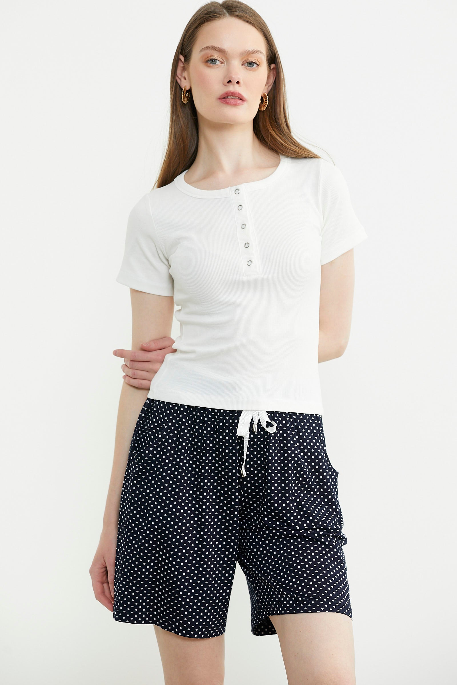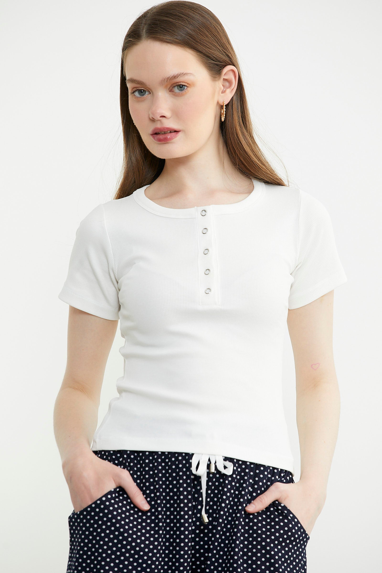 Düğmeli Kısa Kol Basic Tişört - Ekru