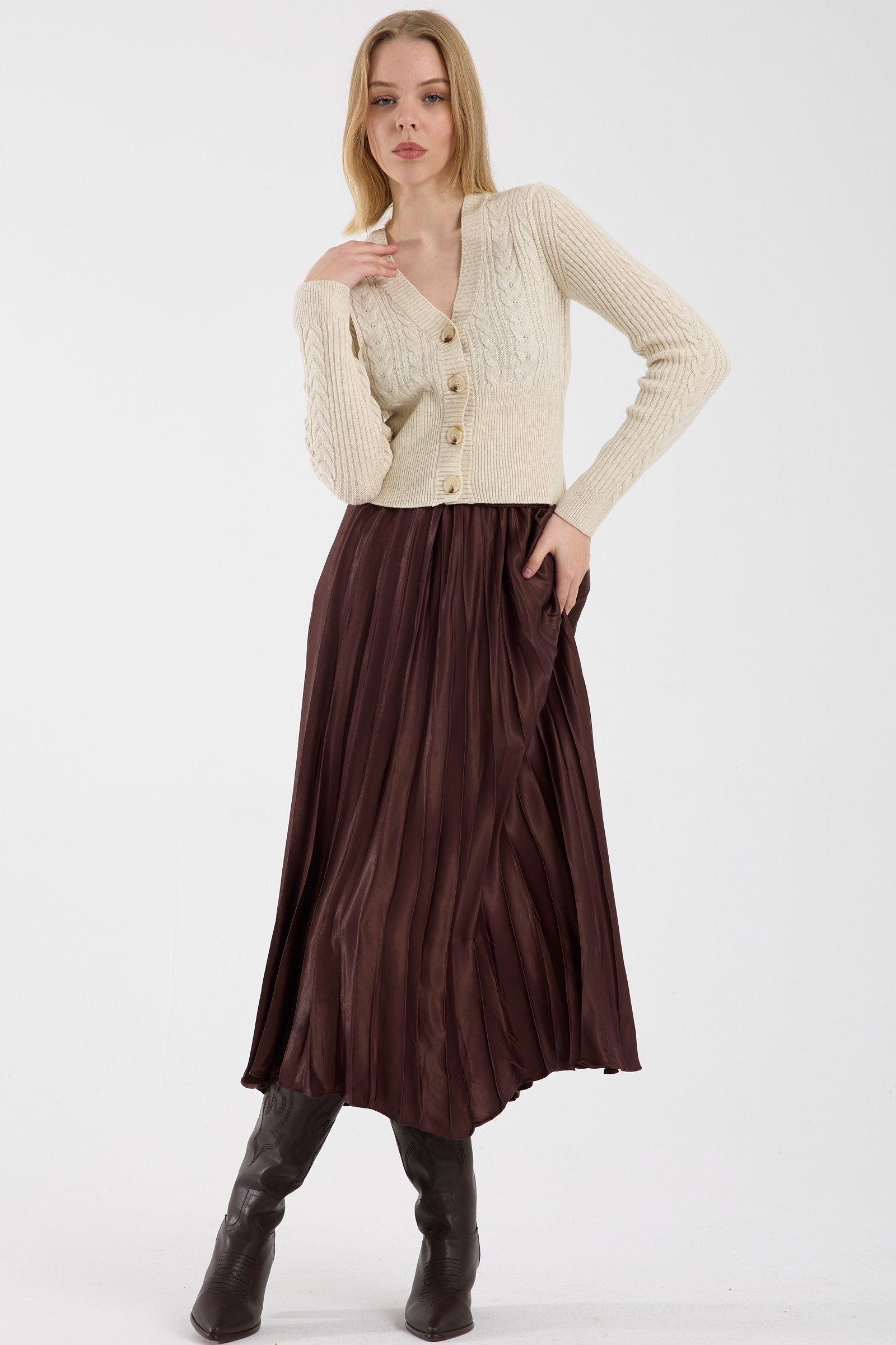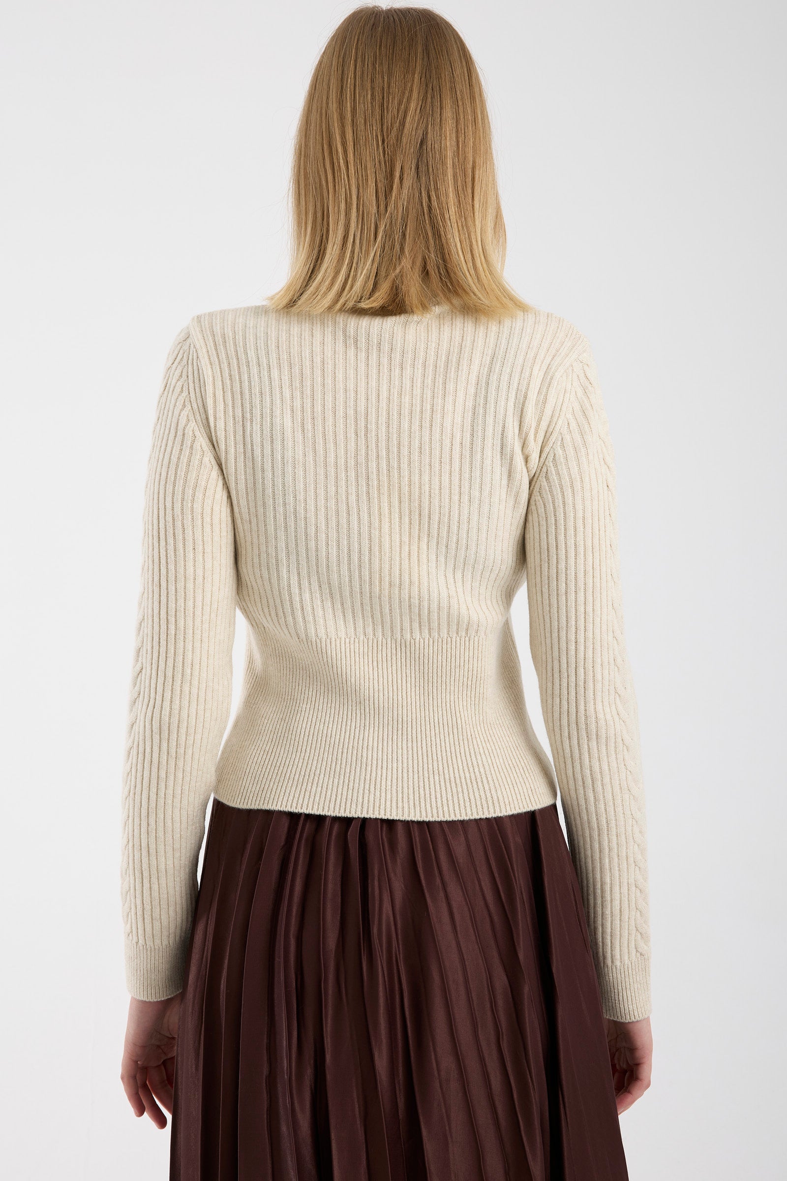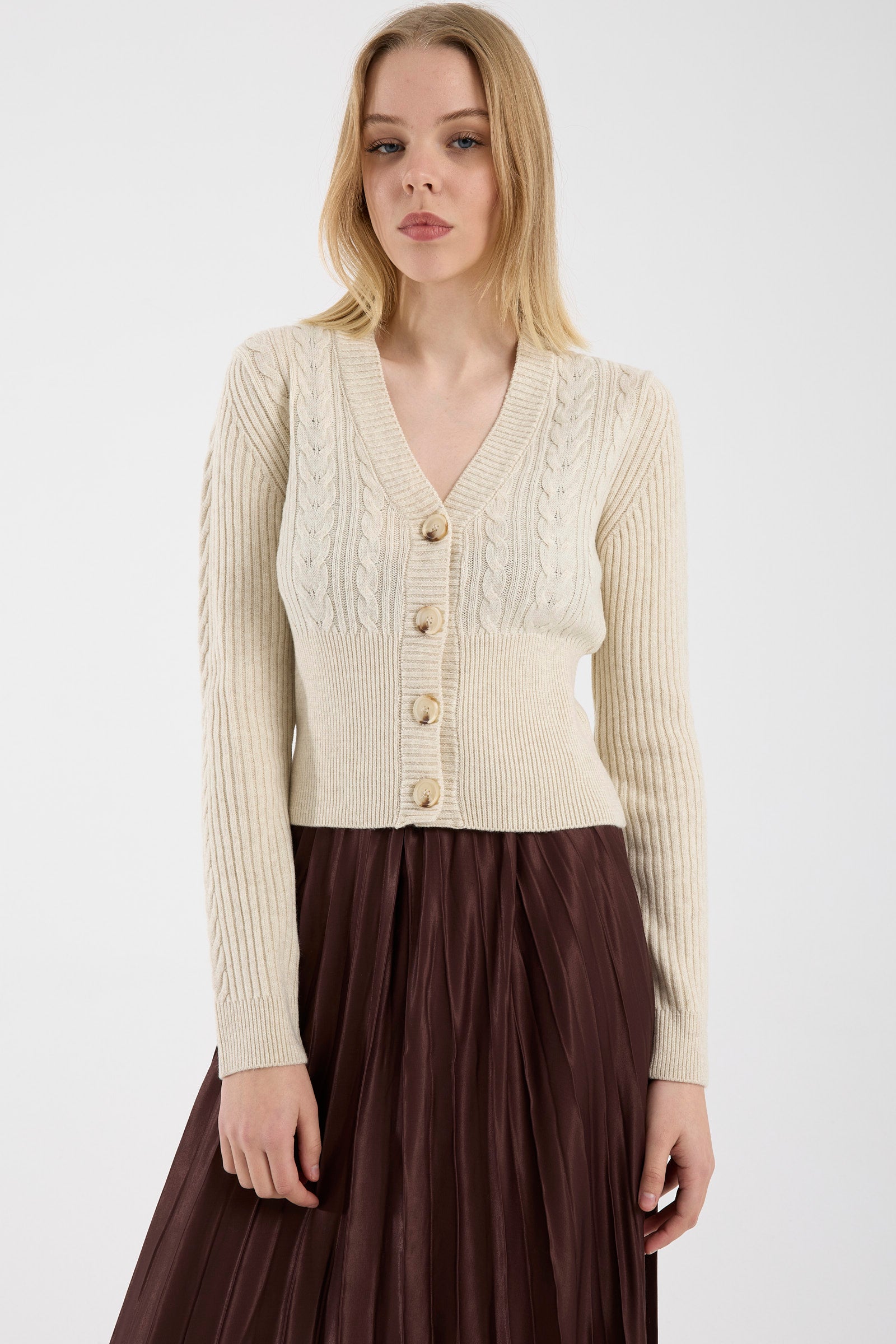 V yakalı, önü büyük düğme kapamalı kısa triko hırka. Bele oturan lastik örgü detayına sahip, saç örgü desenli.
