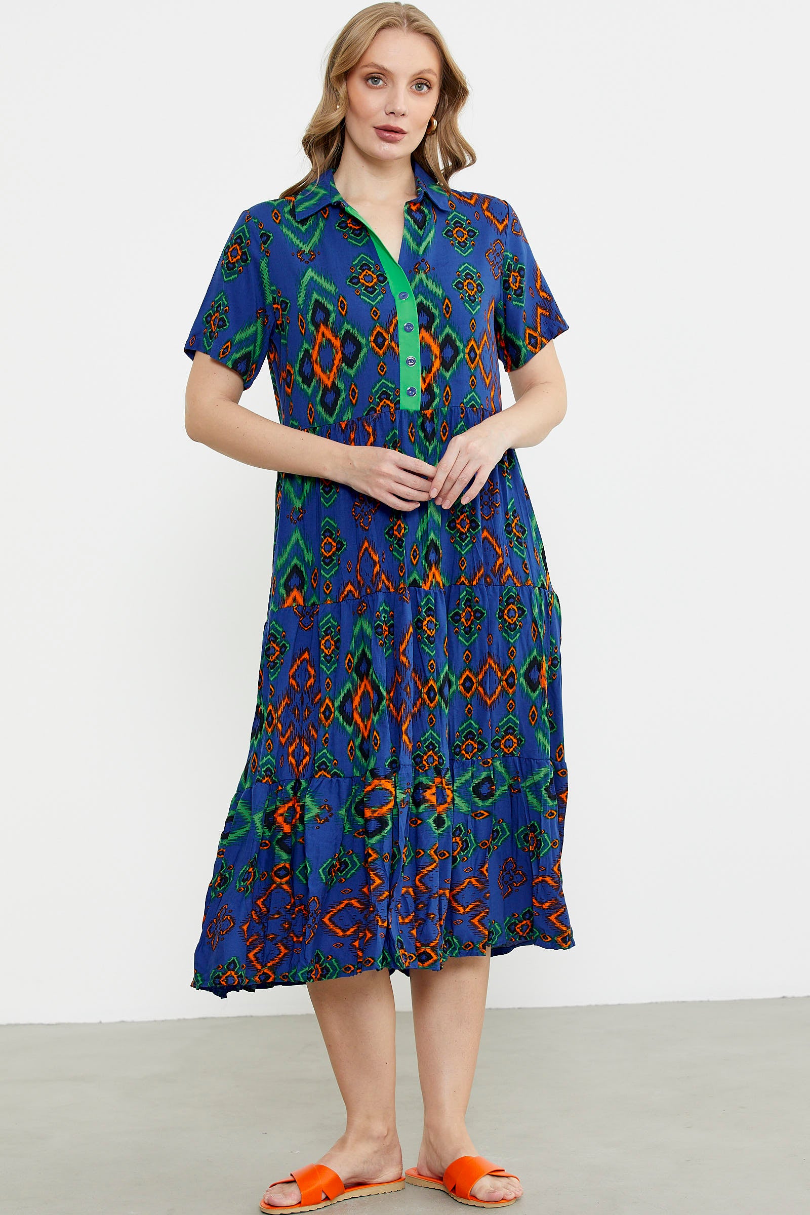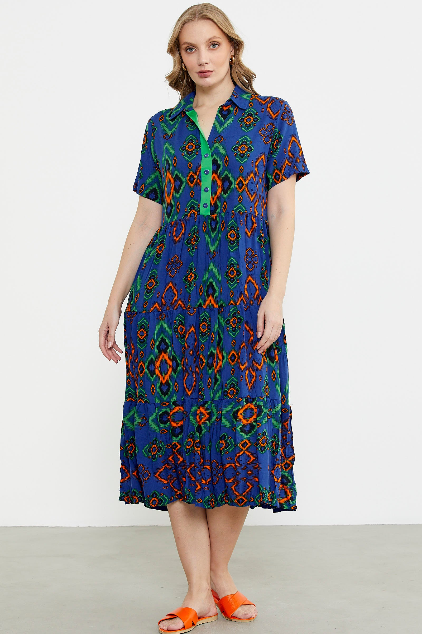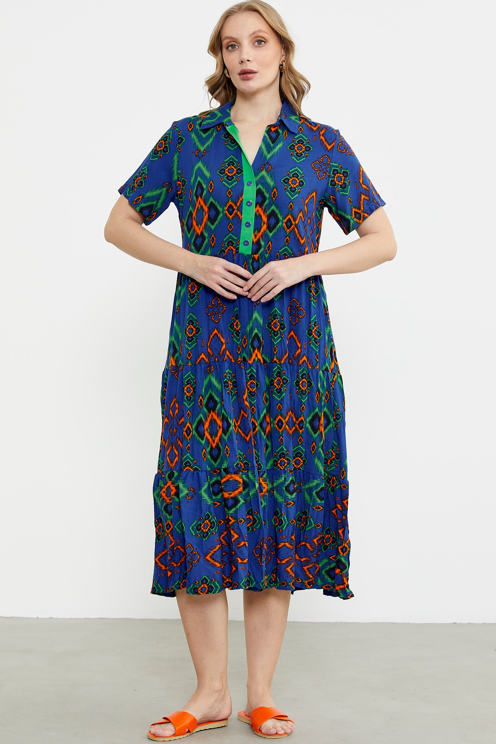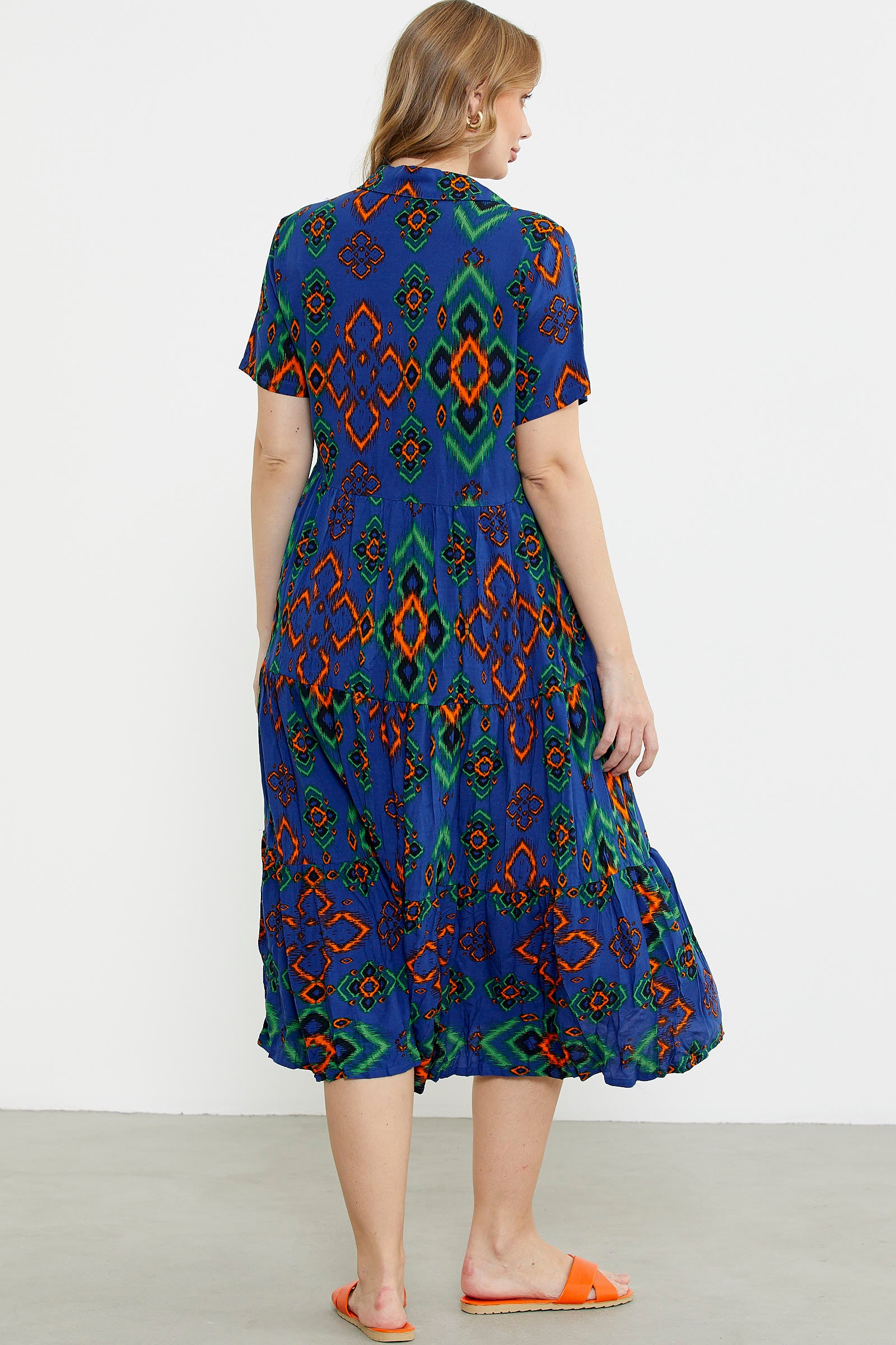 Ethnic pattern, viscose shirt collar dress. Piece detailing at waist. Comfortable fit.