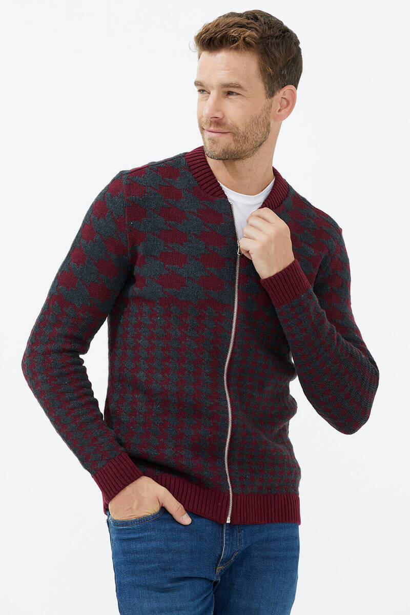 Patterned cardigan made from wool-blend yarn. Knitwear cardigan with a crew neck, long sleeves, ribbing around the neckline, cuffs and hem, and providing convenience with its full-length zipper closure.