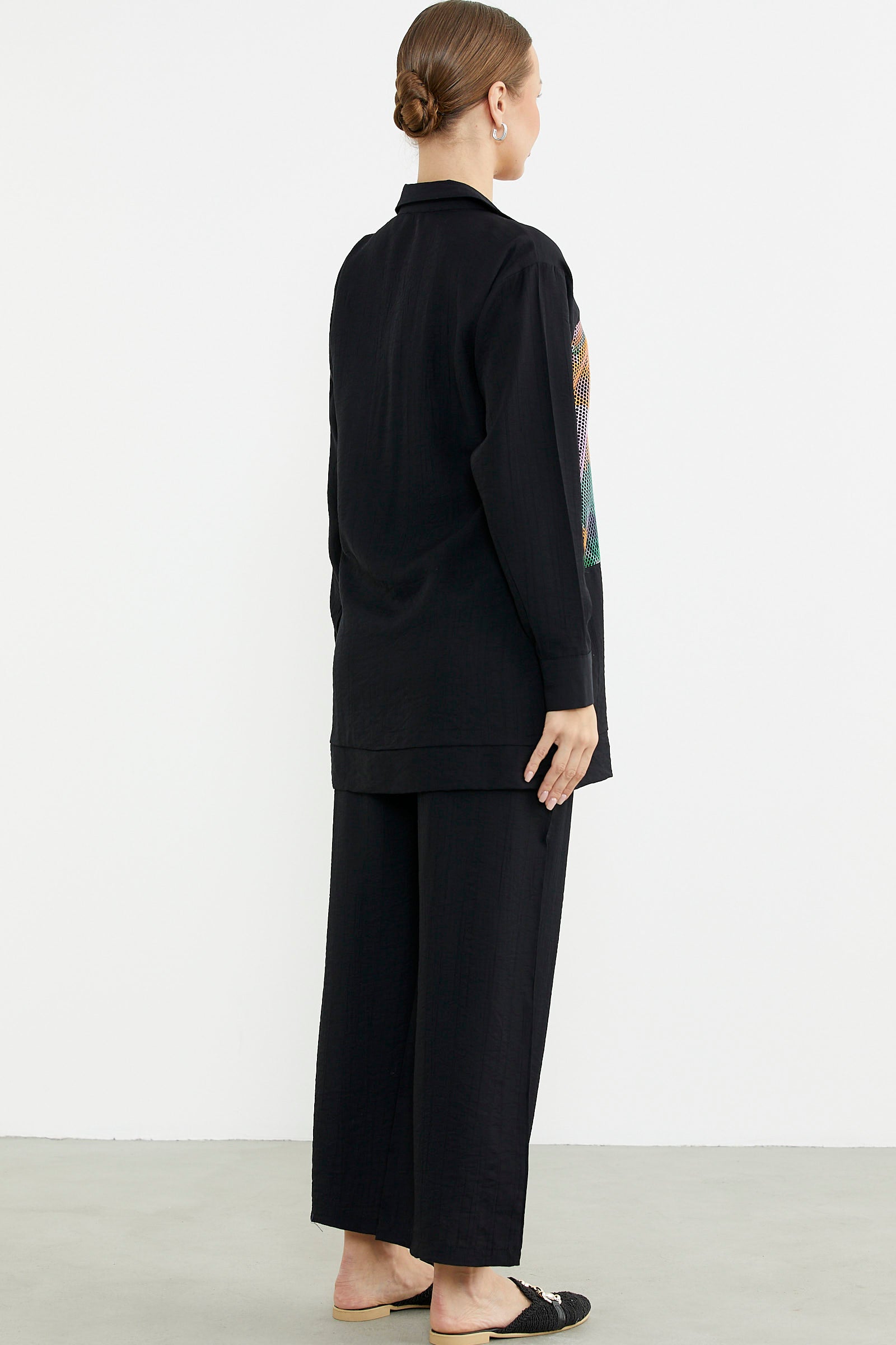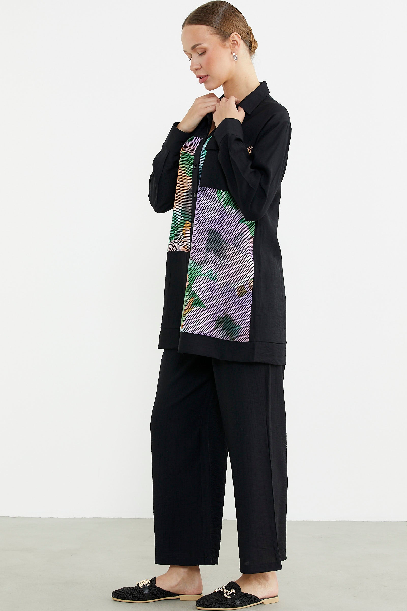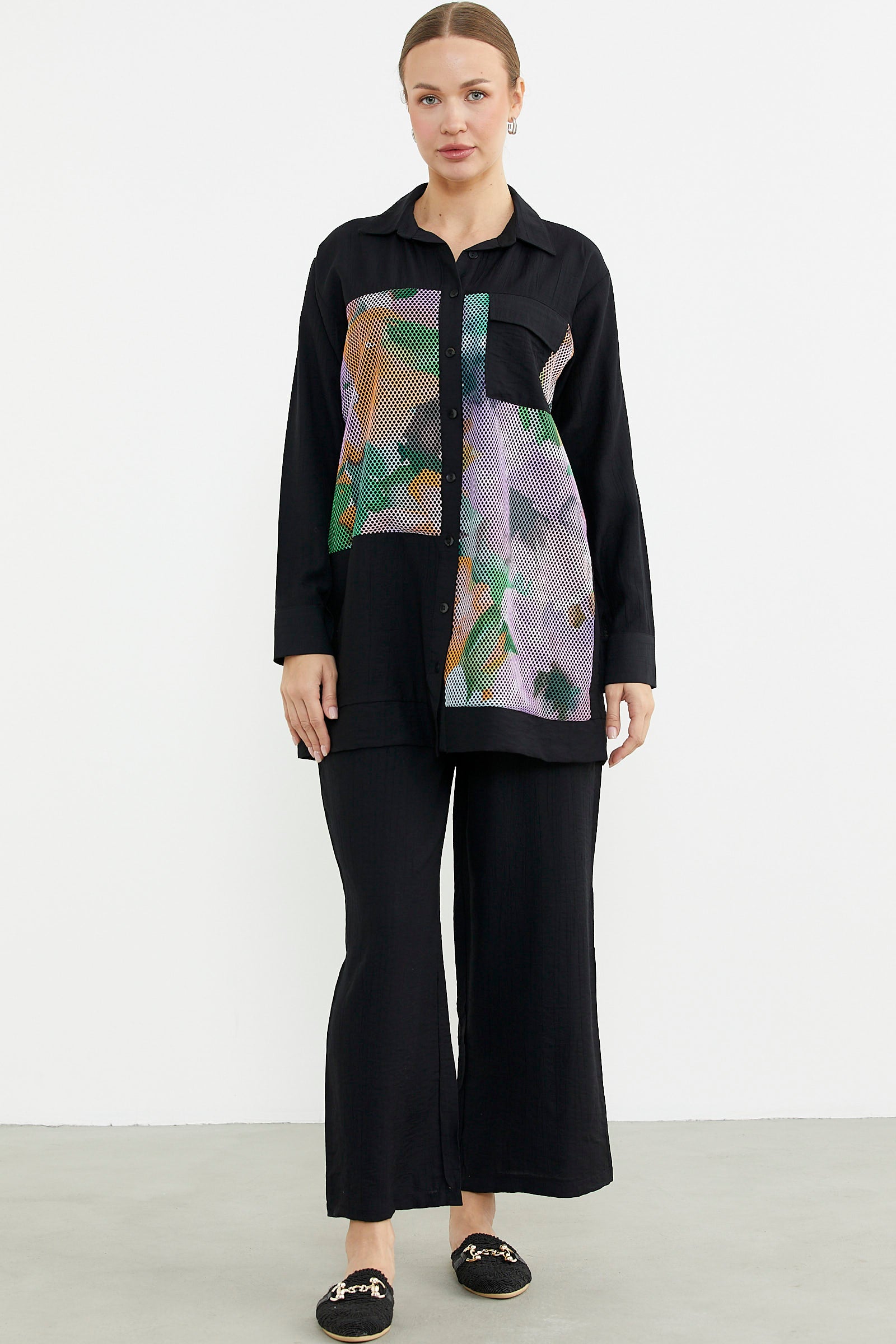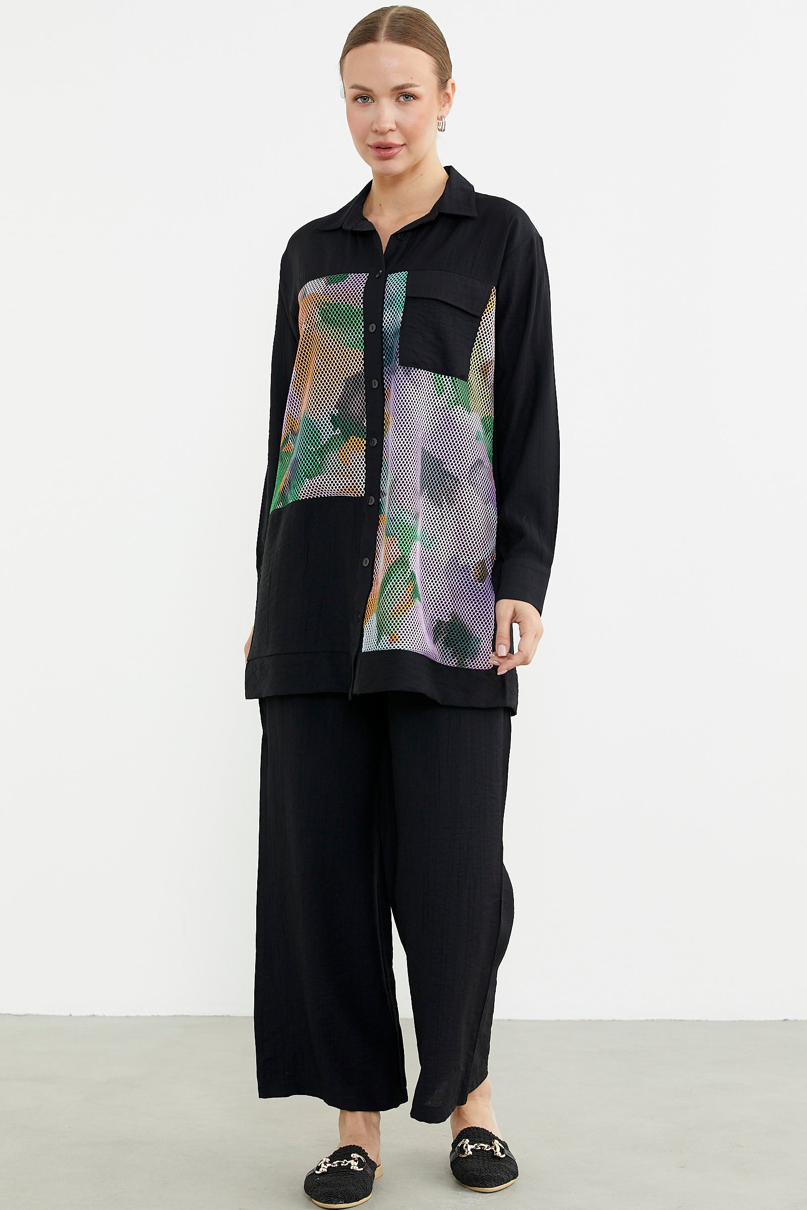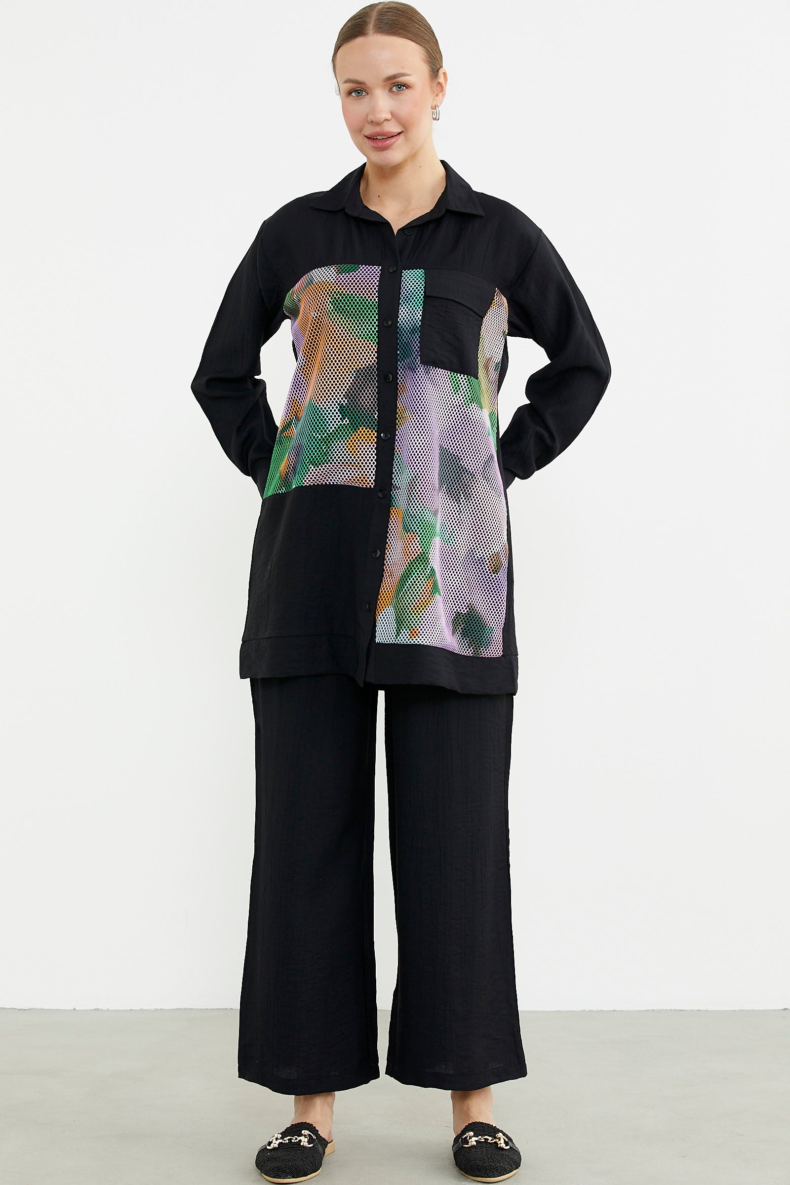 Renkli file detayı kullanılarak hareketlendirilen tunik gömleğe, bol paça rahat kalıp pantolon eşlik ediyoor. Her yaşa ve tarza uyum sağlıyor.
