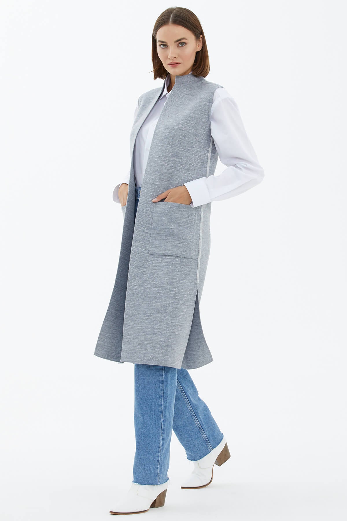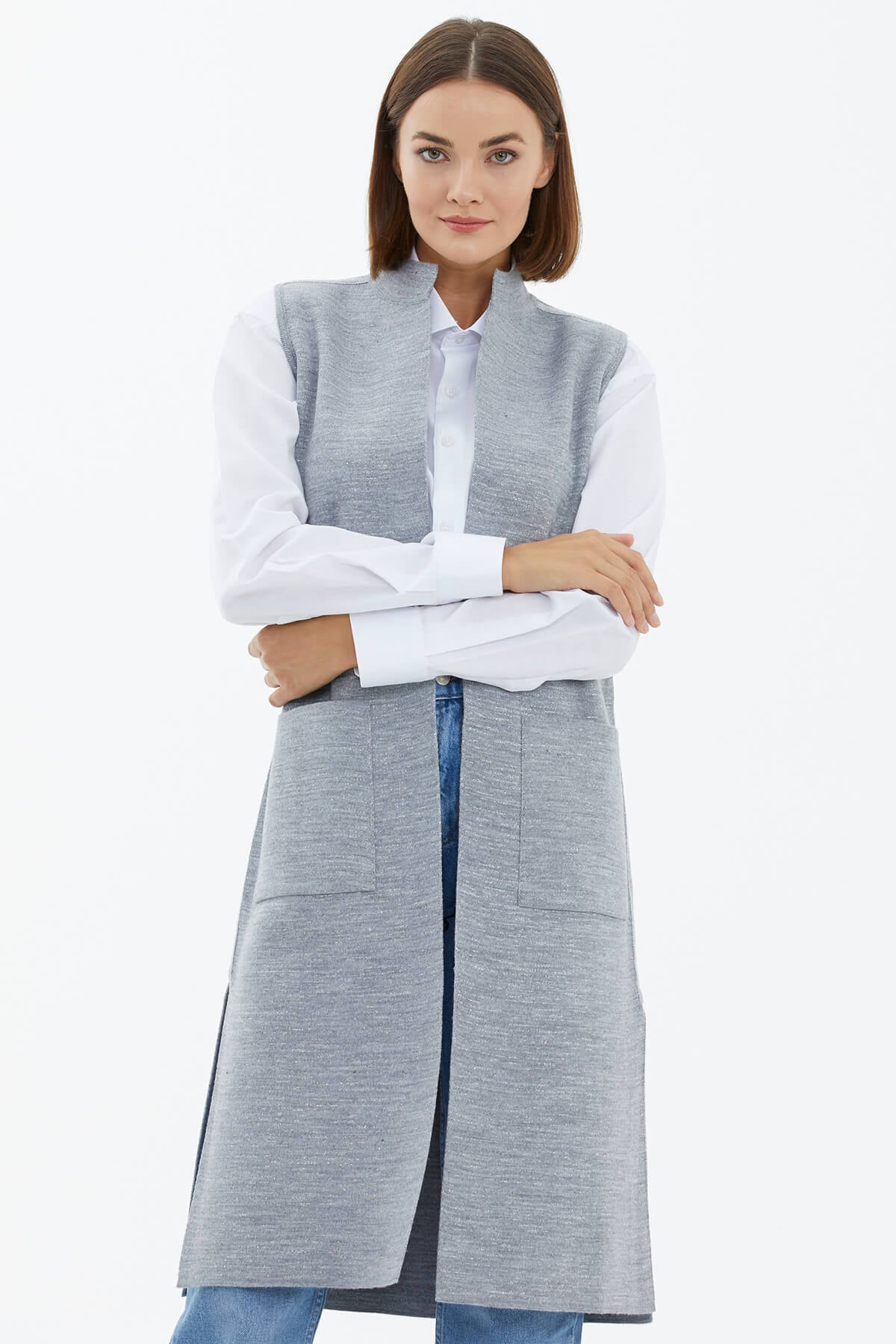 Vests, which are among the trending pieces of the season, gain a modern look with the Sementa interpretation. The knitted vest with a grandad collar, glitter and side slit details offers a stylish and comfortable option.
