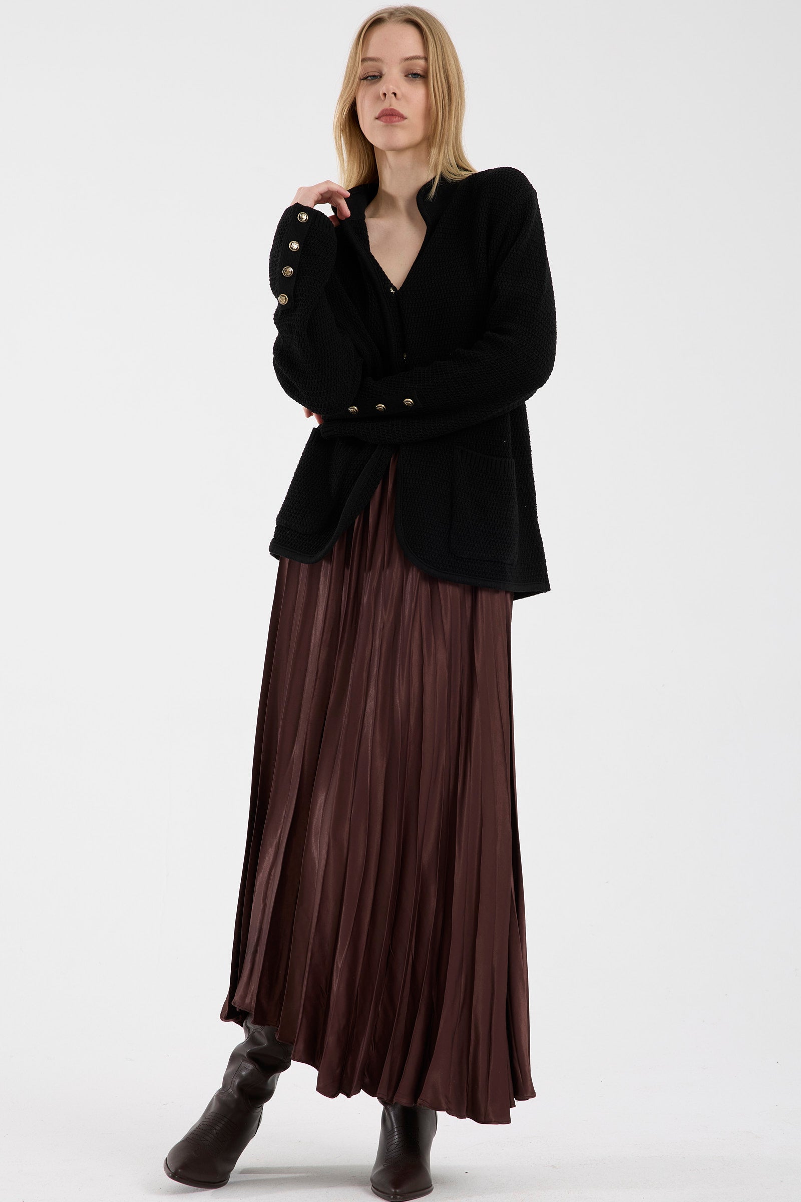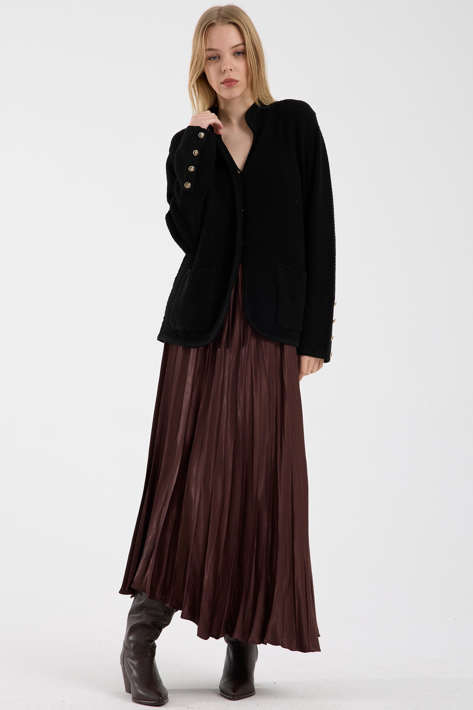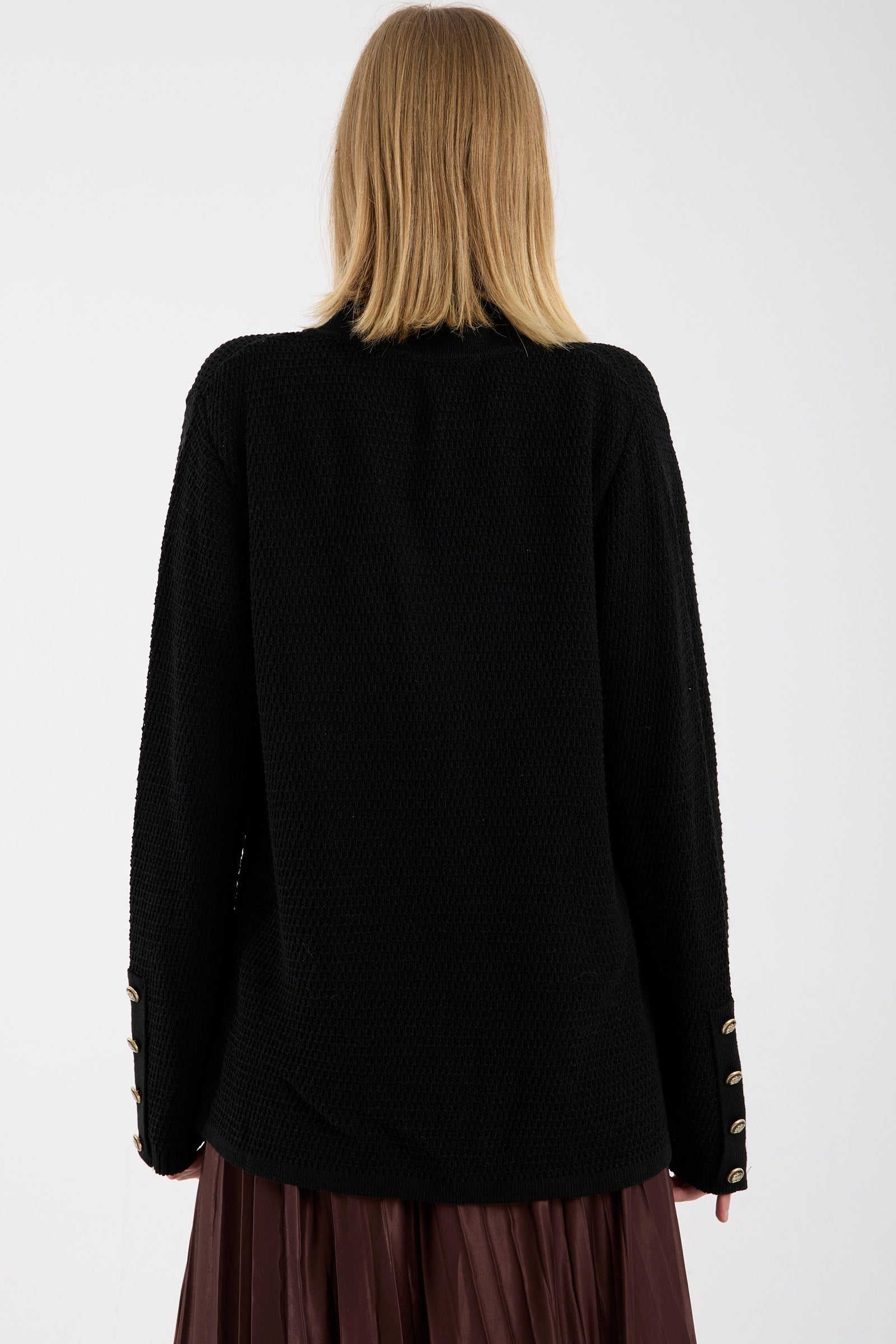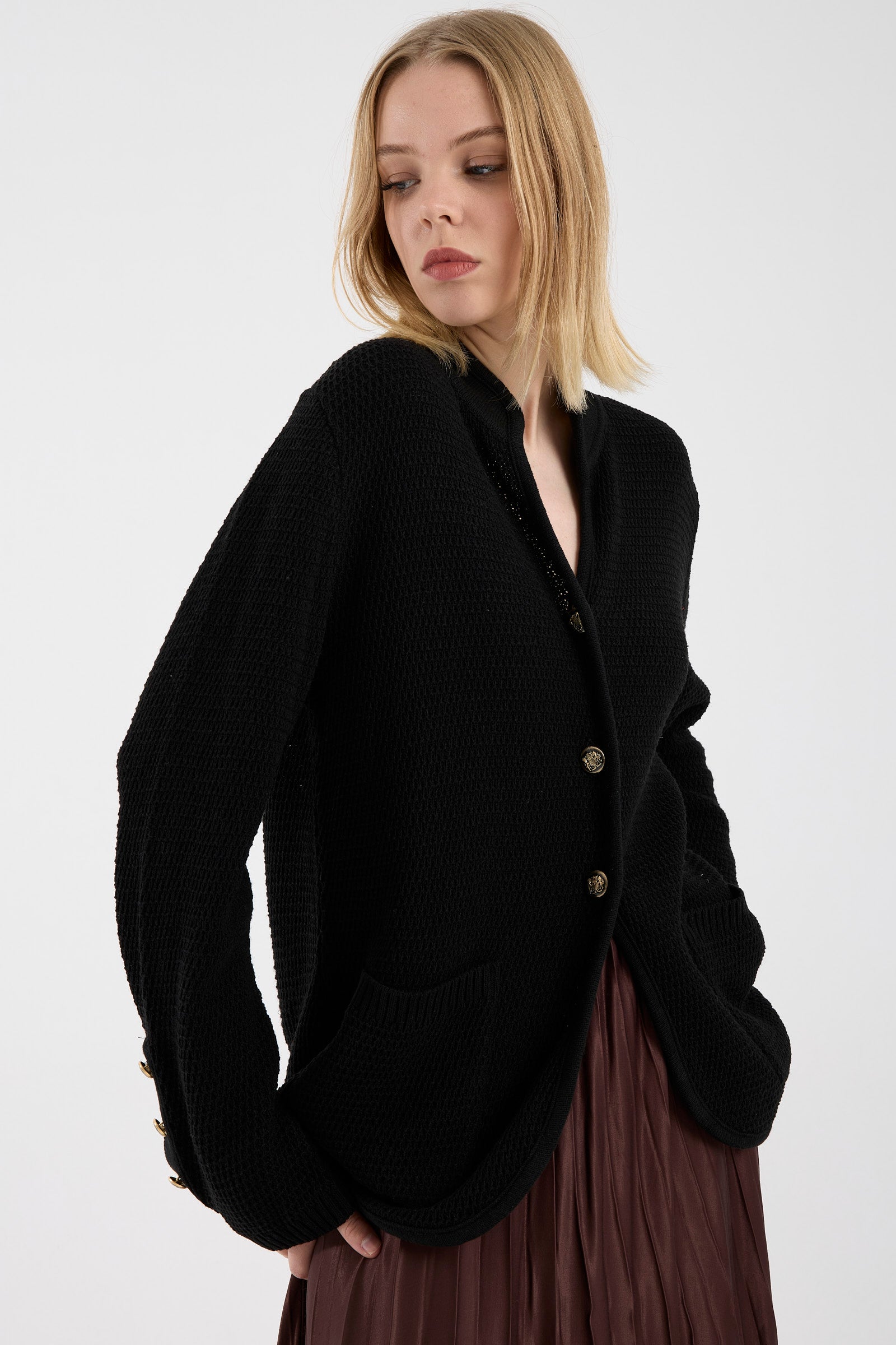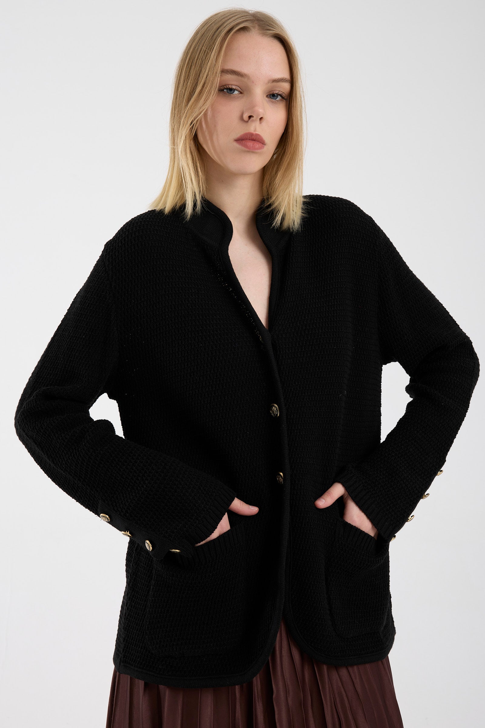 Hakim Yaka Düğmeli Yünlü Triko Ceket - Siyah