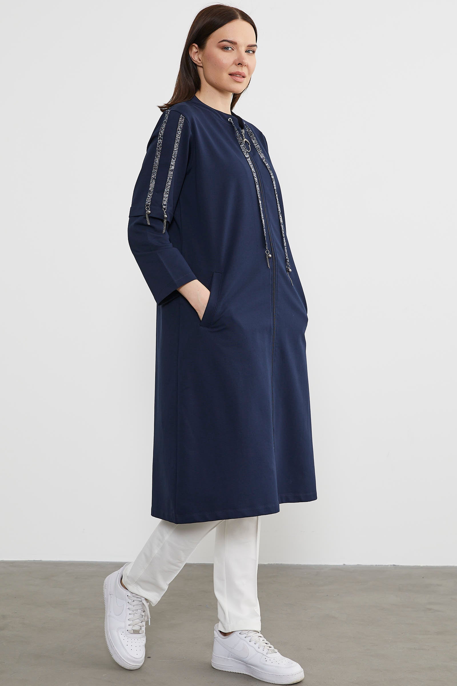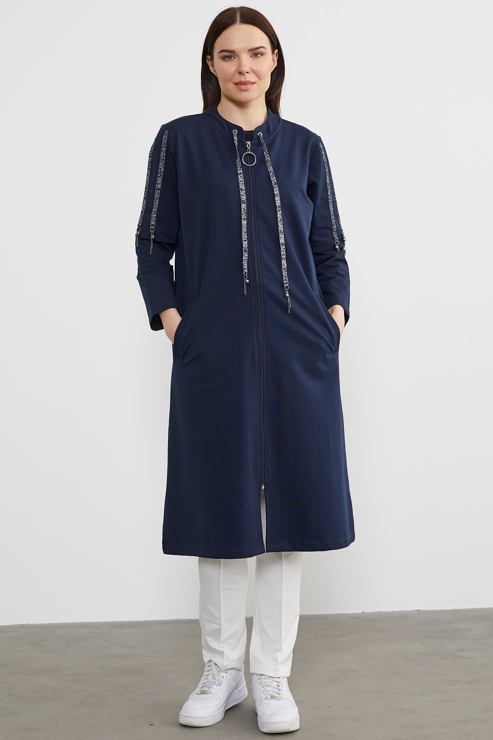 While it adds elegance with its thin striped shiny sleeve details, it will also offer you comfort and freedom of movement with its zippered design.