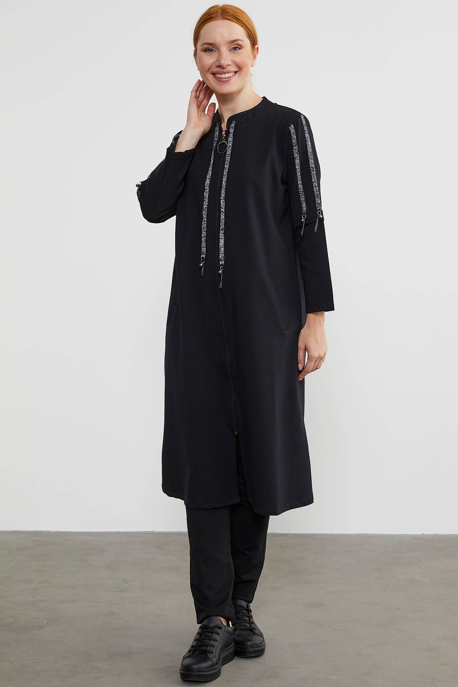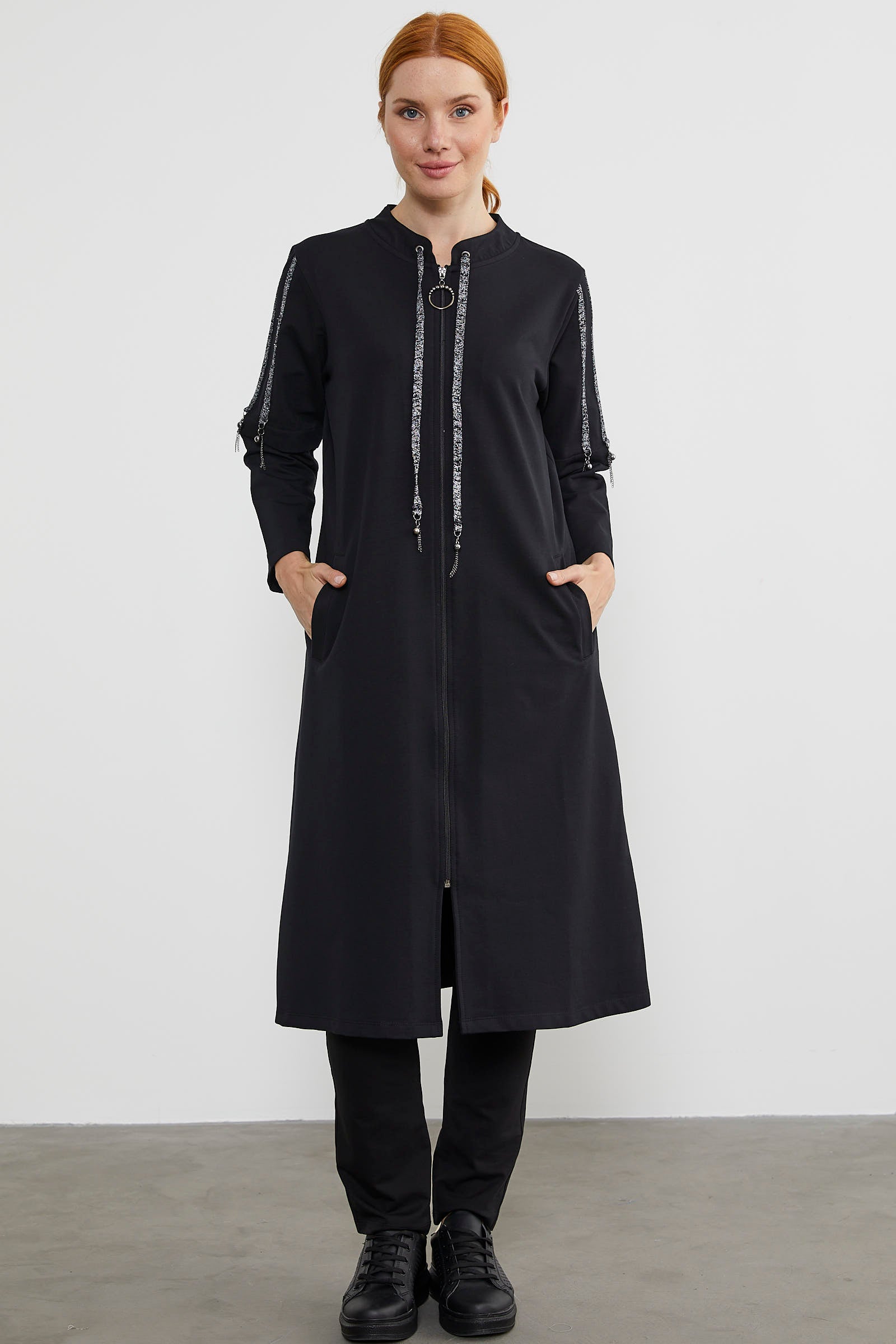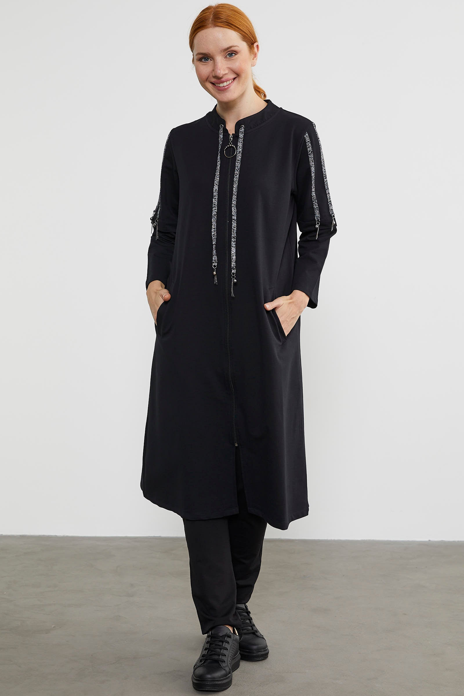 While it adds elegance with its thin striped shiny sleeve details, it will also offer you comfort and freedom of movement with its zippered design.