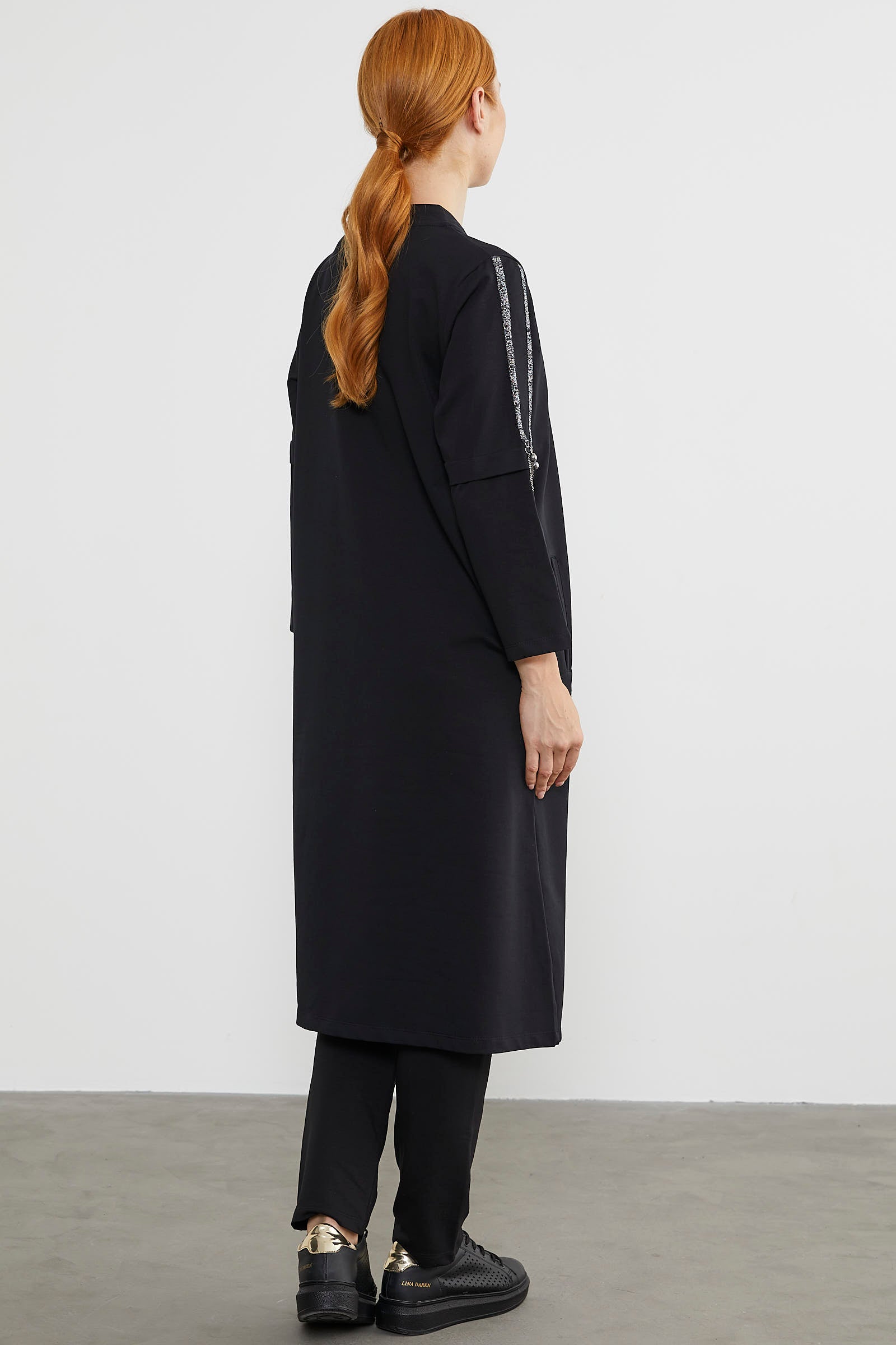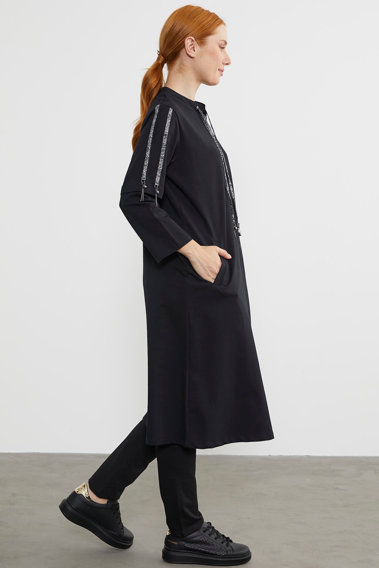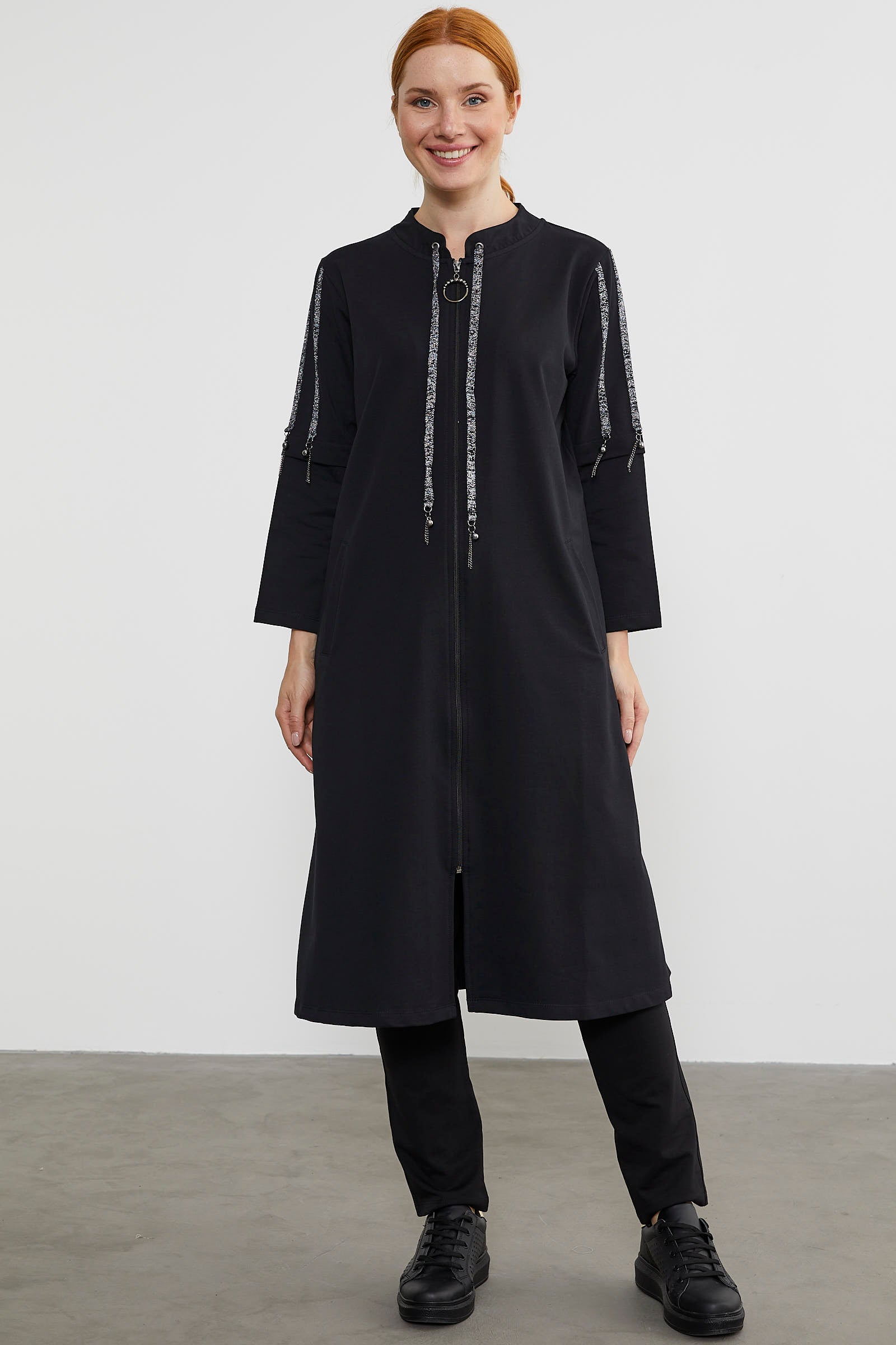 While it adds elegance with its thin striped shiny sleeve details, it will also offer you comfort and freedom of movement with its zippered design.