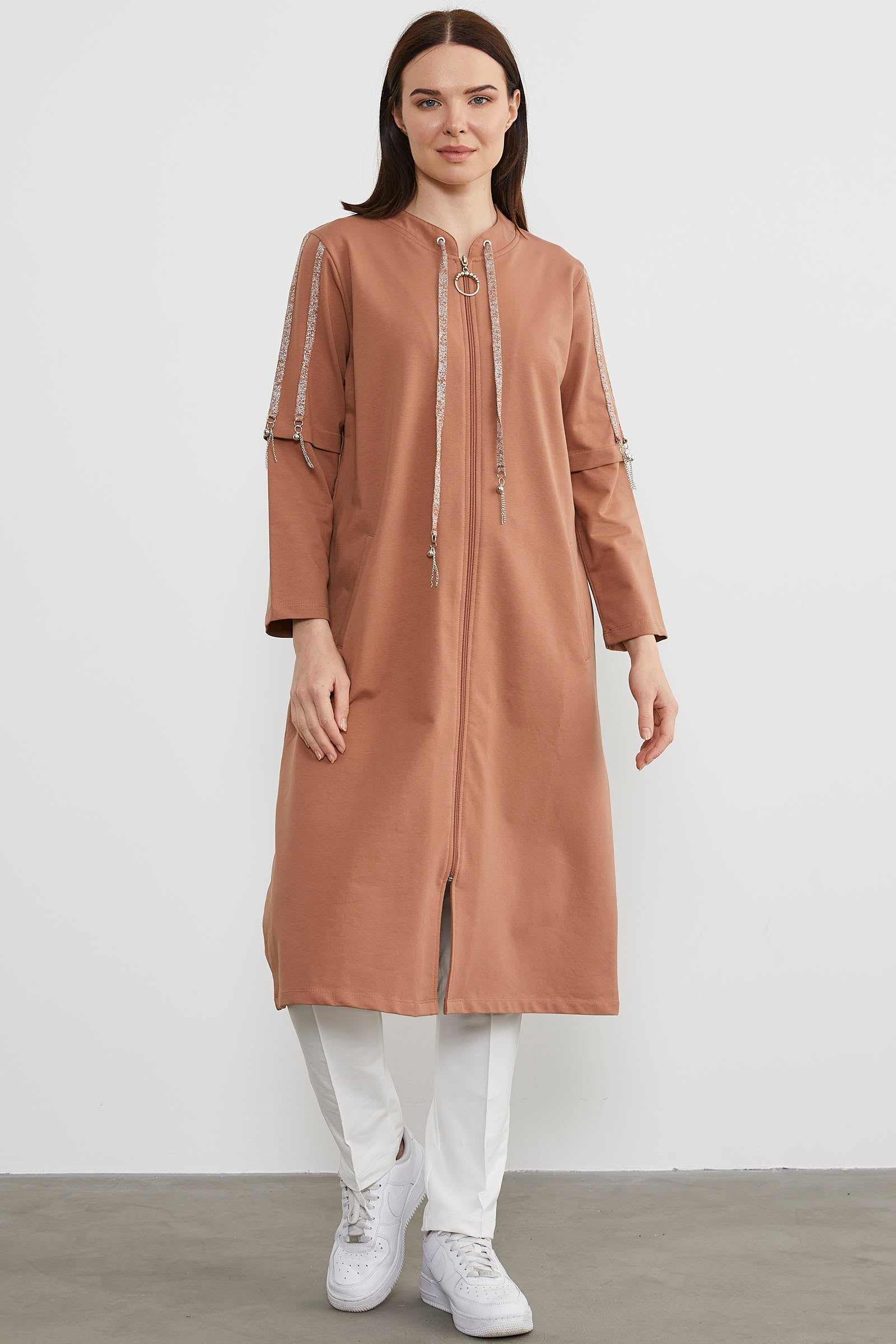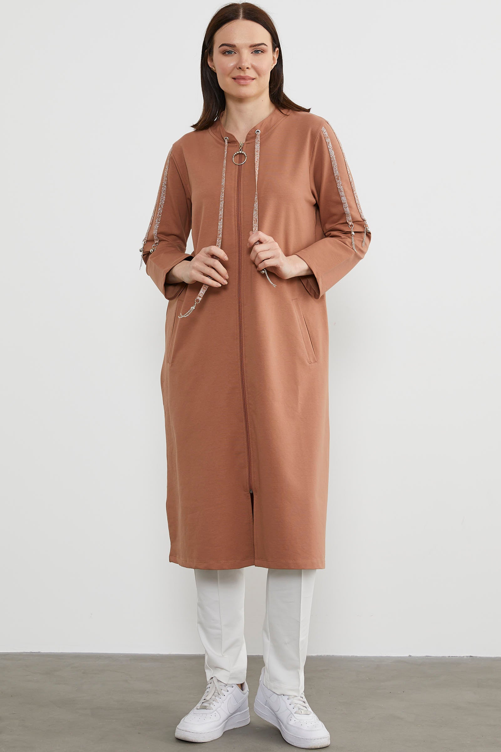 While it adds elegance with its thin striped shiny sleeve details, it will also offer you comfort and freedom of movement with its zippered design.