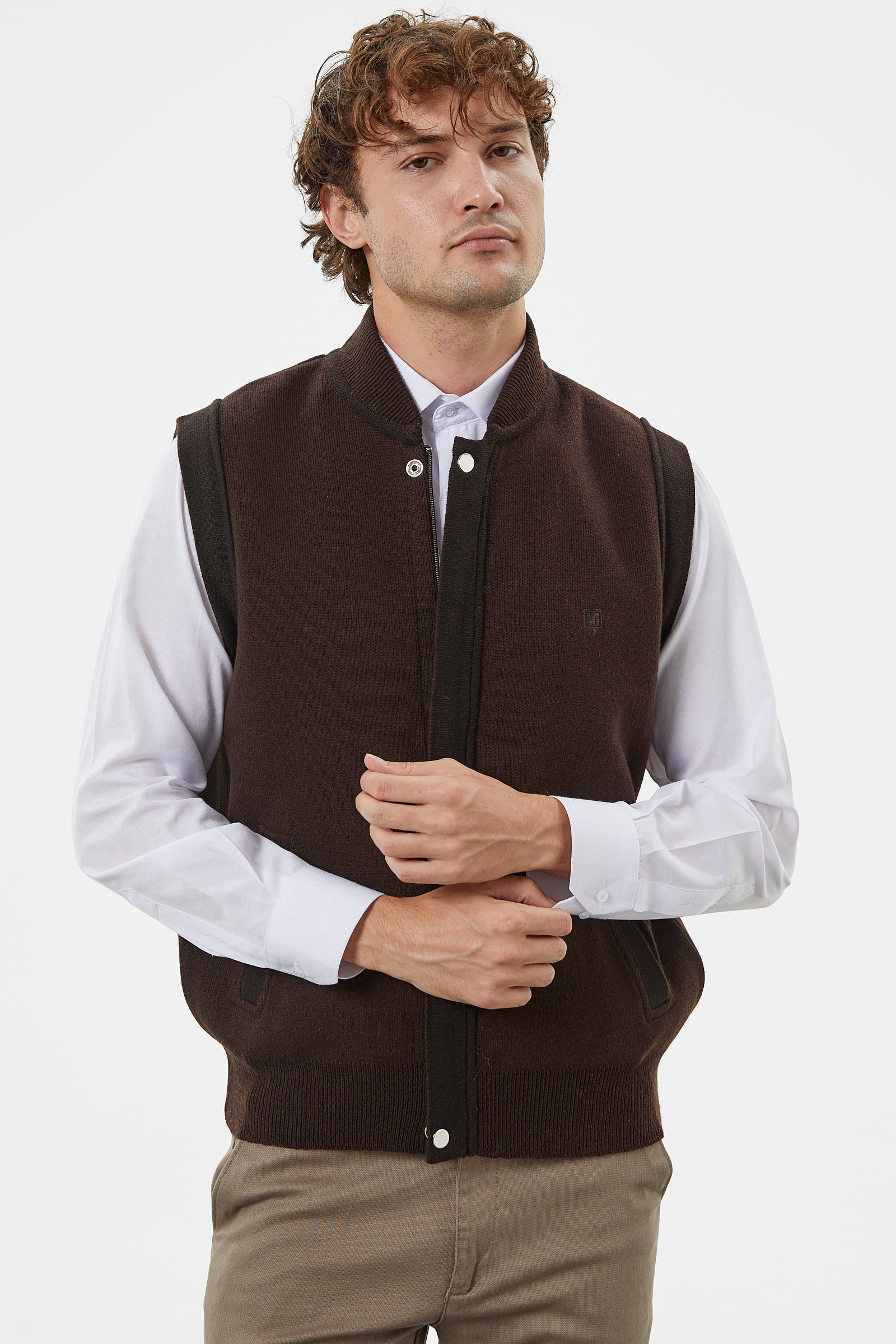 Conquer hearts with the knitted vest with a crew neck, full-length zipper and two side pockets. A complementary piece that will keep you warm with its wool content on cold days and can be easily combined.