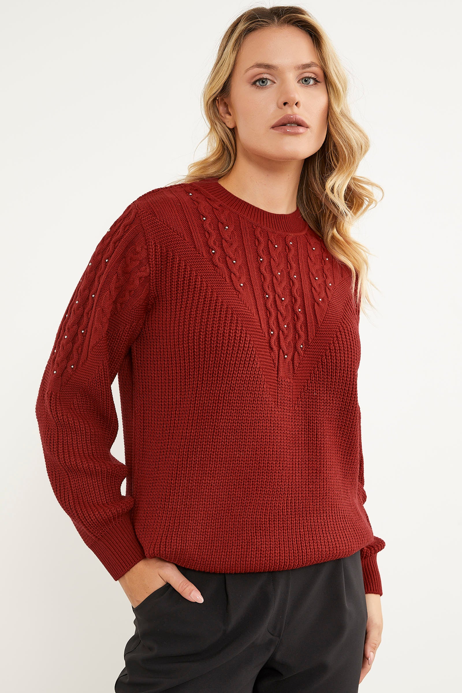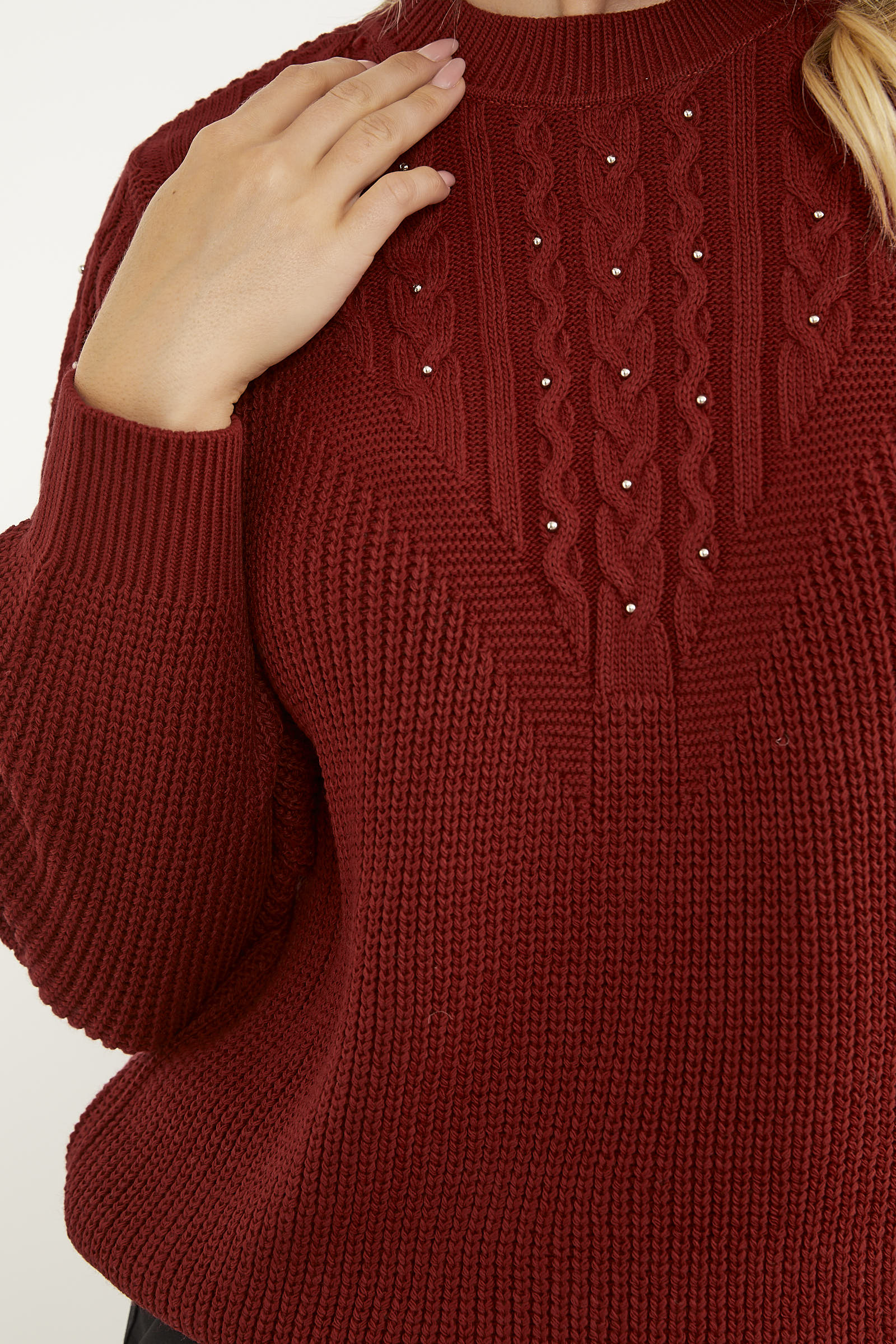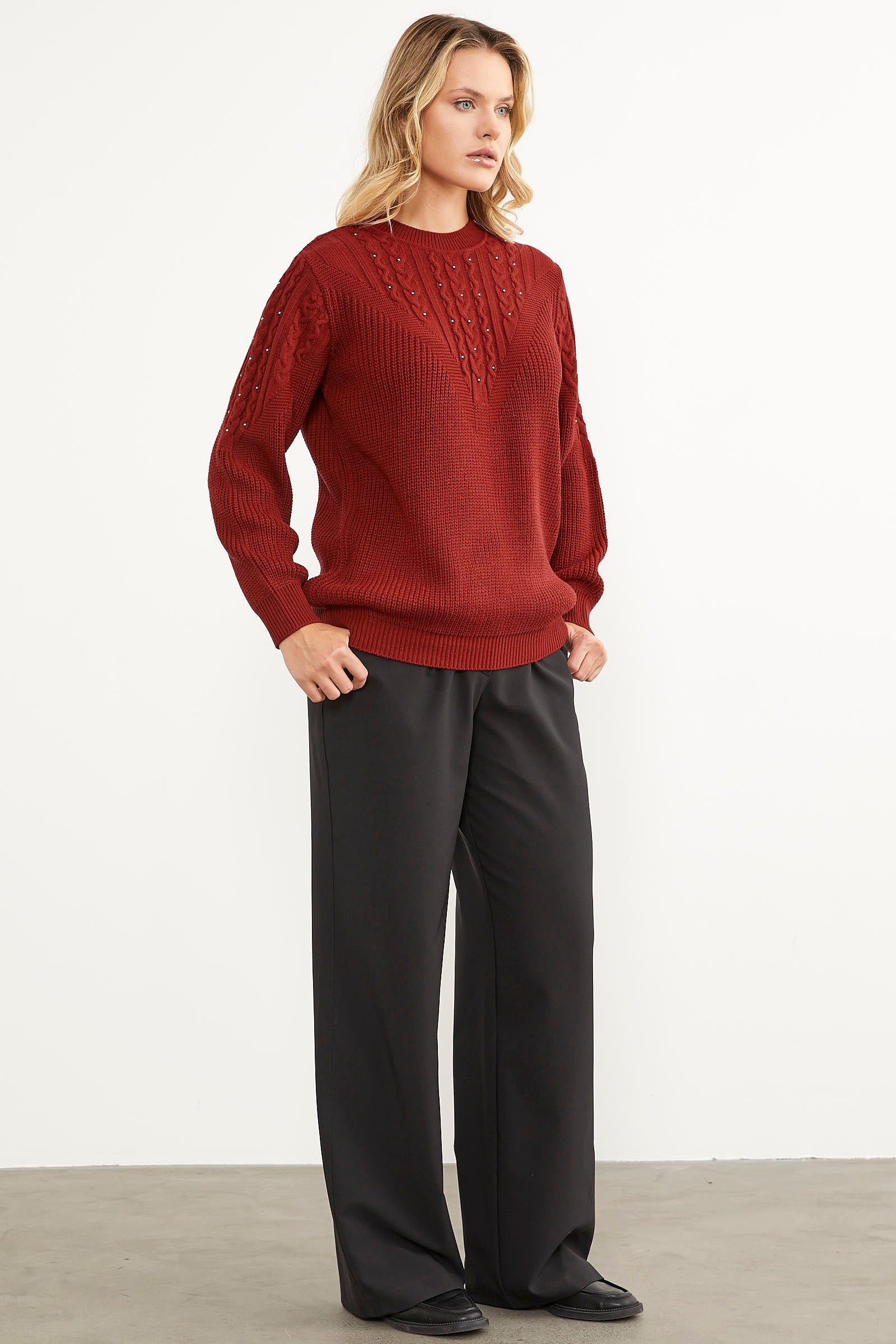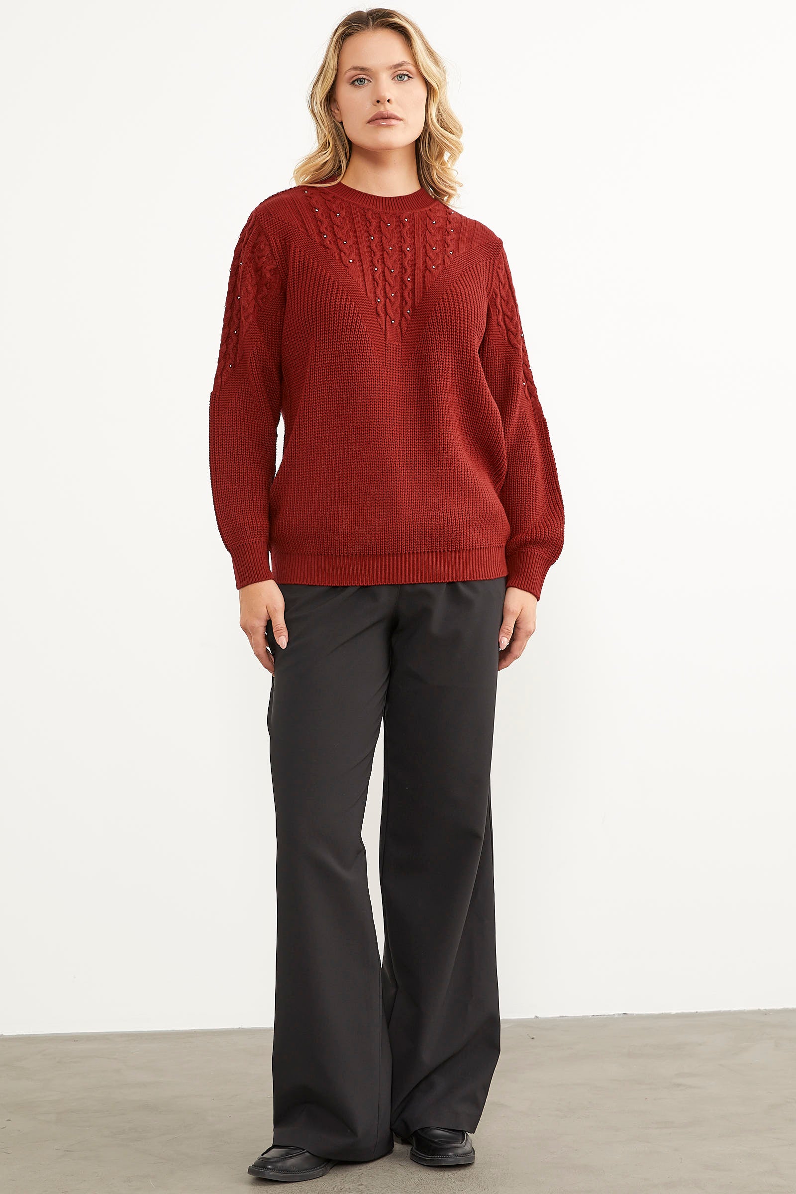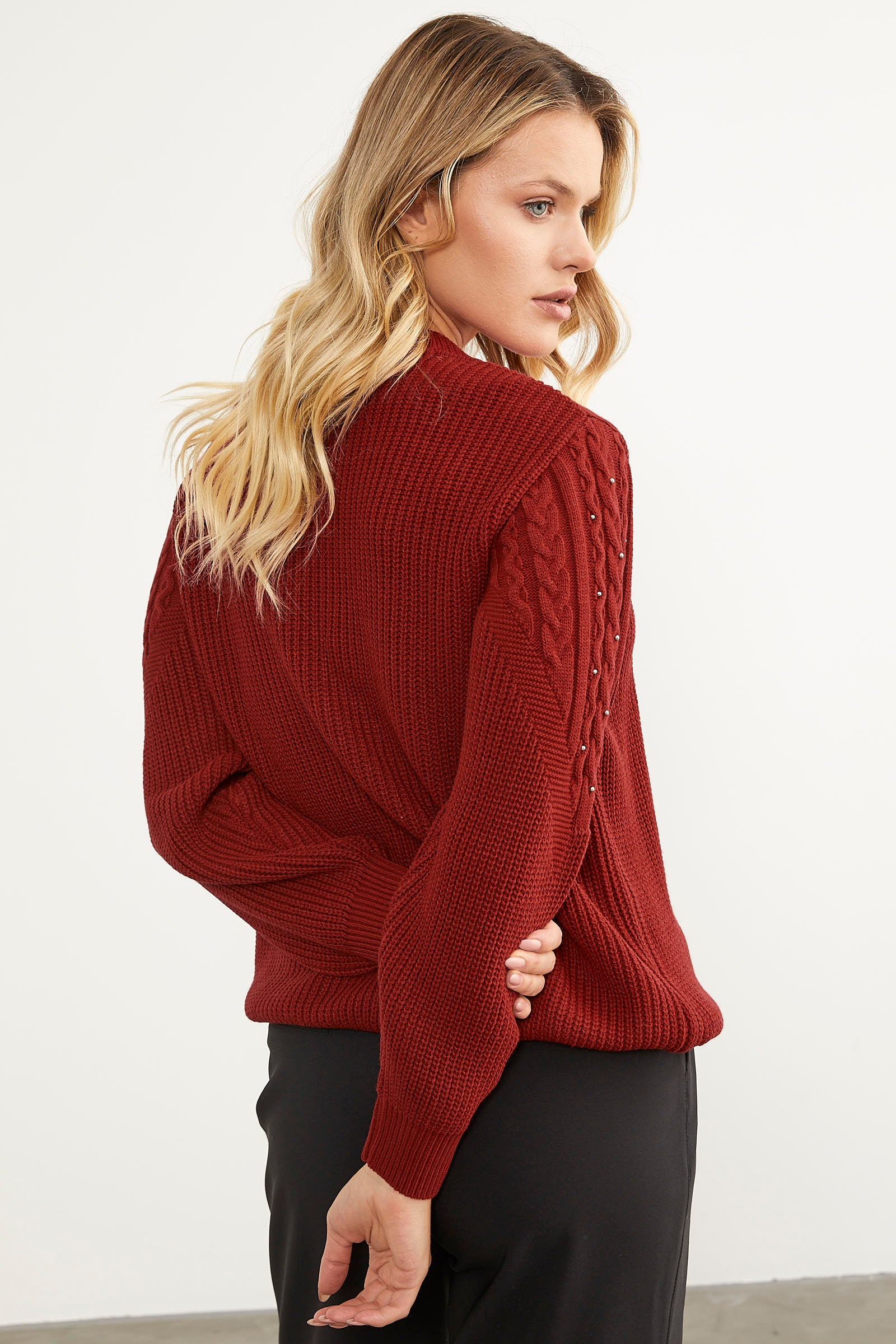 The knitted sweater with knitted front and sleeves and pearl details and a plain back creates an elegant and stylish look with its heart-winning design. This piece, which allows you to feel magnificent while preserving your daily simplicity, promises comfort with its flexible texture.