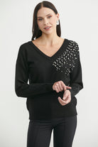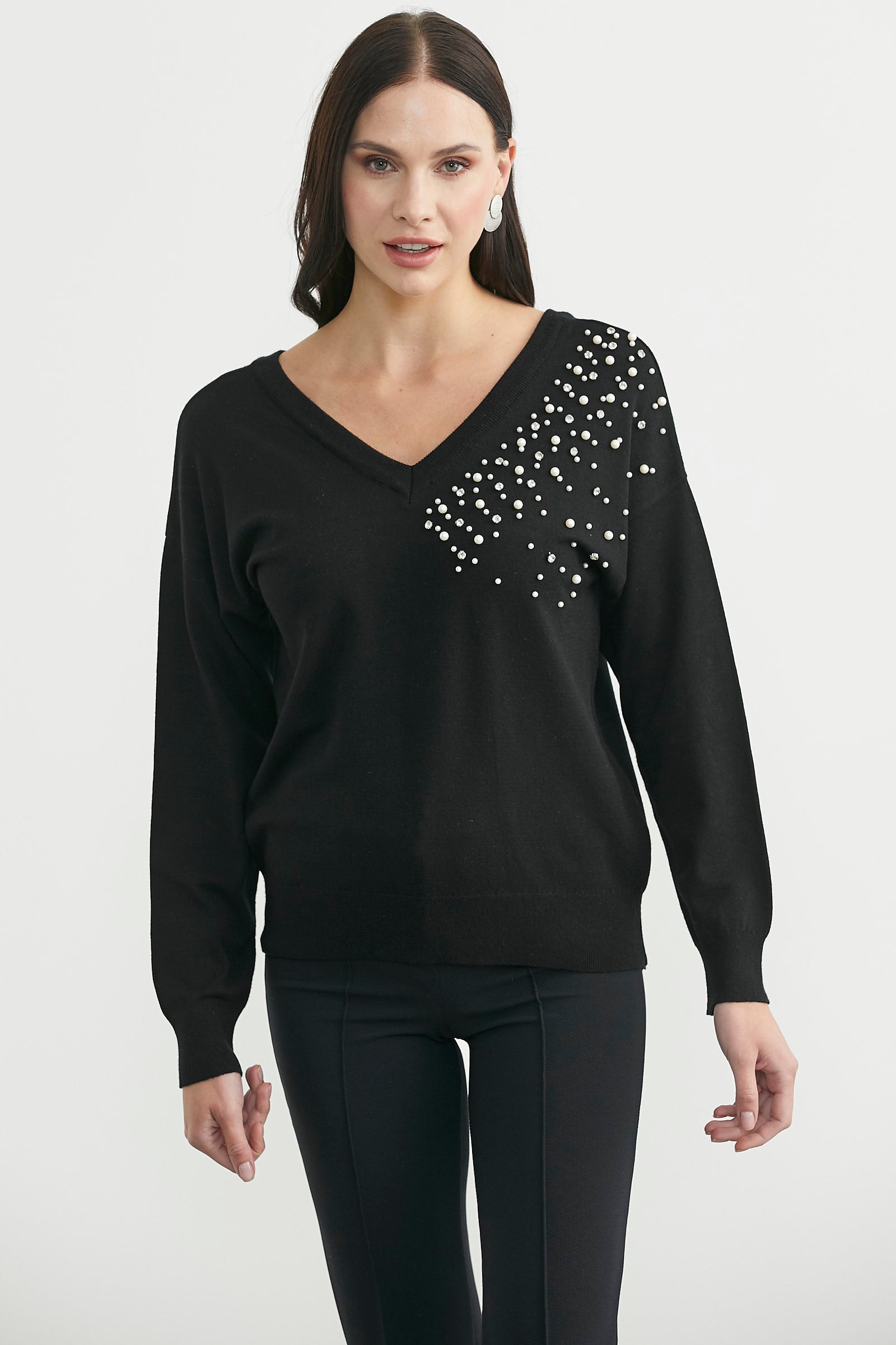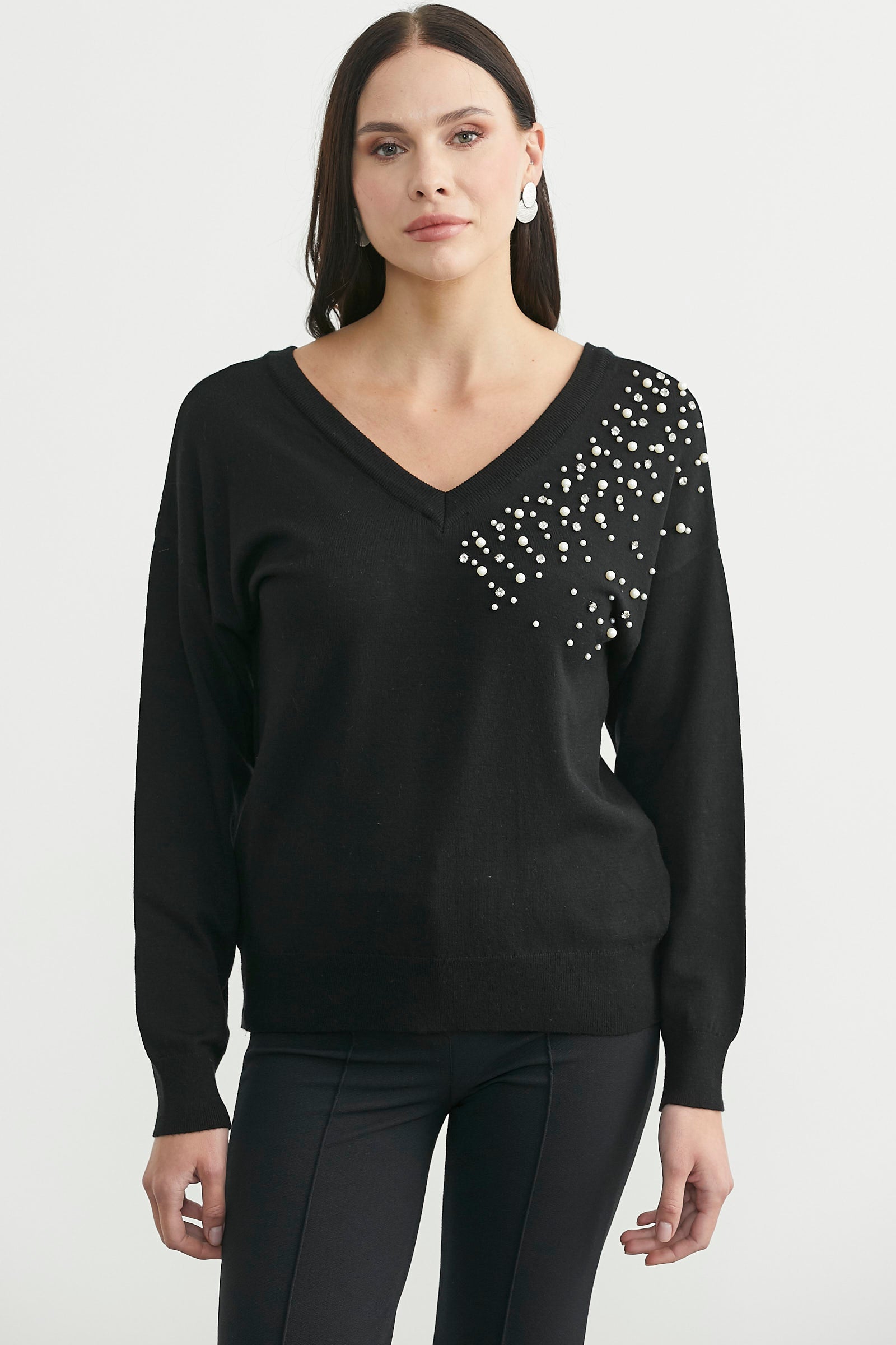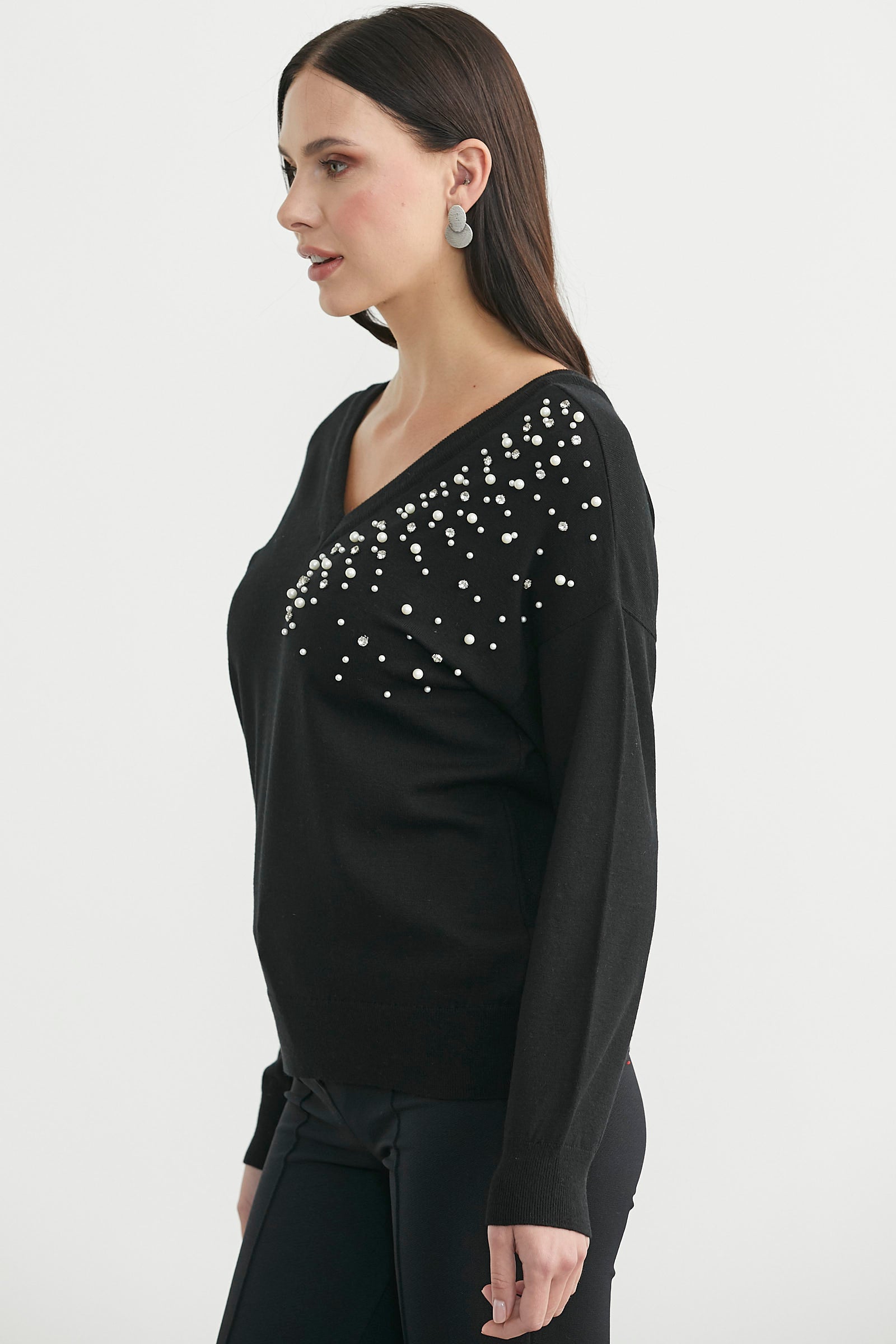İnci Detaylı V Yaka Triko Kazak - Siyah