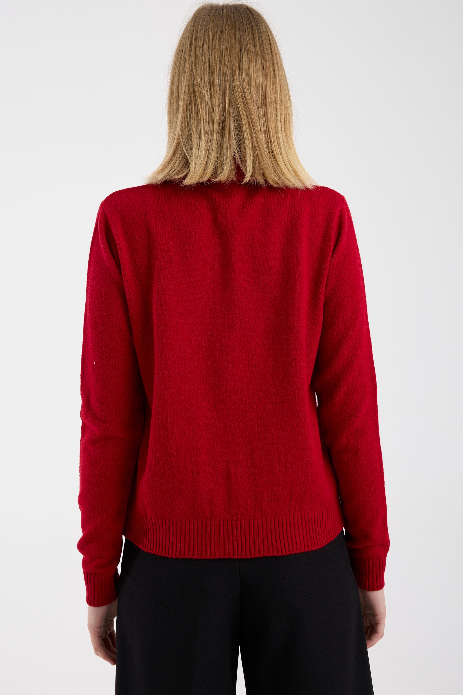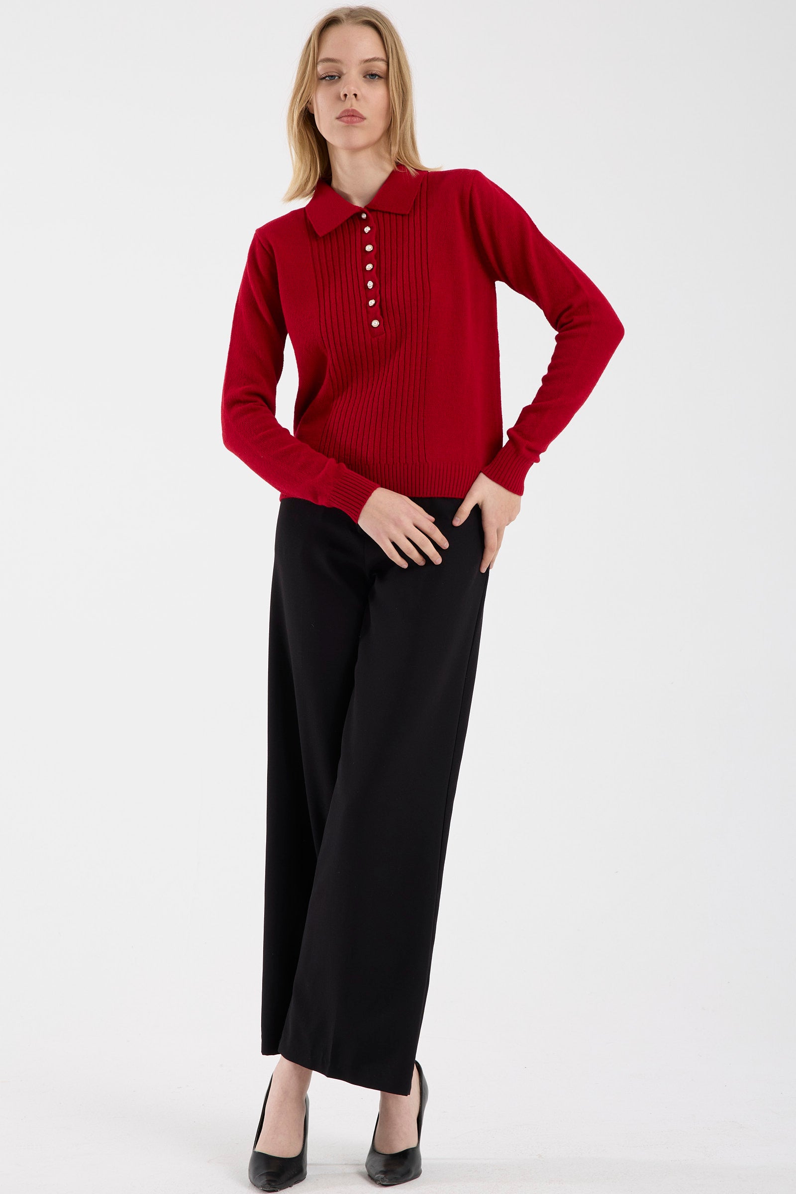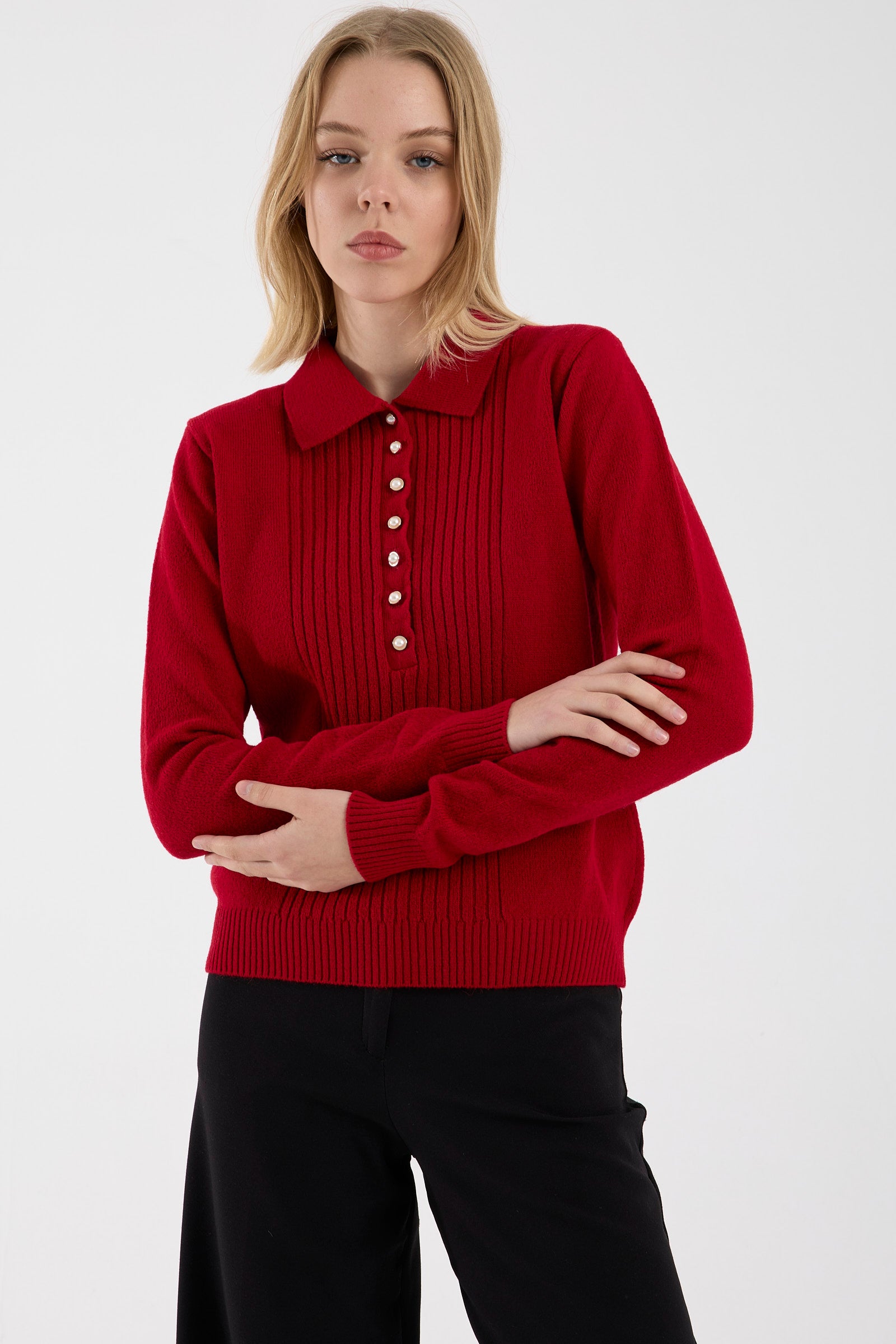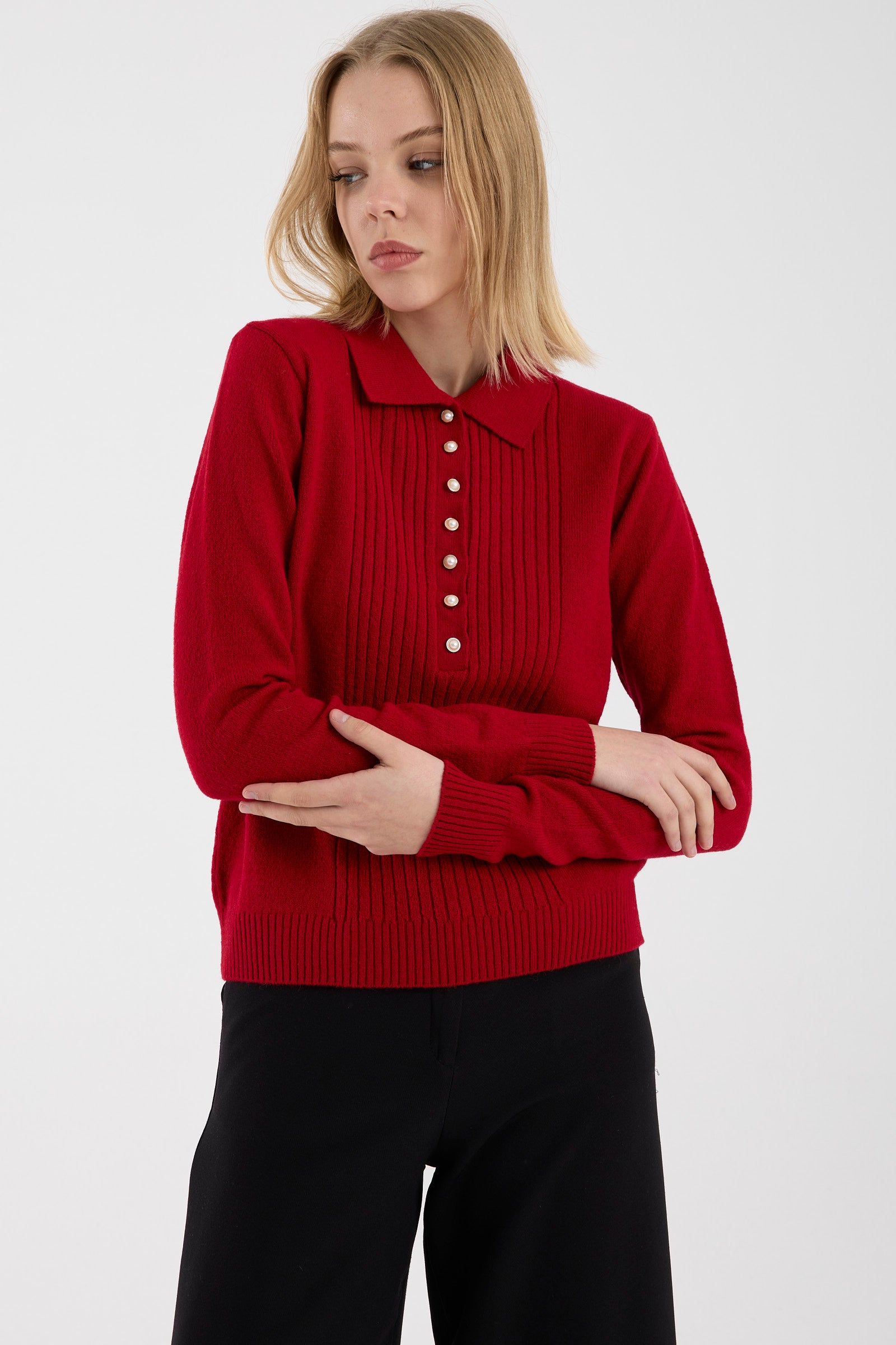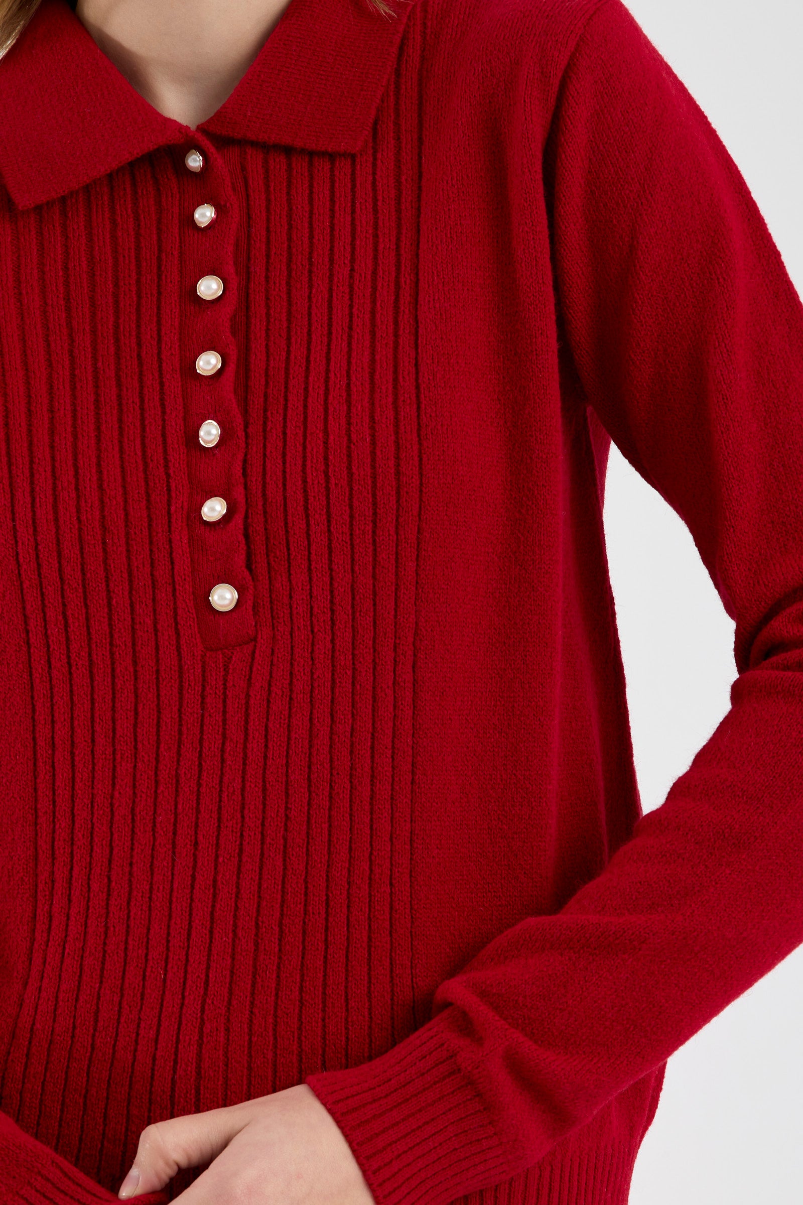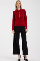 İnci Düğmeli Yakalı Triko Kazak - Kırmızı