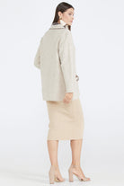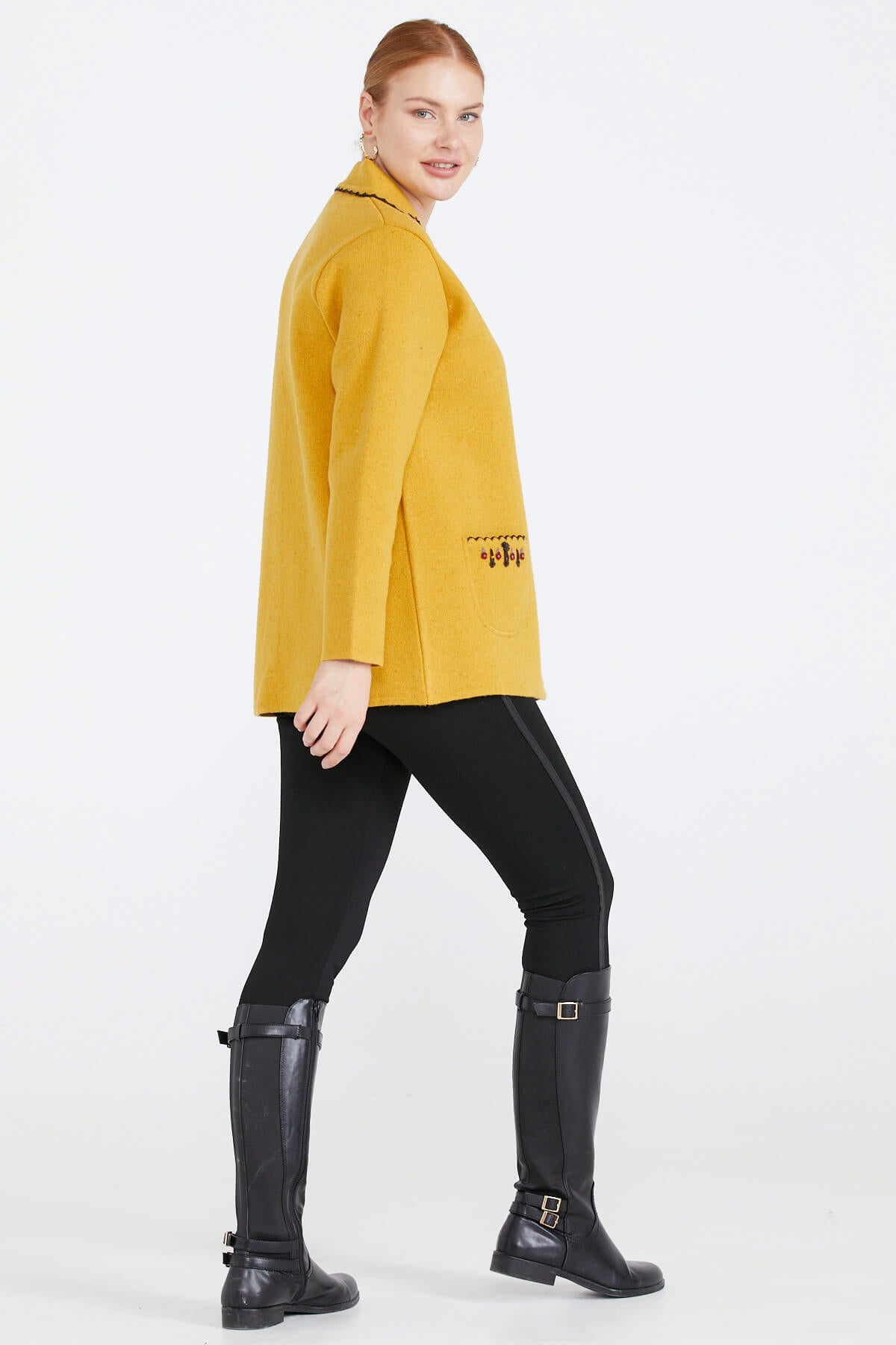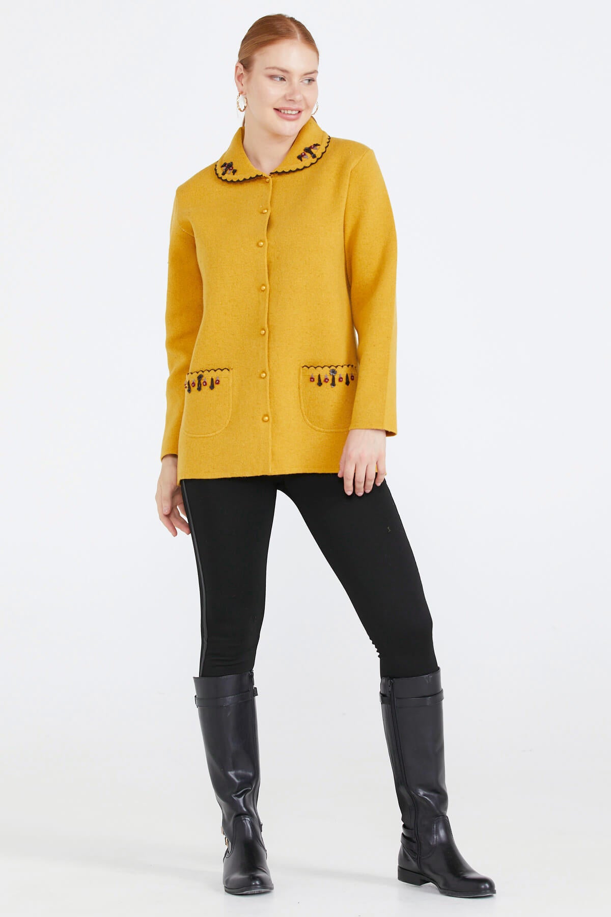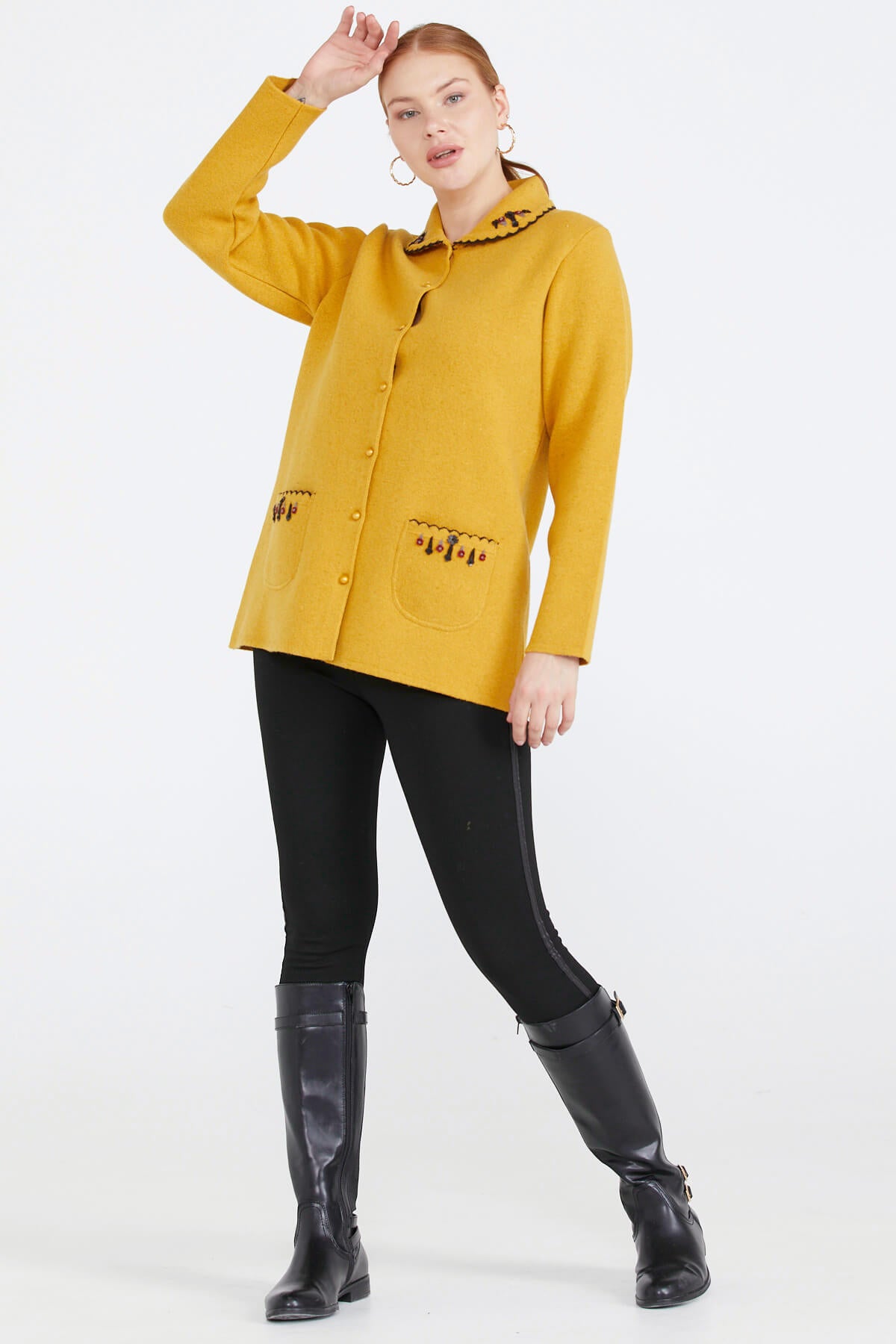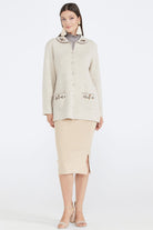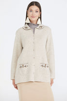 Women's Polo Neck Pockets Embroidered Knitwear Jacket - Light Beige