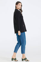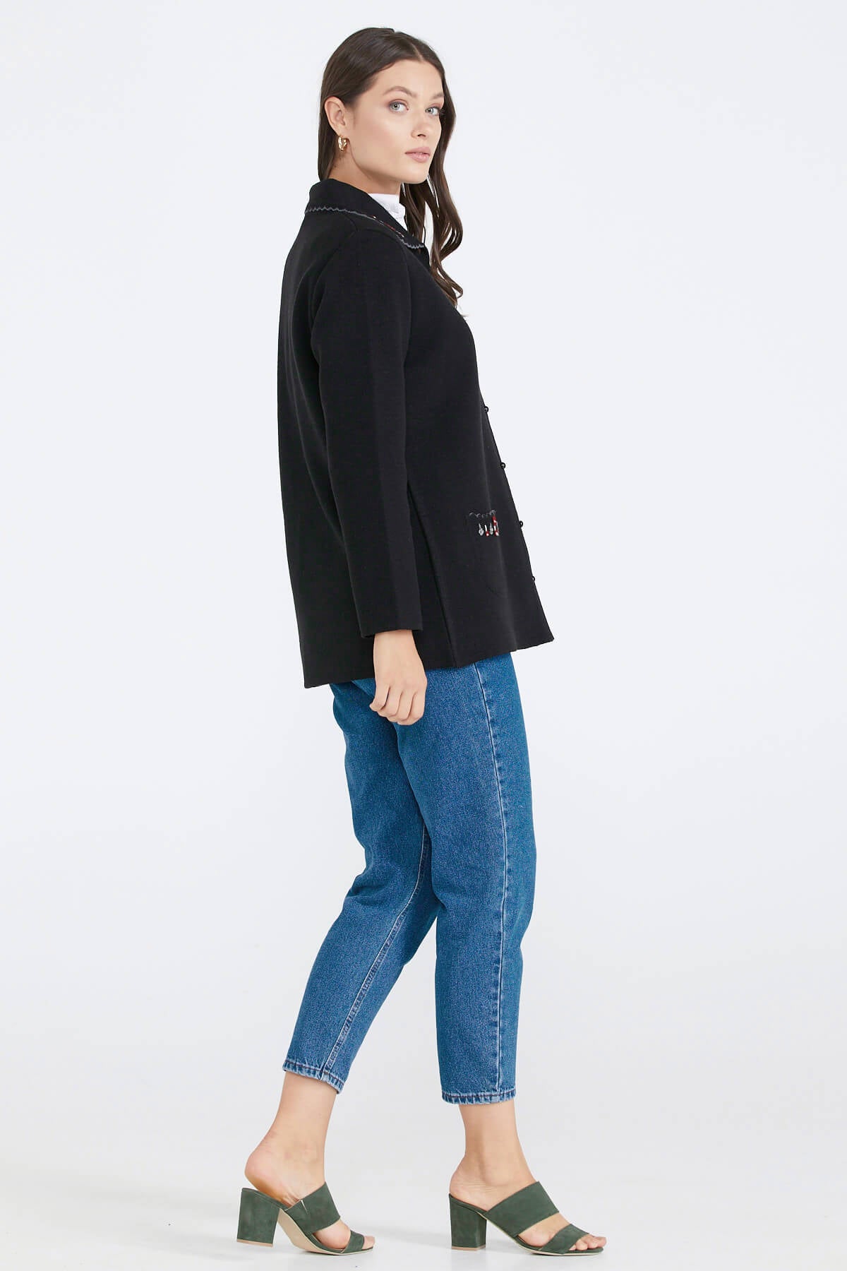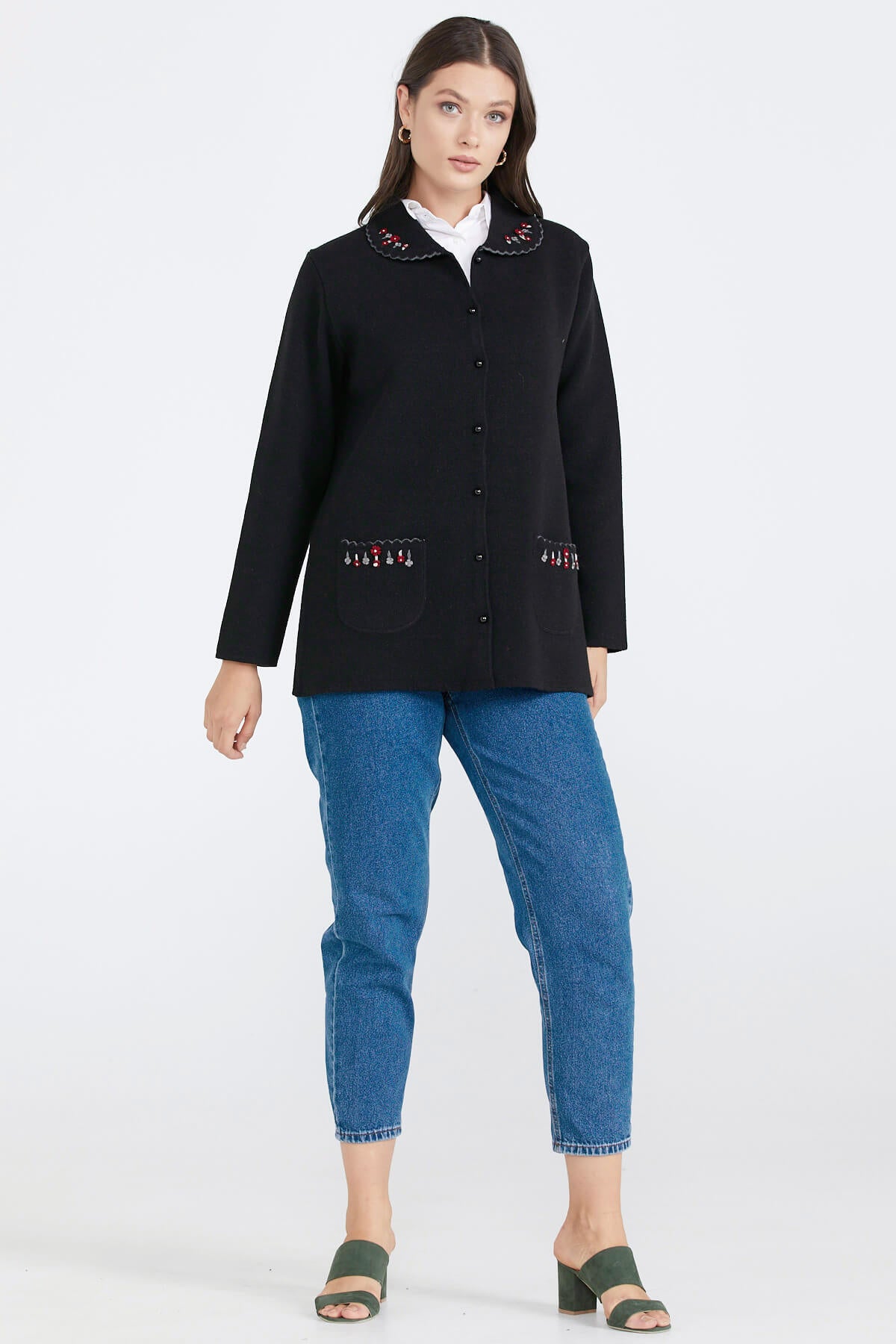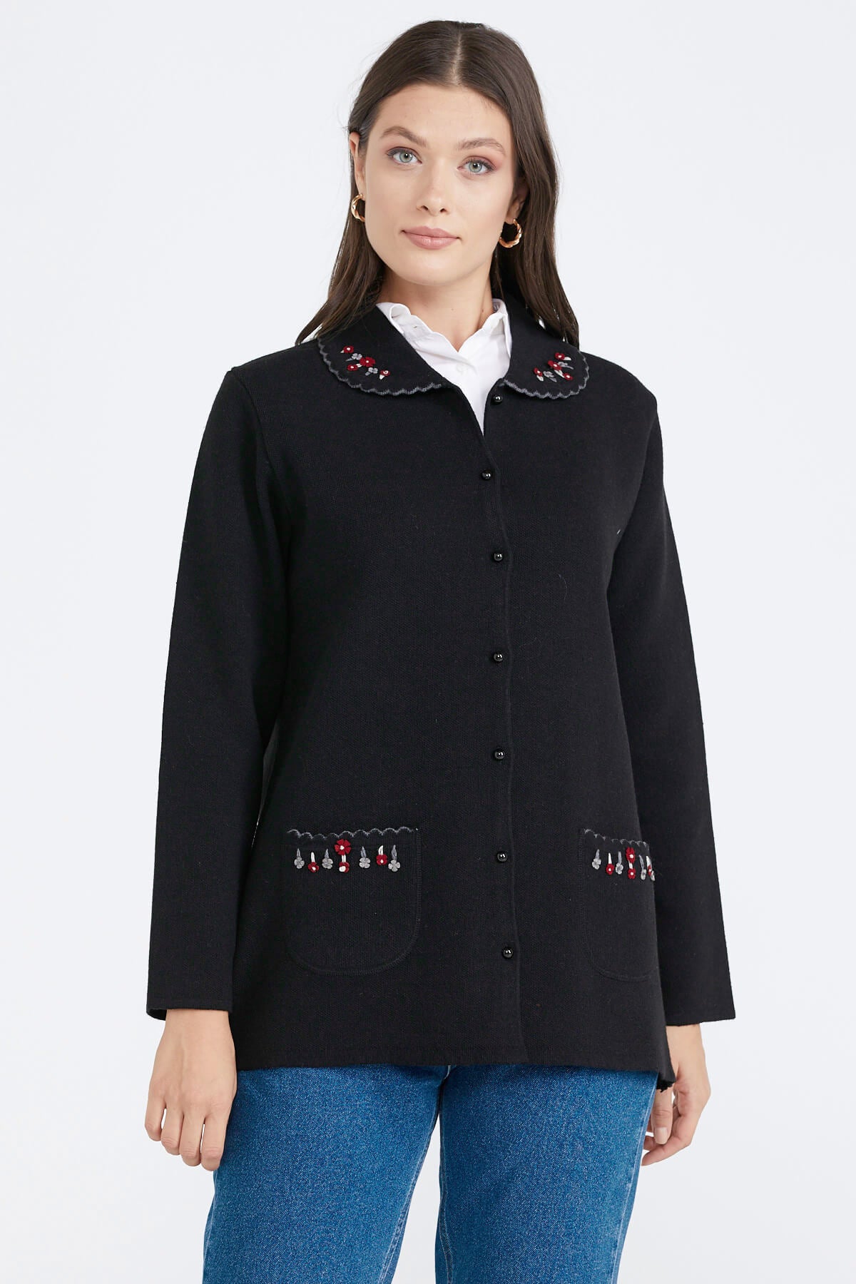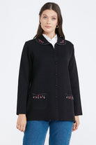 Women's Polo Neck Pocket Embroidered Knitwear Jacket - Black