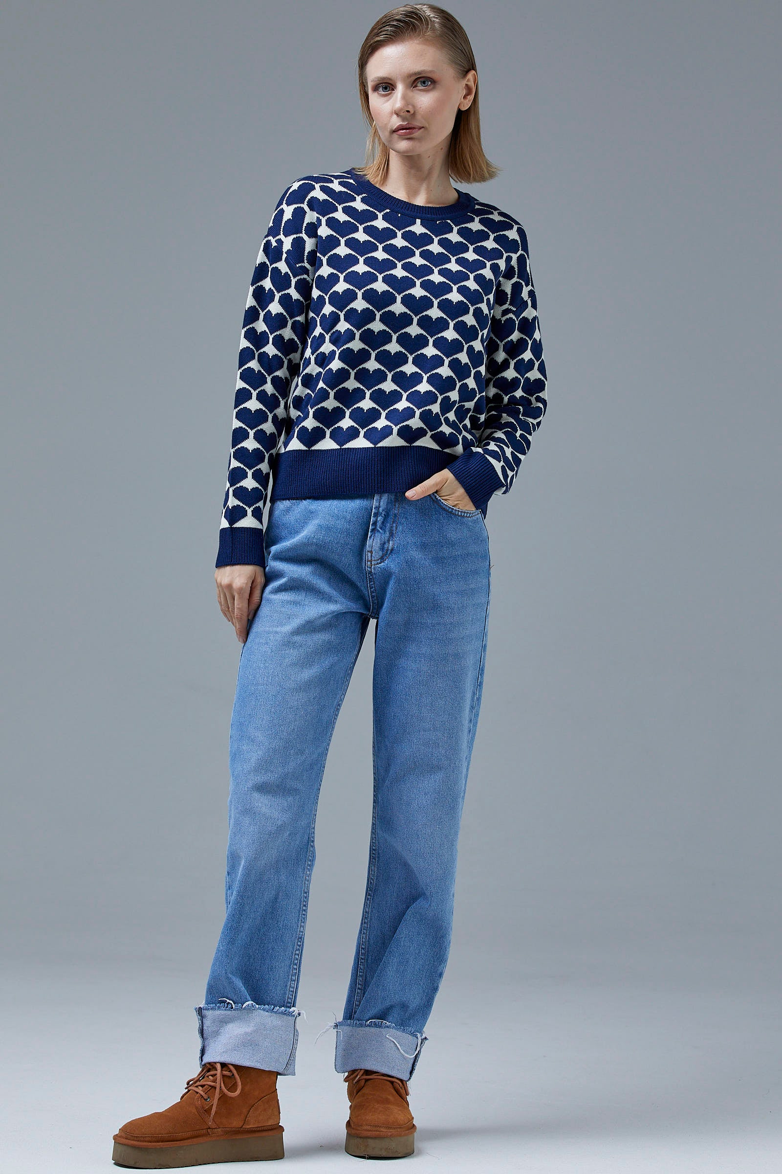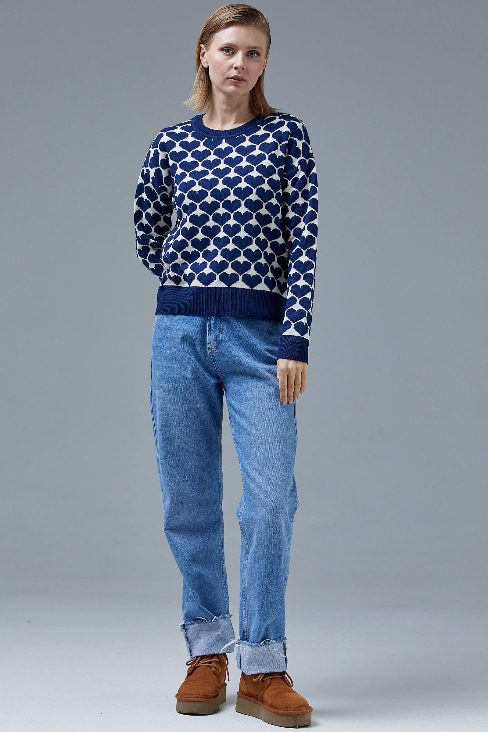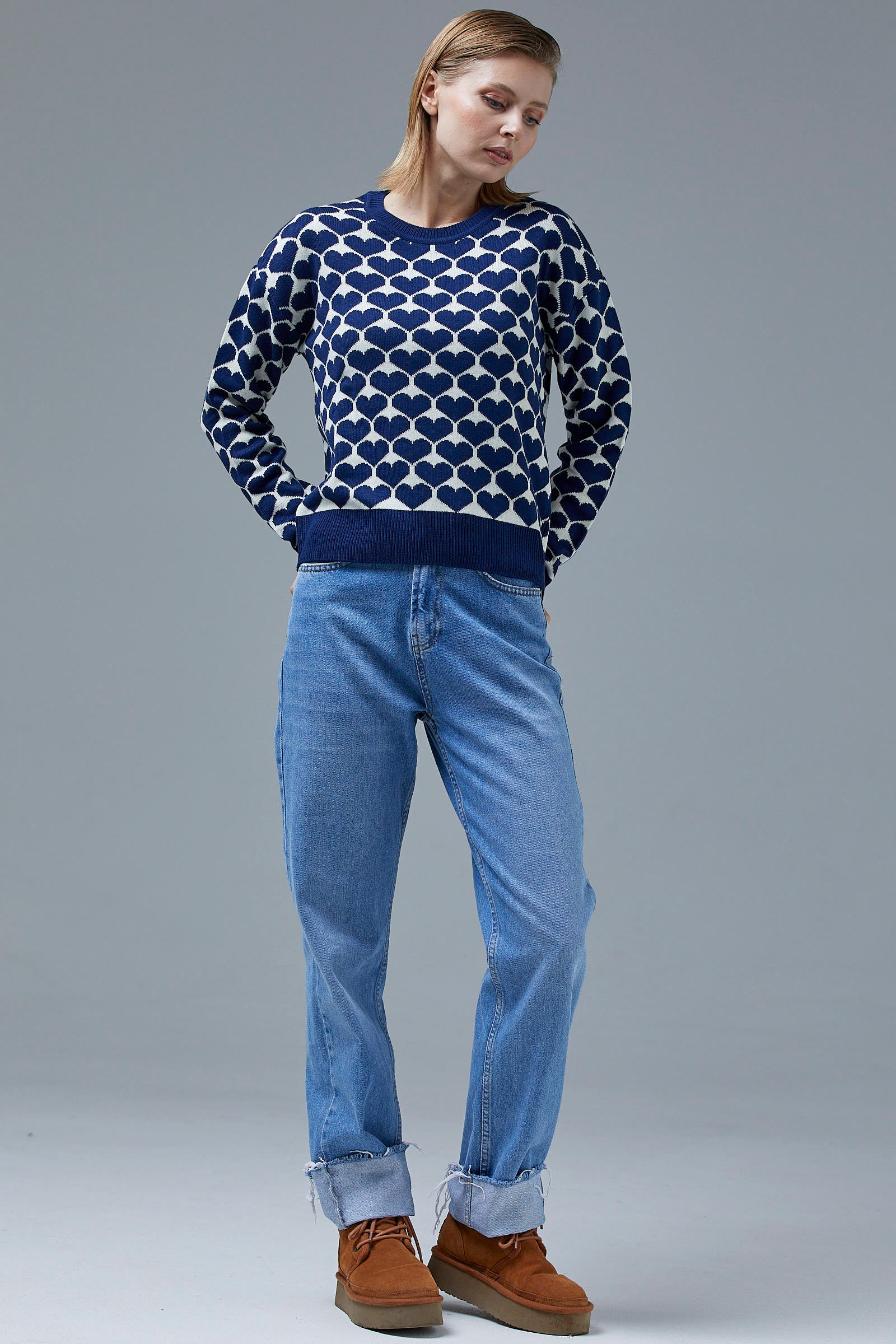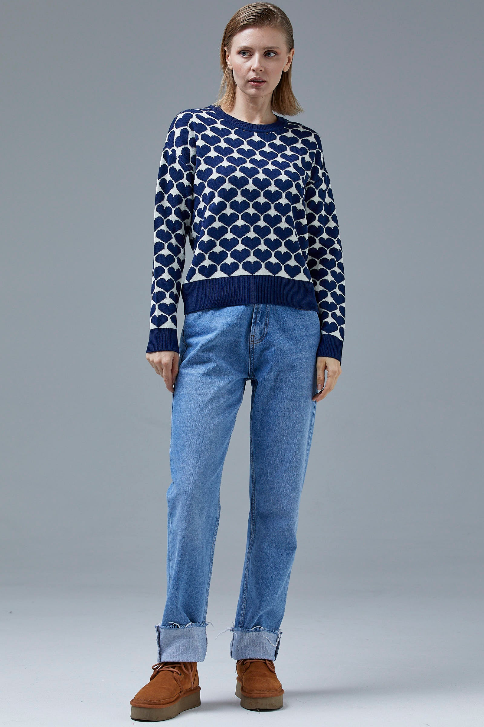 Heart Patterned Crew Neck Knitwear Sweater - Navy Blue