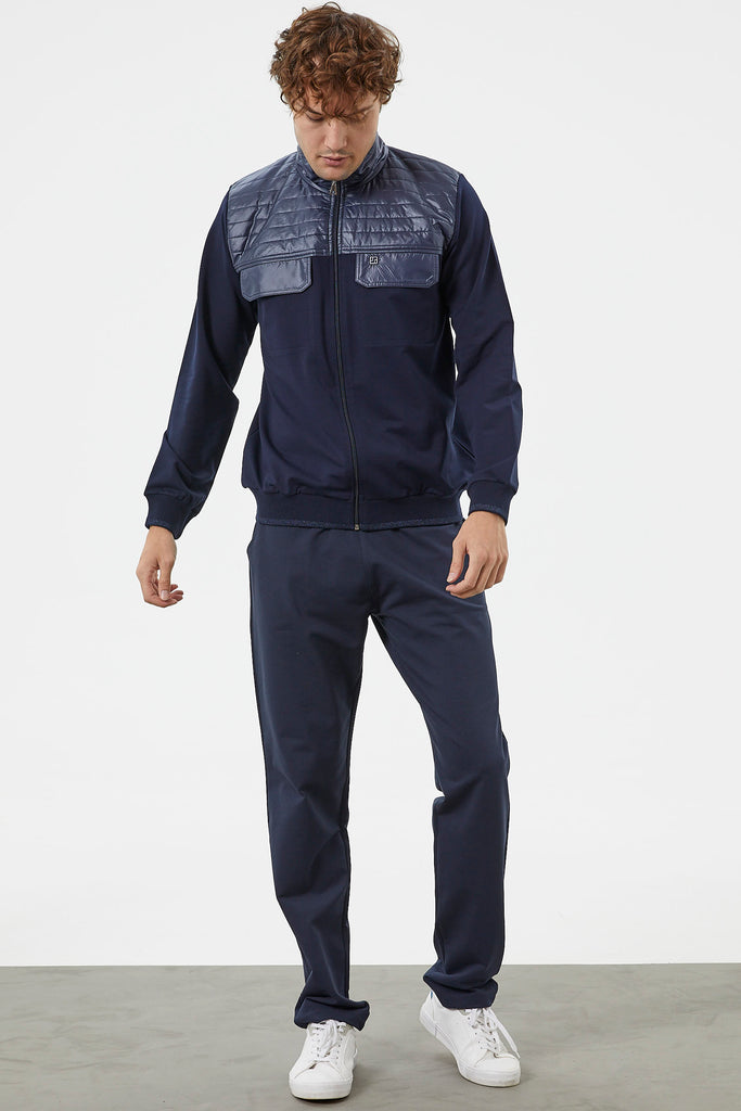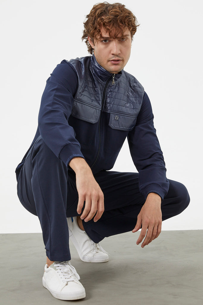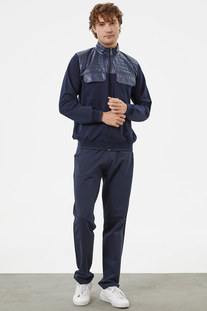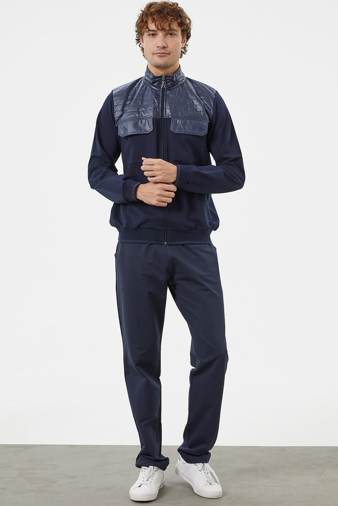 Quilted High Collar Zipper Tracksuit - Navy Blue