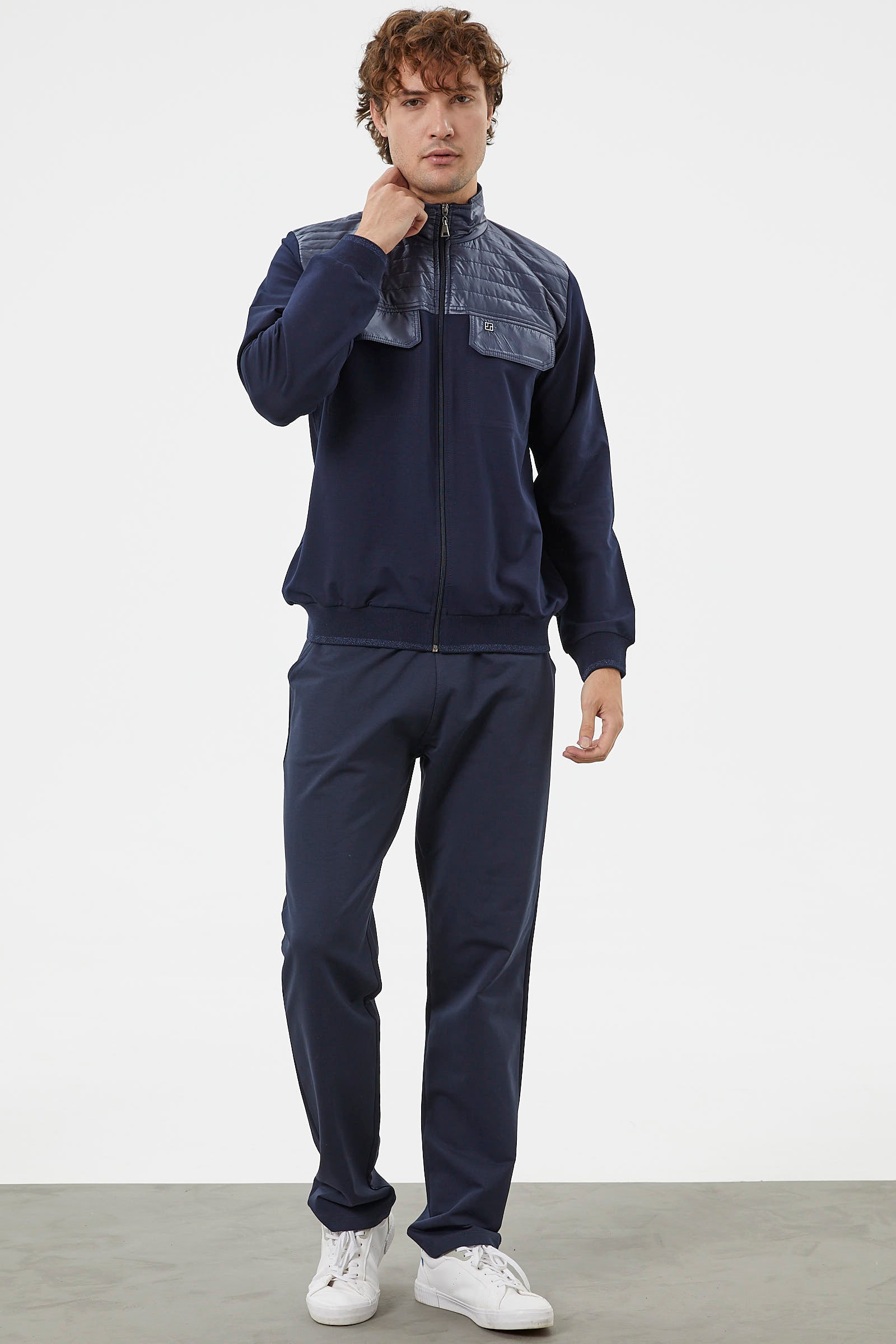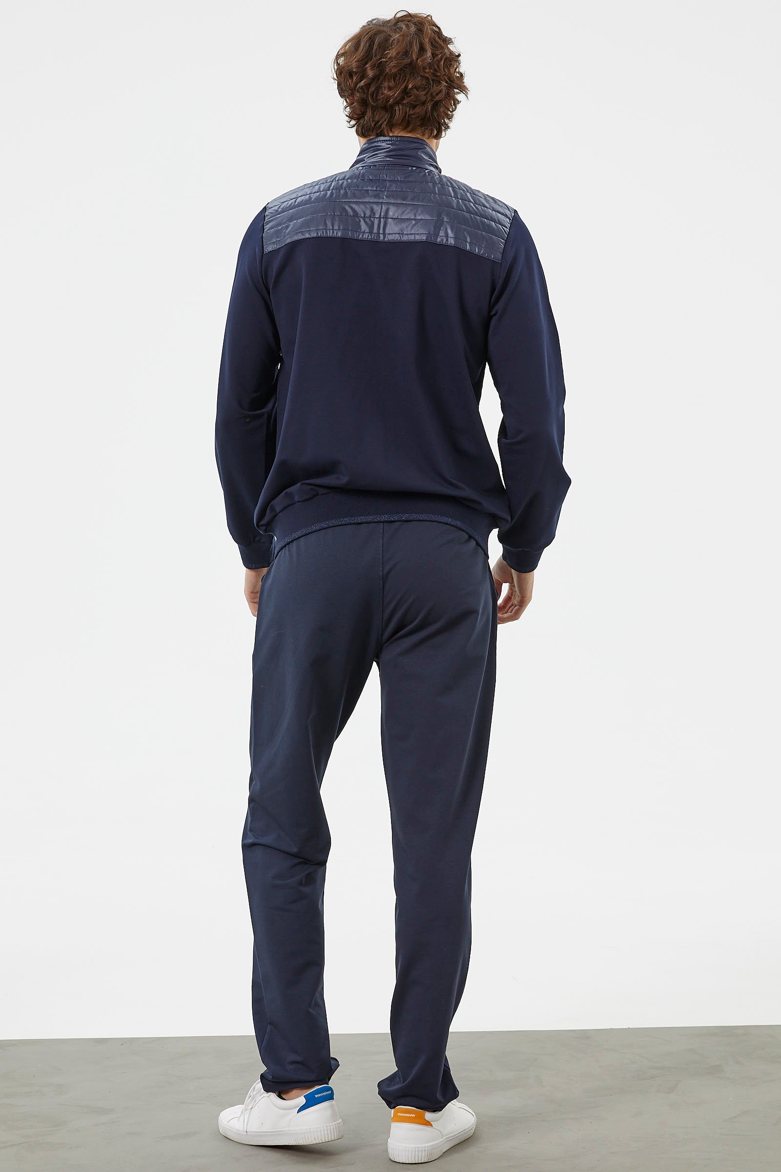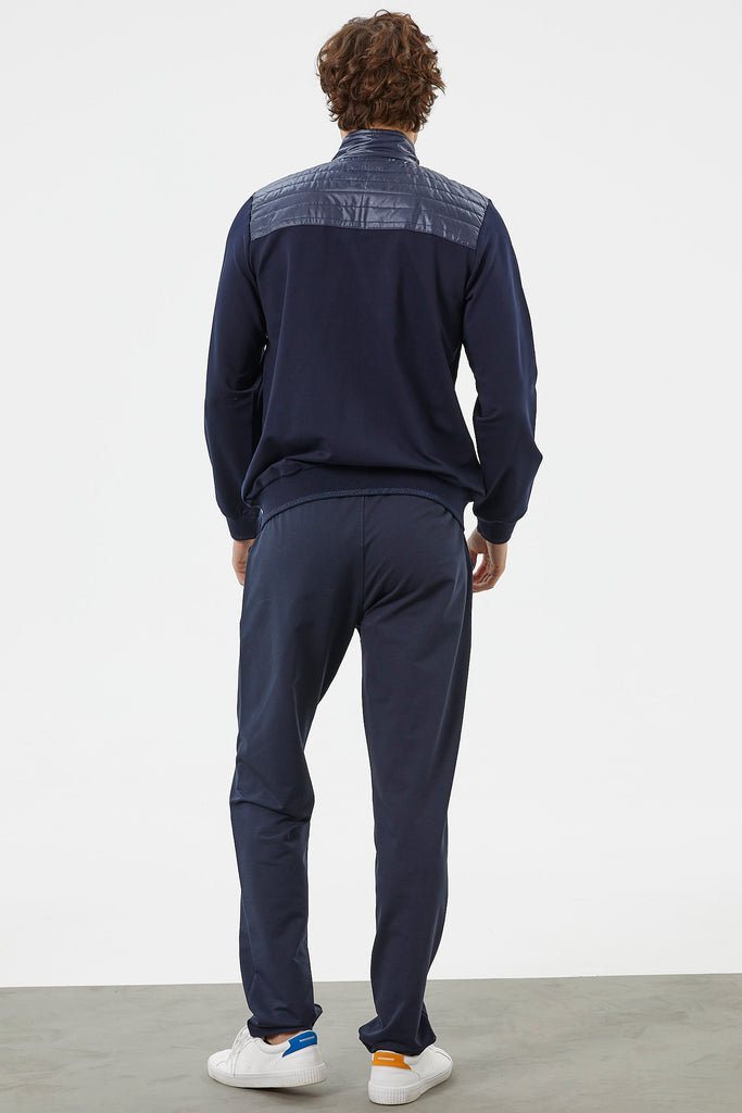 The tracksuit, designed with a stand-up collar, offering practical use with its zippered form, consisting of a top that stands out with its quilted fabric detail, and a bottom with pocket details, an elasticated waist and an adjustable drawstring, offers a comfortable style.